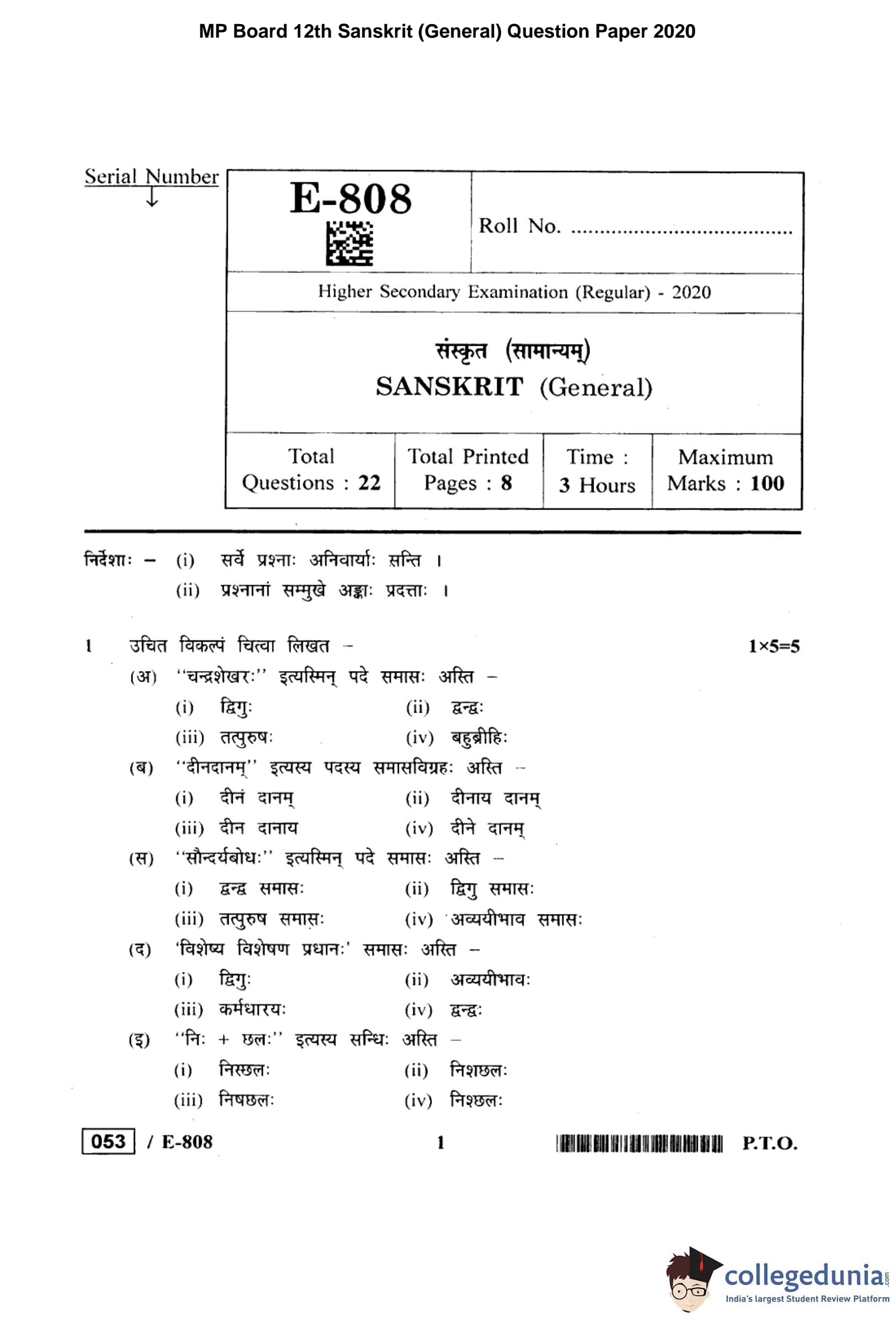 | MP Board 12th Sanskrit (General) Question Paper 2020 PDF | MP Board 12th Sanskrit (General) Answer Key 2020 PDF |