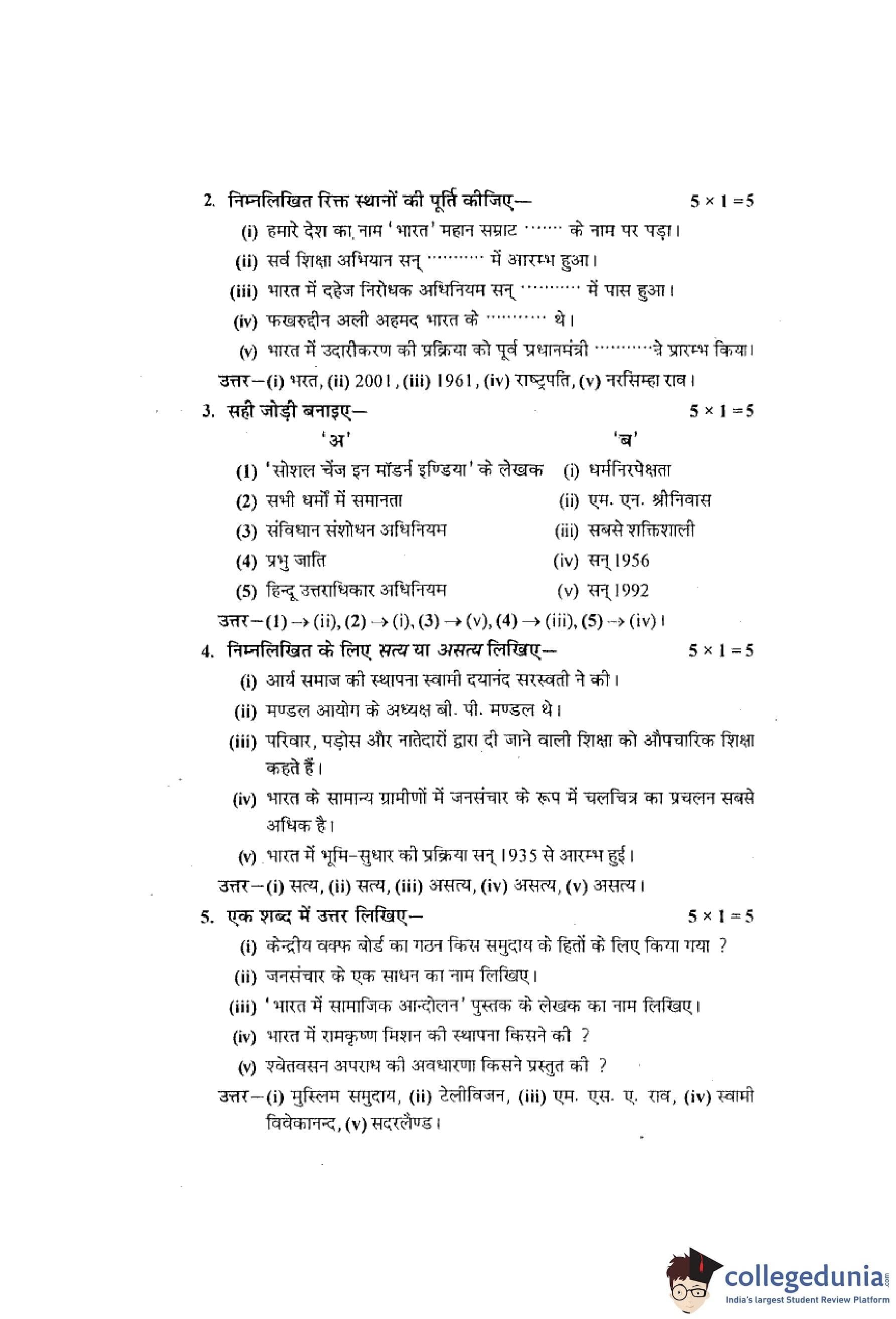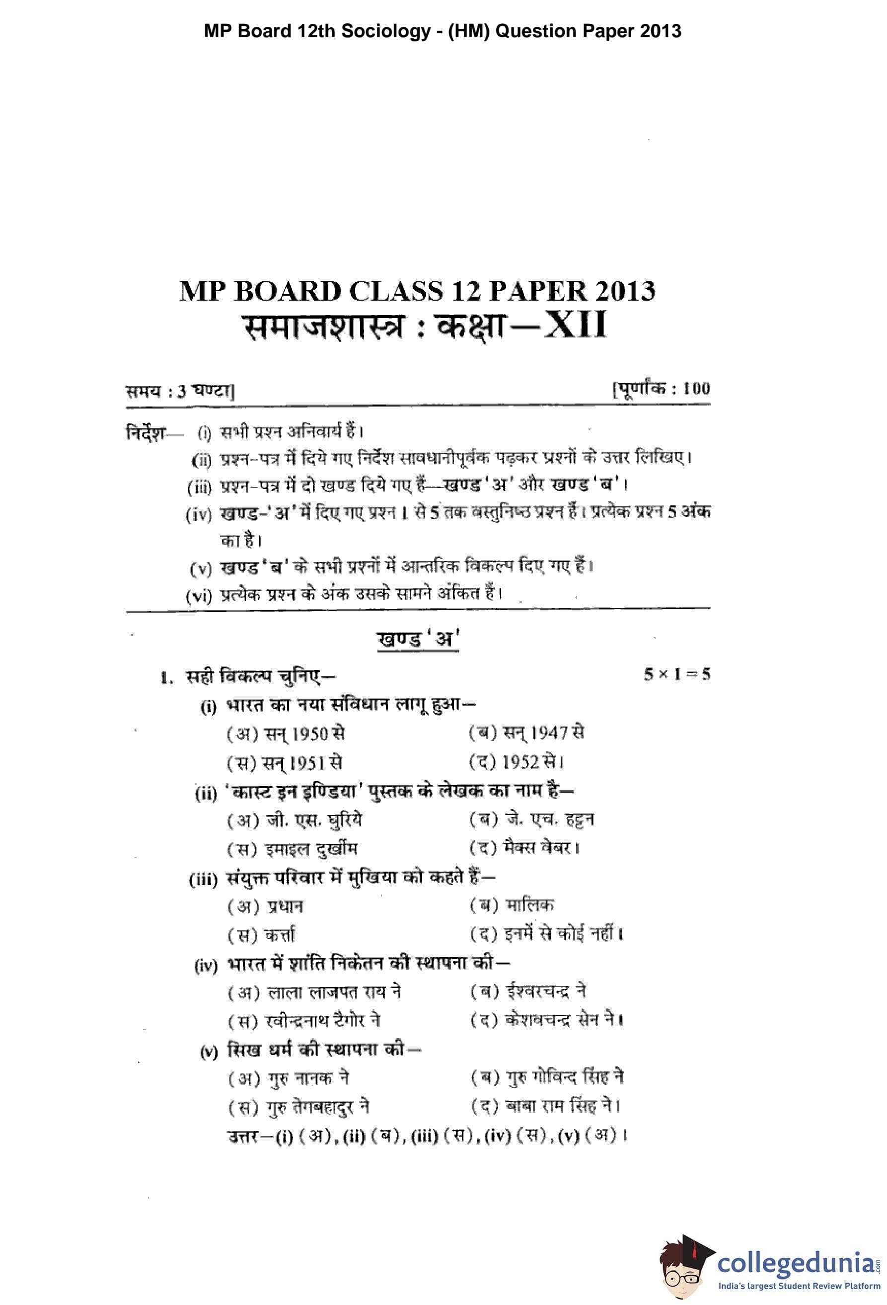 MP Board 12th Sociology Hindi Question Paper 2013 with Answer Key