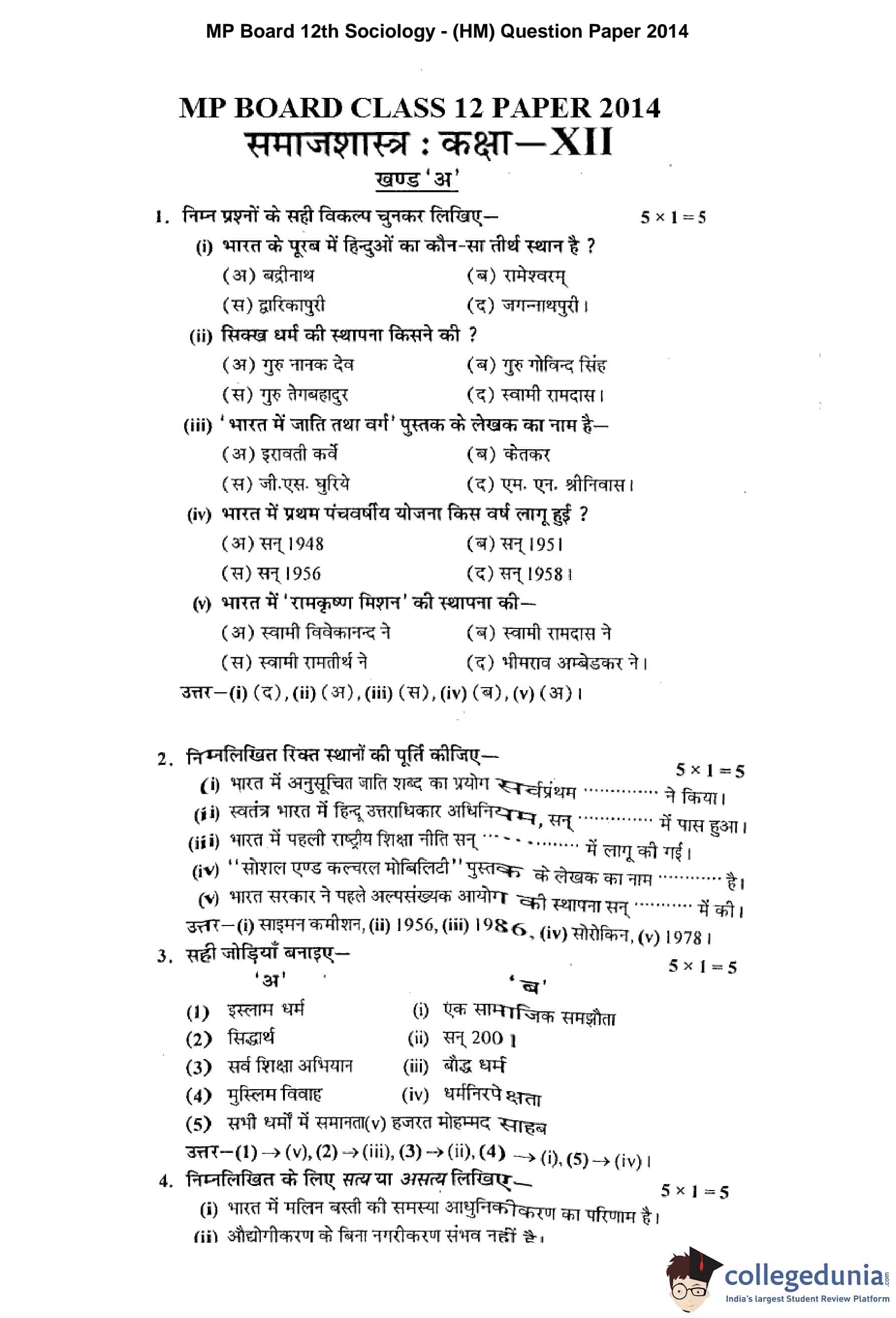 | MP Board 12th Sociology Question Paper 2014 PDF | MP Board 12th Sociology Answer Key 2014 PDF |