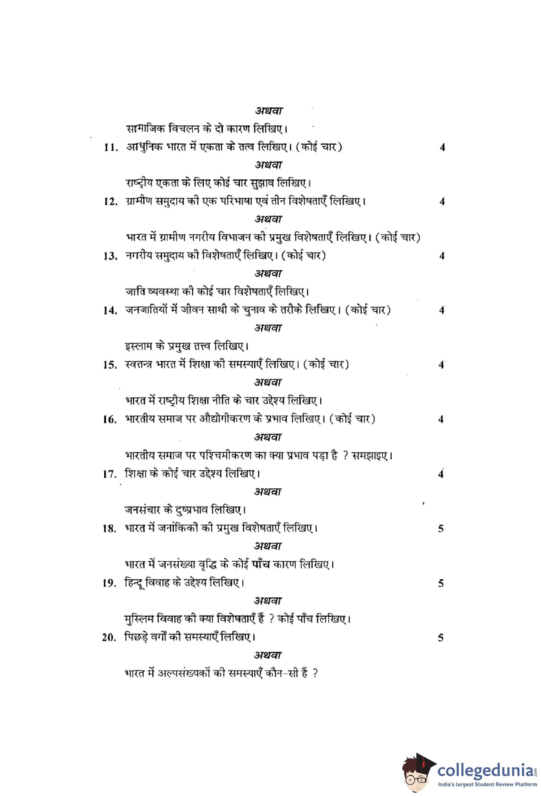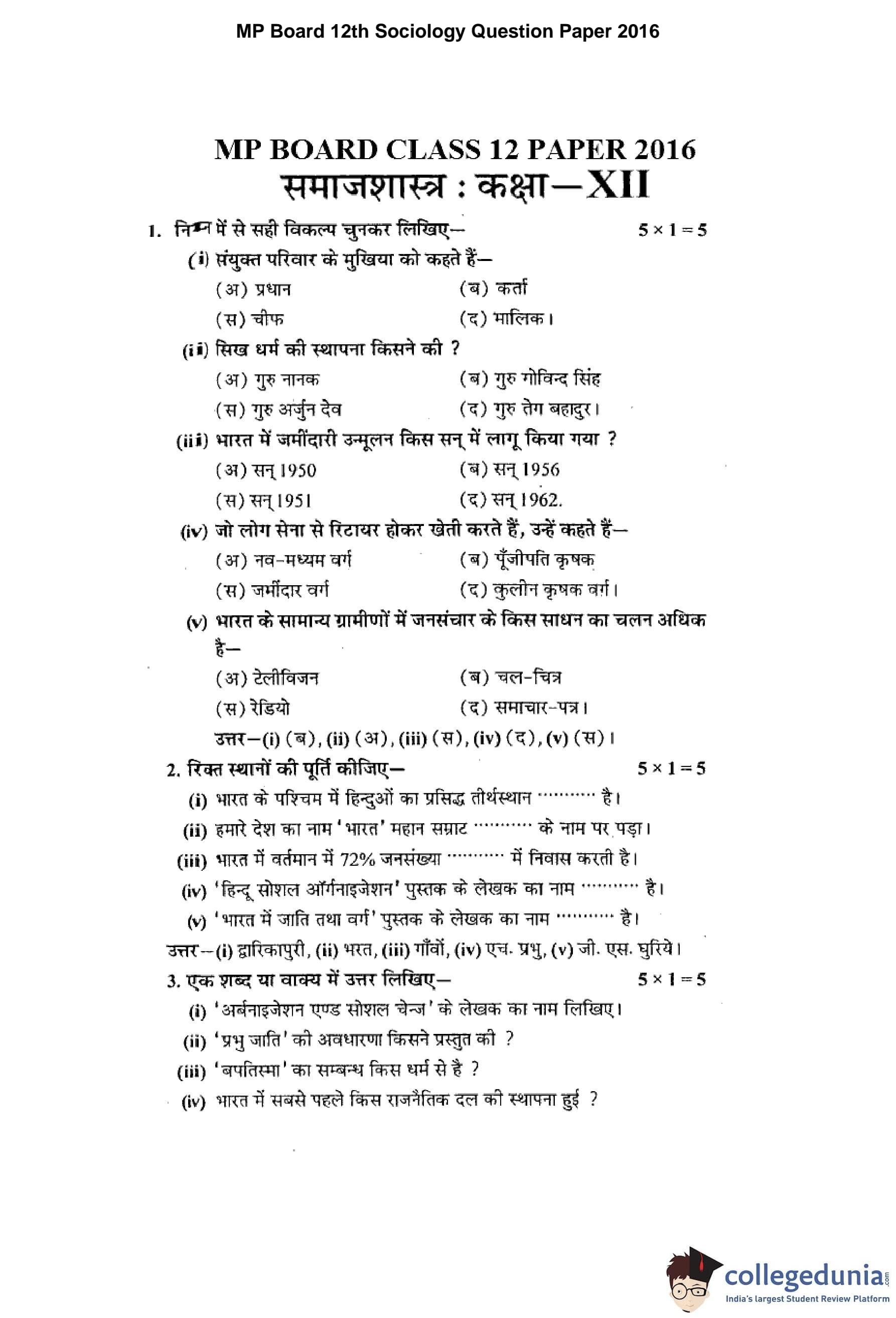 MP Board 12th Sociology Question Paper 2016 with Answer Key