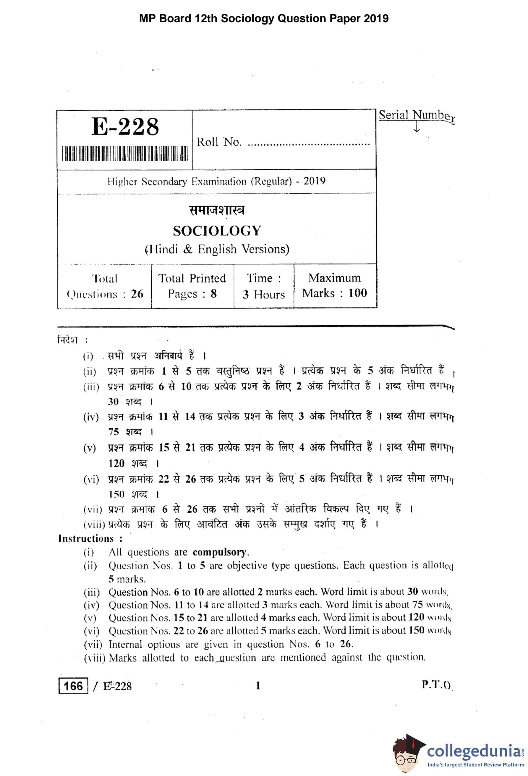 MP Board 12th Sociology Question Paper 2019 with Answer Key pdf is available for download here. The exam was conducted by Madhya Pradesh Board of Secondary Education, MPBSE on April 1, 2019 in the Morning Session 9 AM to 12 PM. The question paper comprised a total of 26 questions.