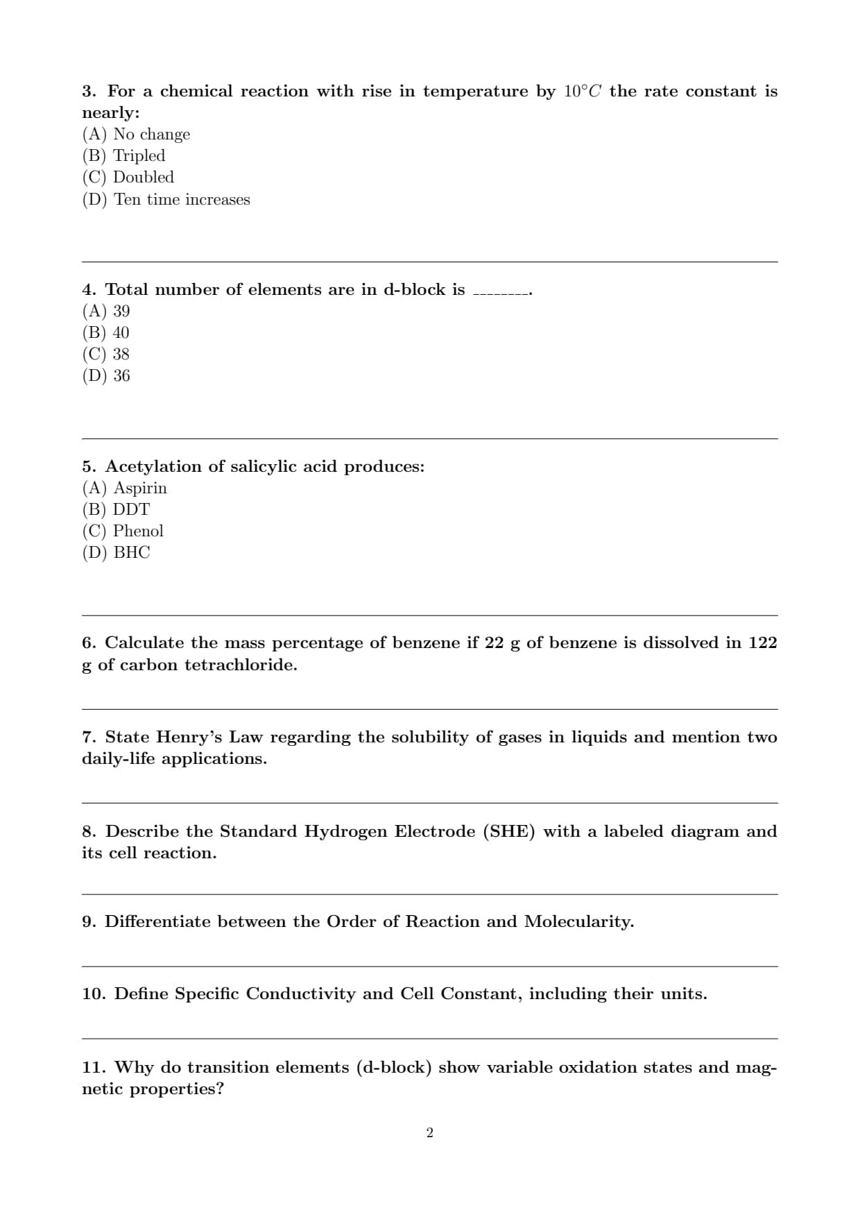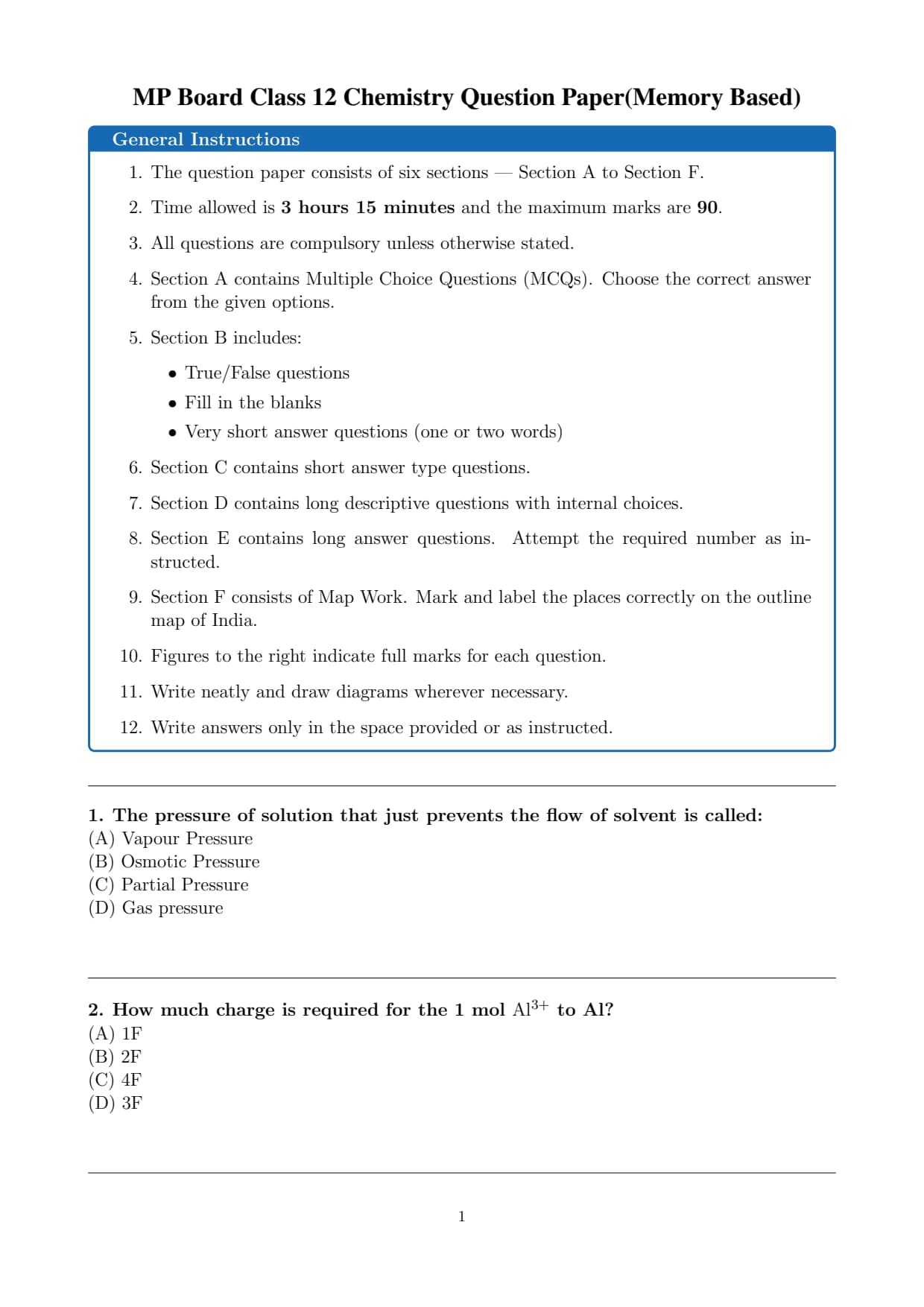 The official question paper of MP Board Class 12 Chemistry Board Exam 2026 is provided below. Students can download the official paper in PDF format for reference.