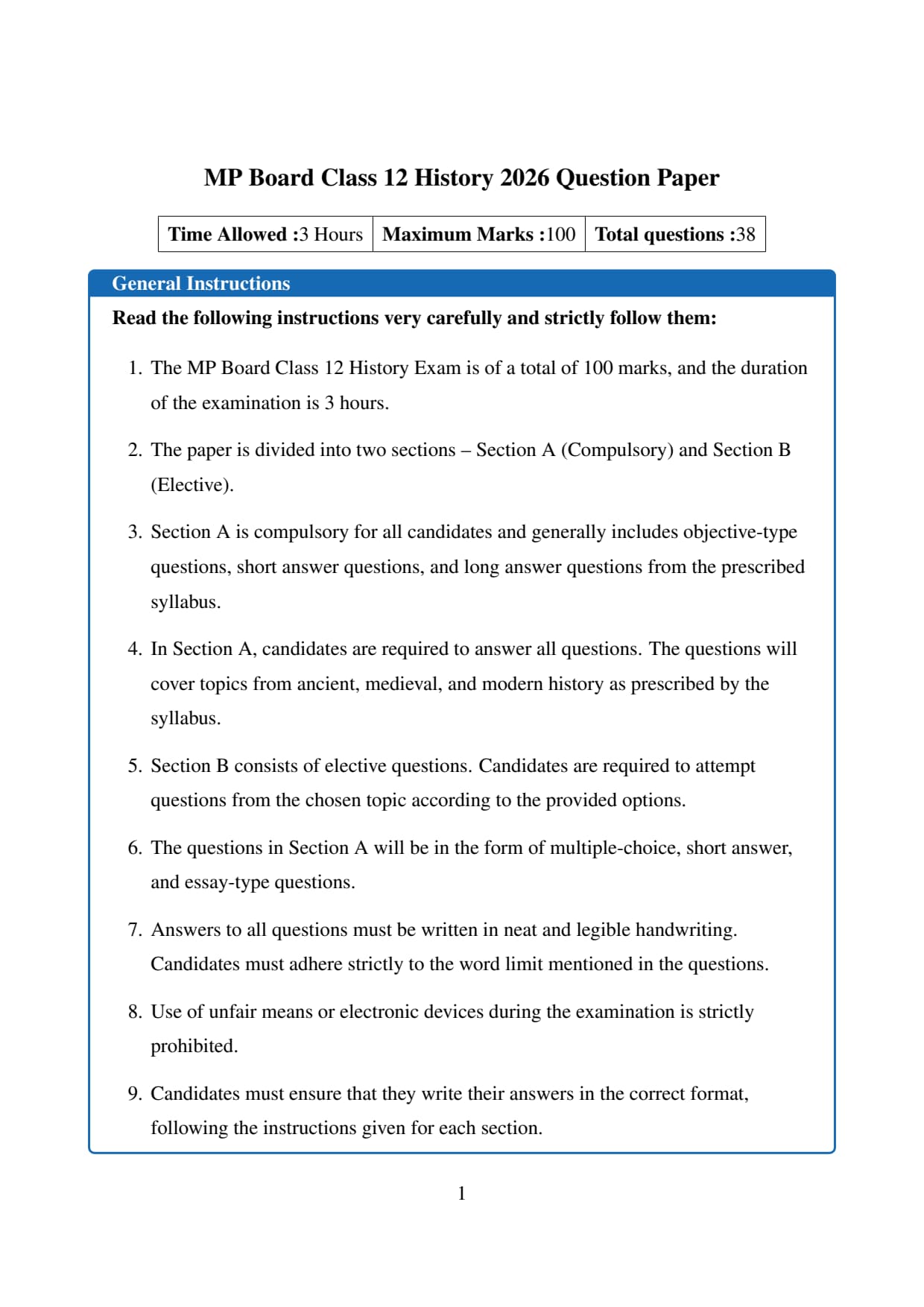 The official question paper of MP Board Class 12 History Board Exam 2026 is provided below. Students can download the official paper in PDF format for reference.