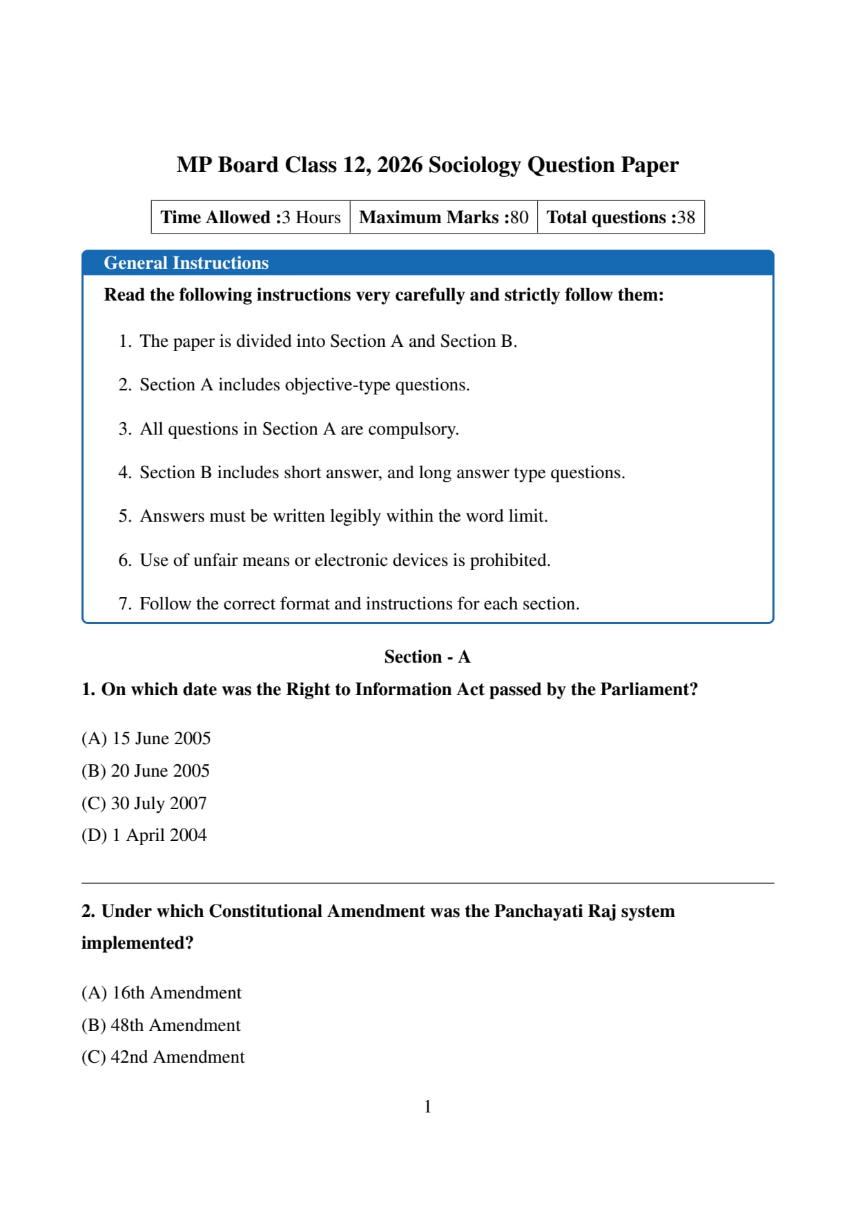 The official question paper of MP Board Class 12 Sociology Board Exam 2026 is provided below. Students can download the official paper in PDF format for reference.