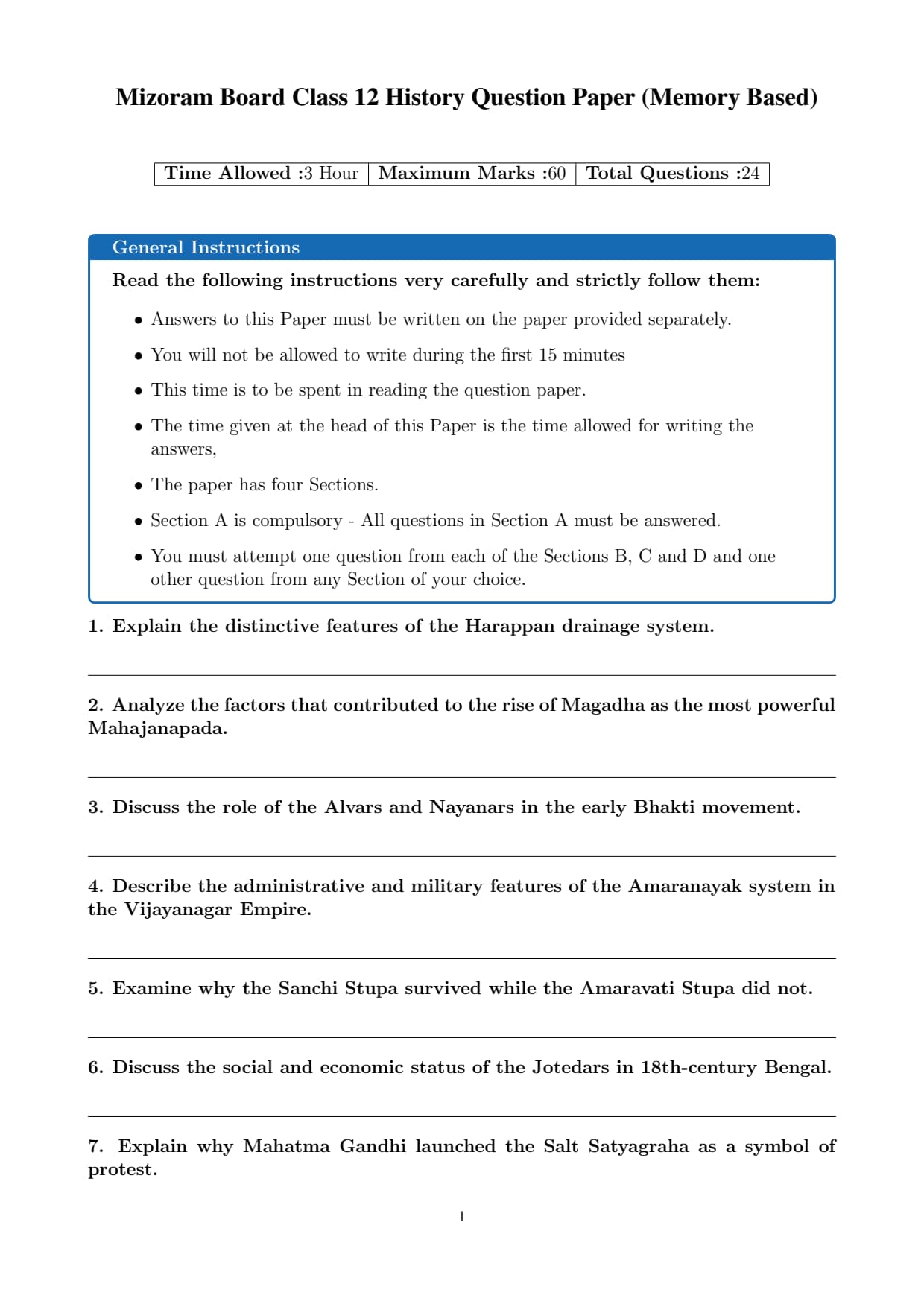 | Mizoram Board 2026 Class 12 History Question Paper with Solutions PDF | Download PDF | Check Solutions |