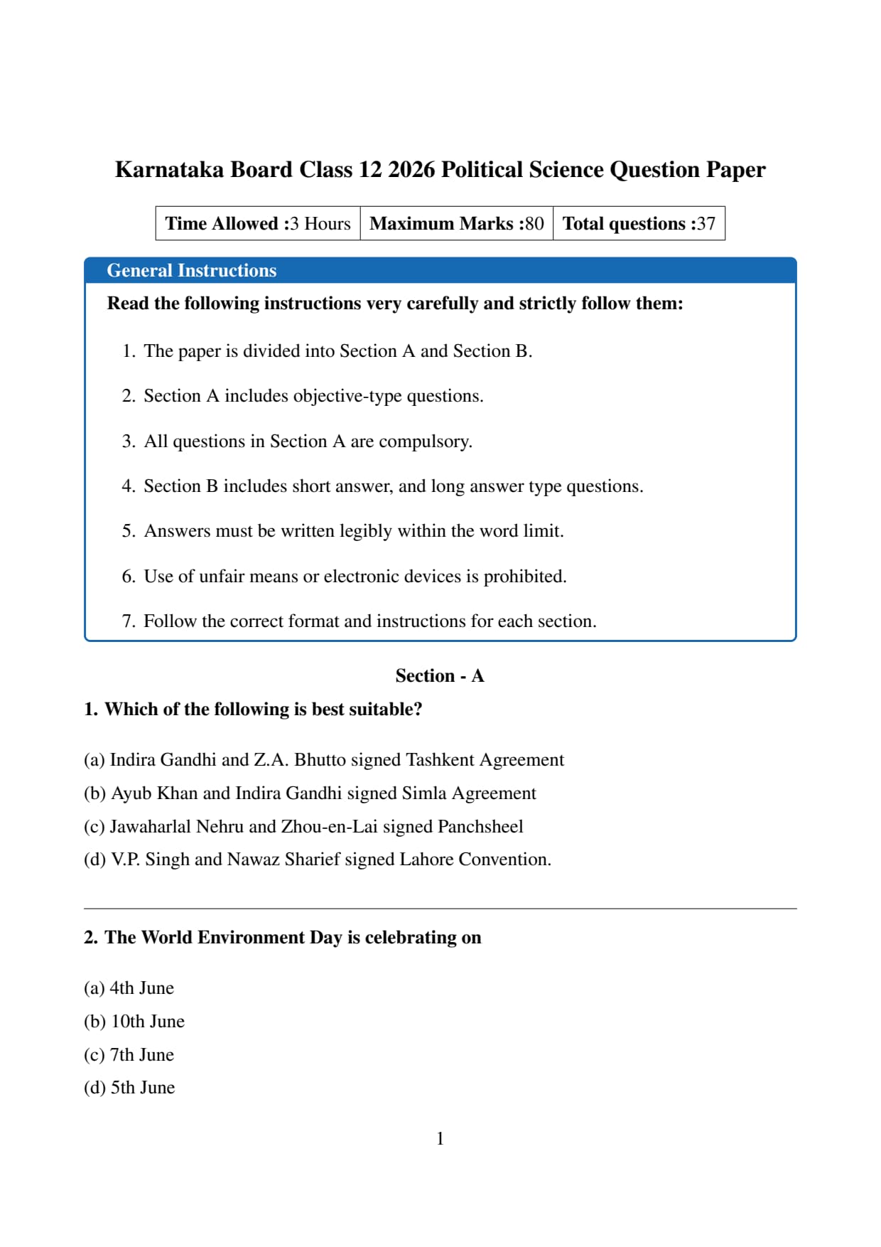 | Karnataka Class 12 Political Science Question Paper 2026 | Download PDF | Check Solution |