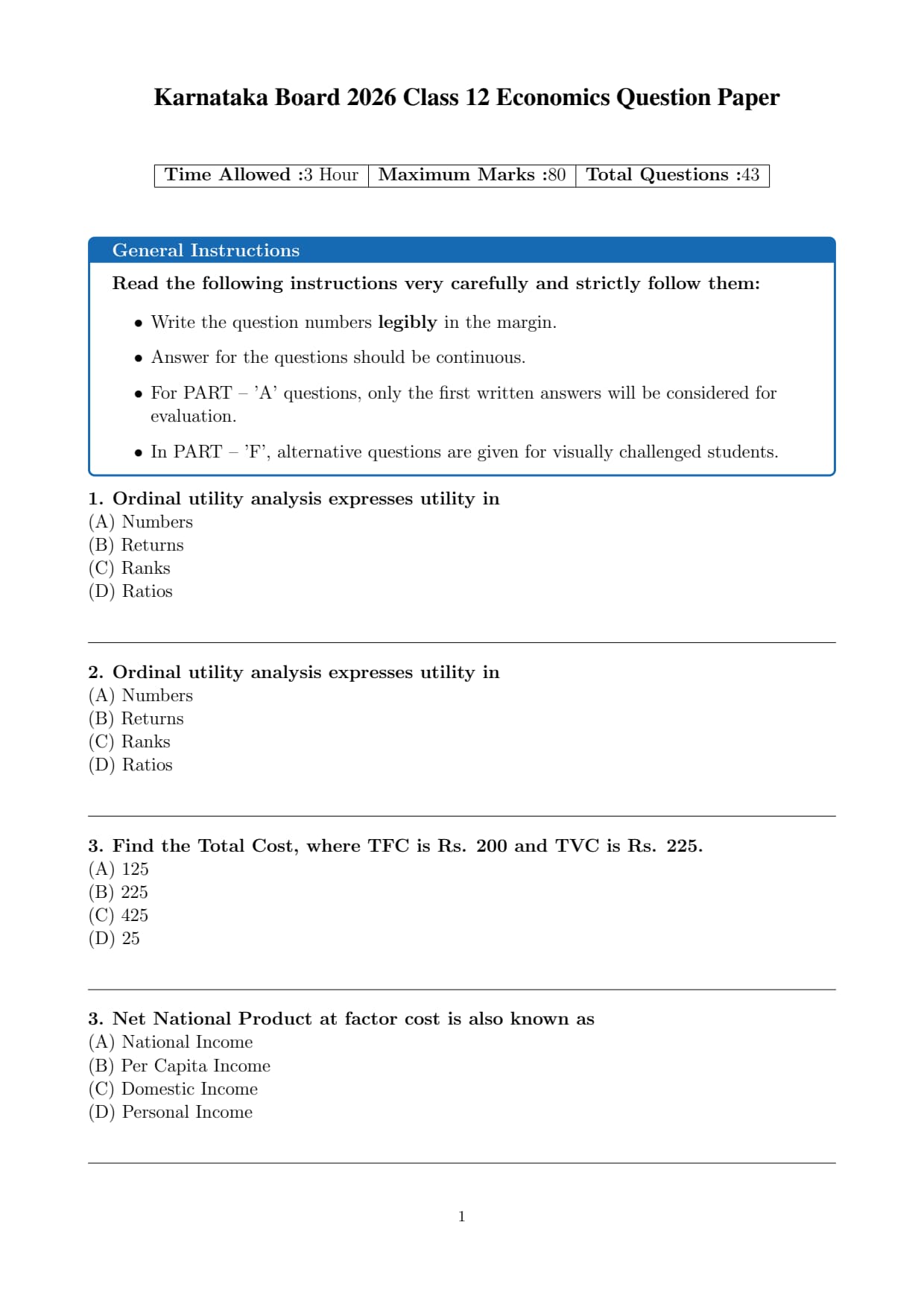 The official question paper of Karnataka Board Class 12 Economics Board Exam 2026 is provided below. Students can download the official paper in PDF format for reference.
