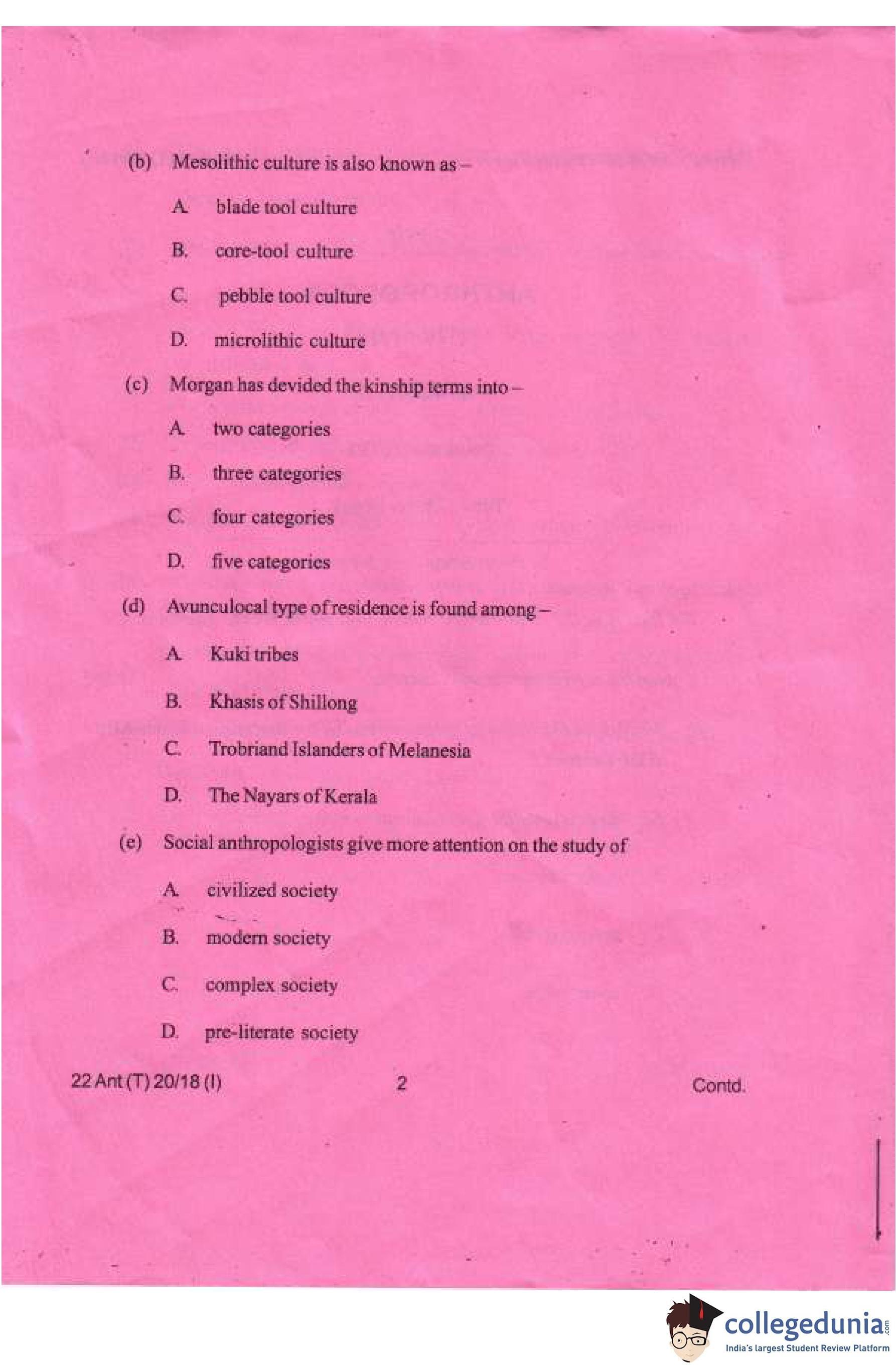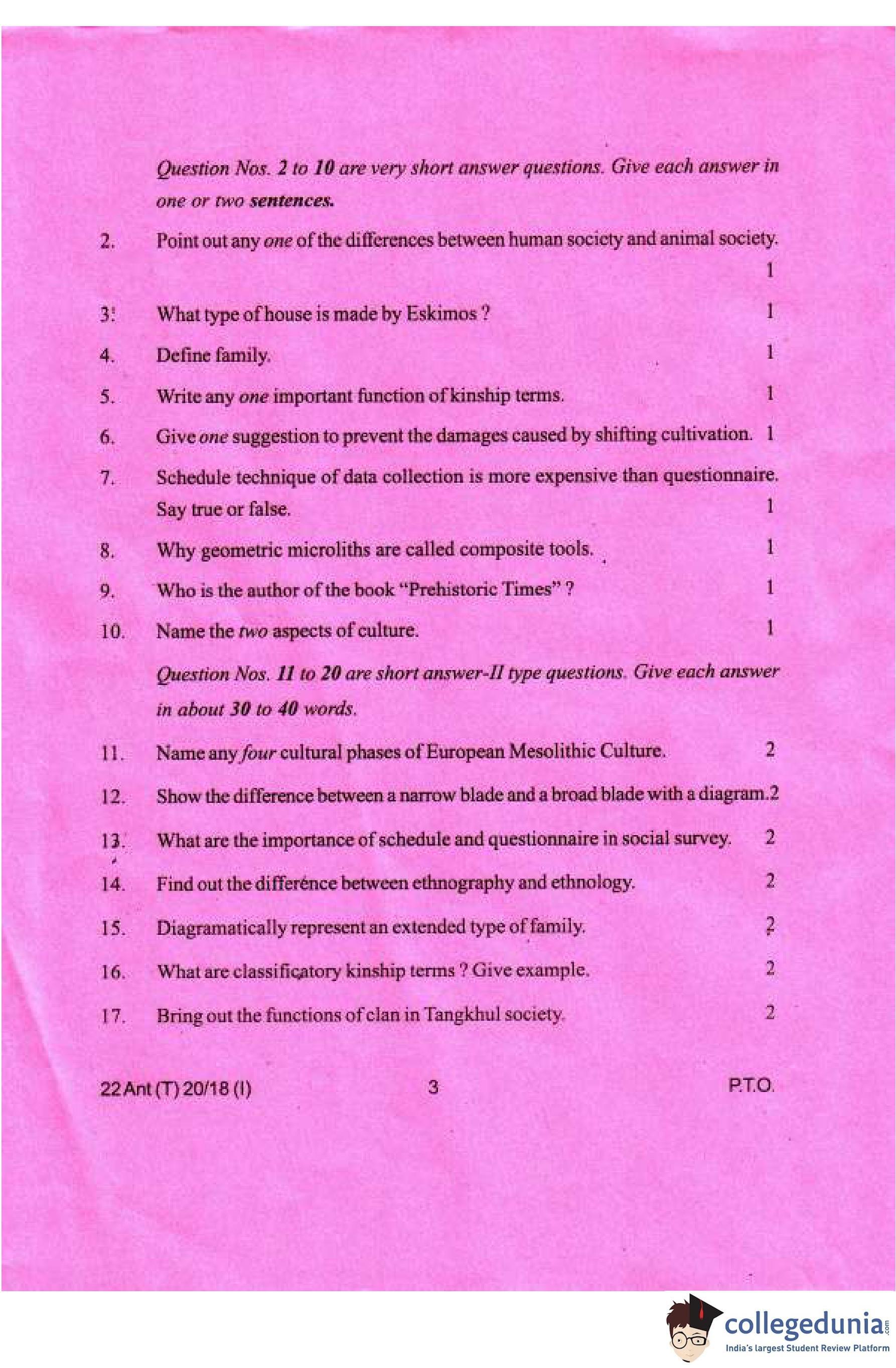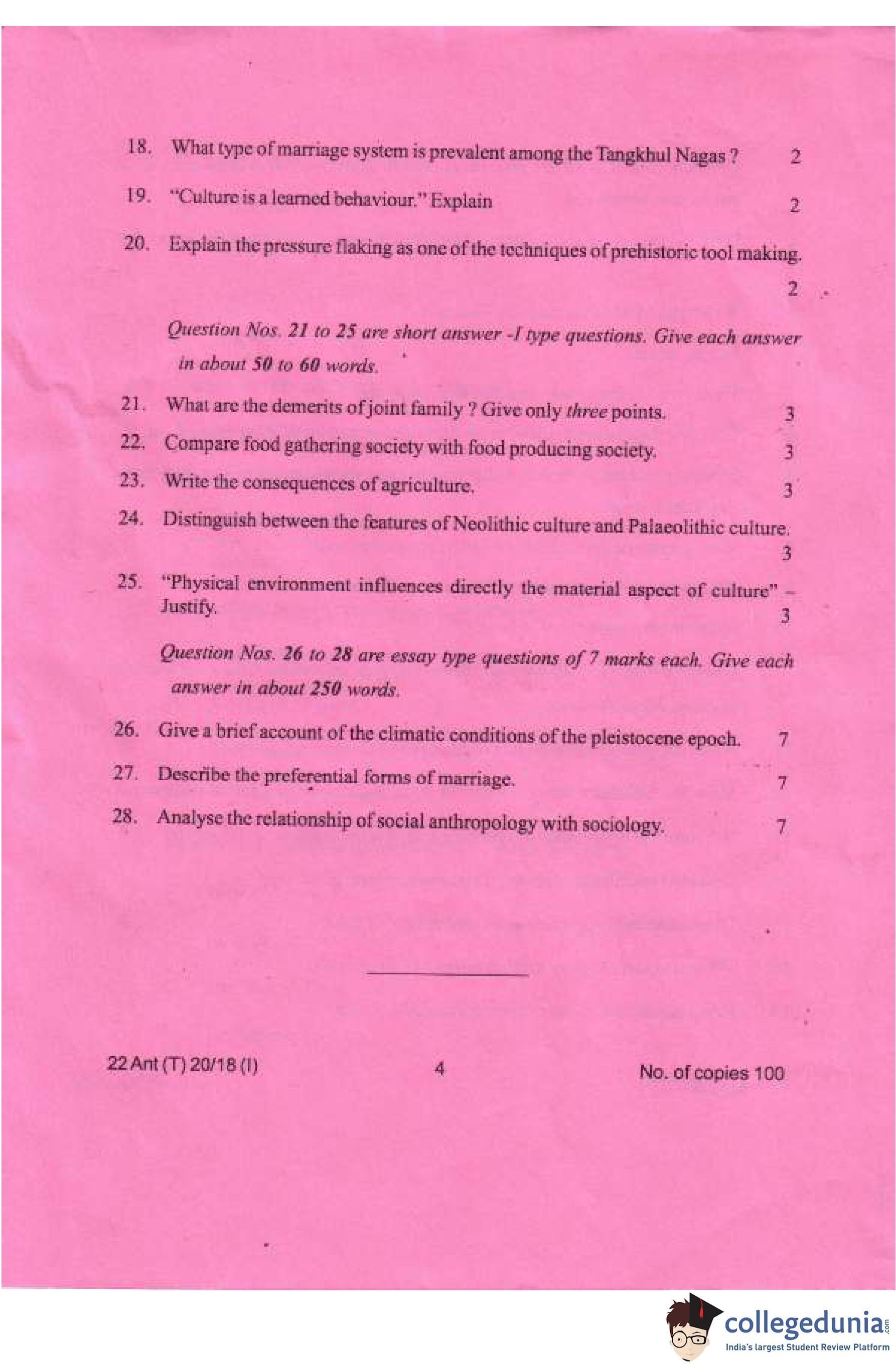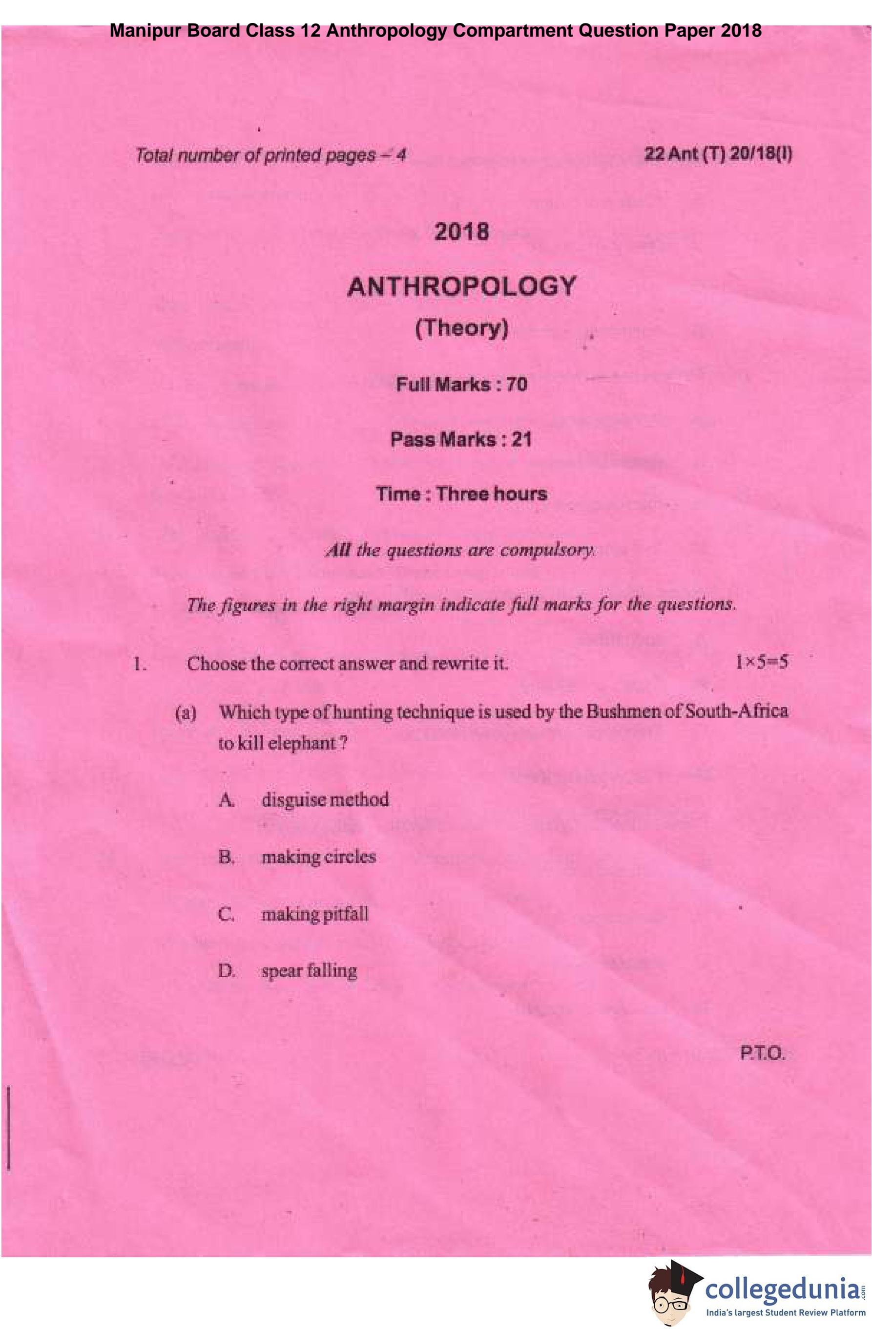 Manipur Board Class 12 Anthropology Compartment Question Paper 2018