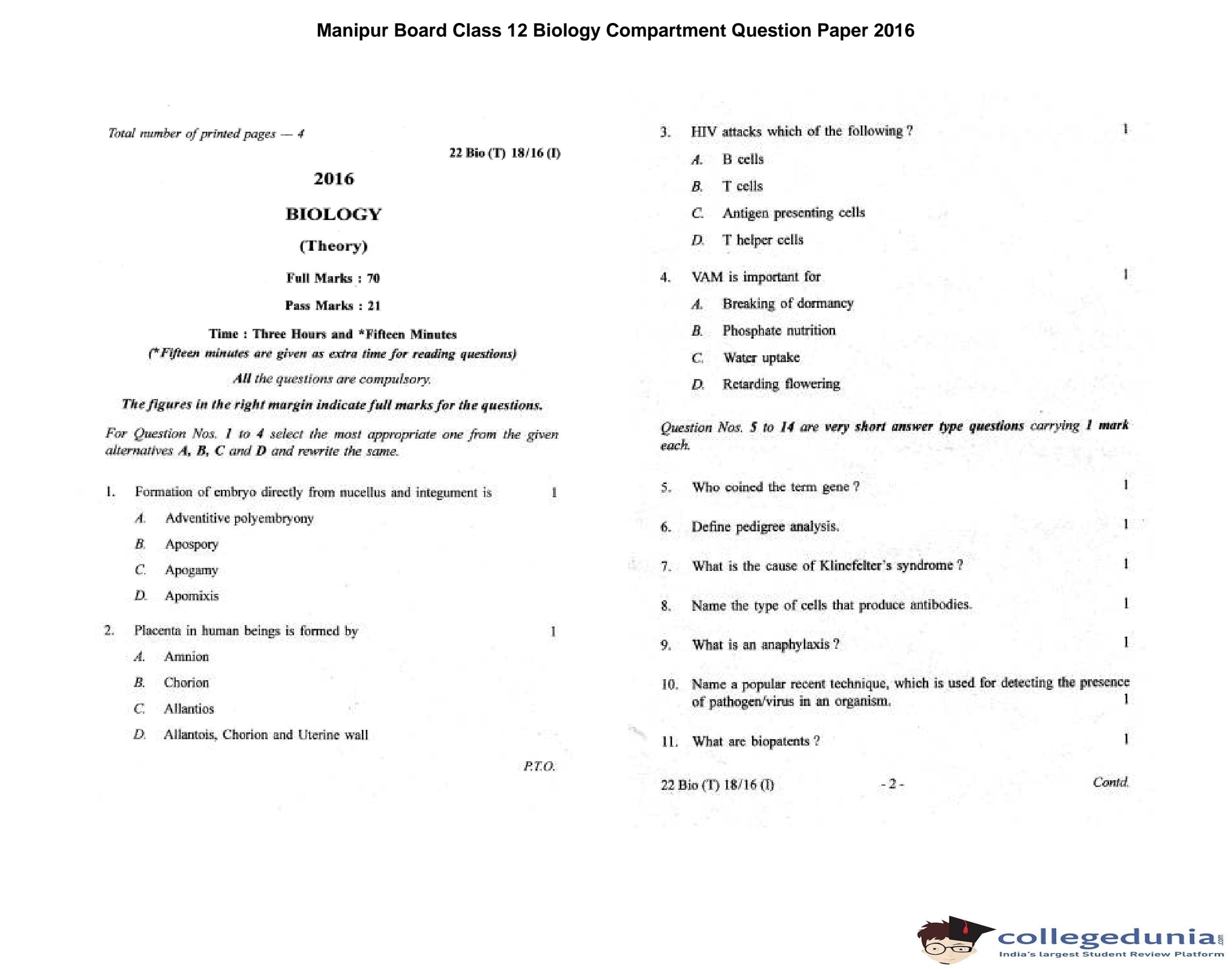 | Manipur Board Class 12 Biology Question Paper 2016 PDF | Manipur Board Class 12 Biology Answer Key 2016 PDF |