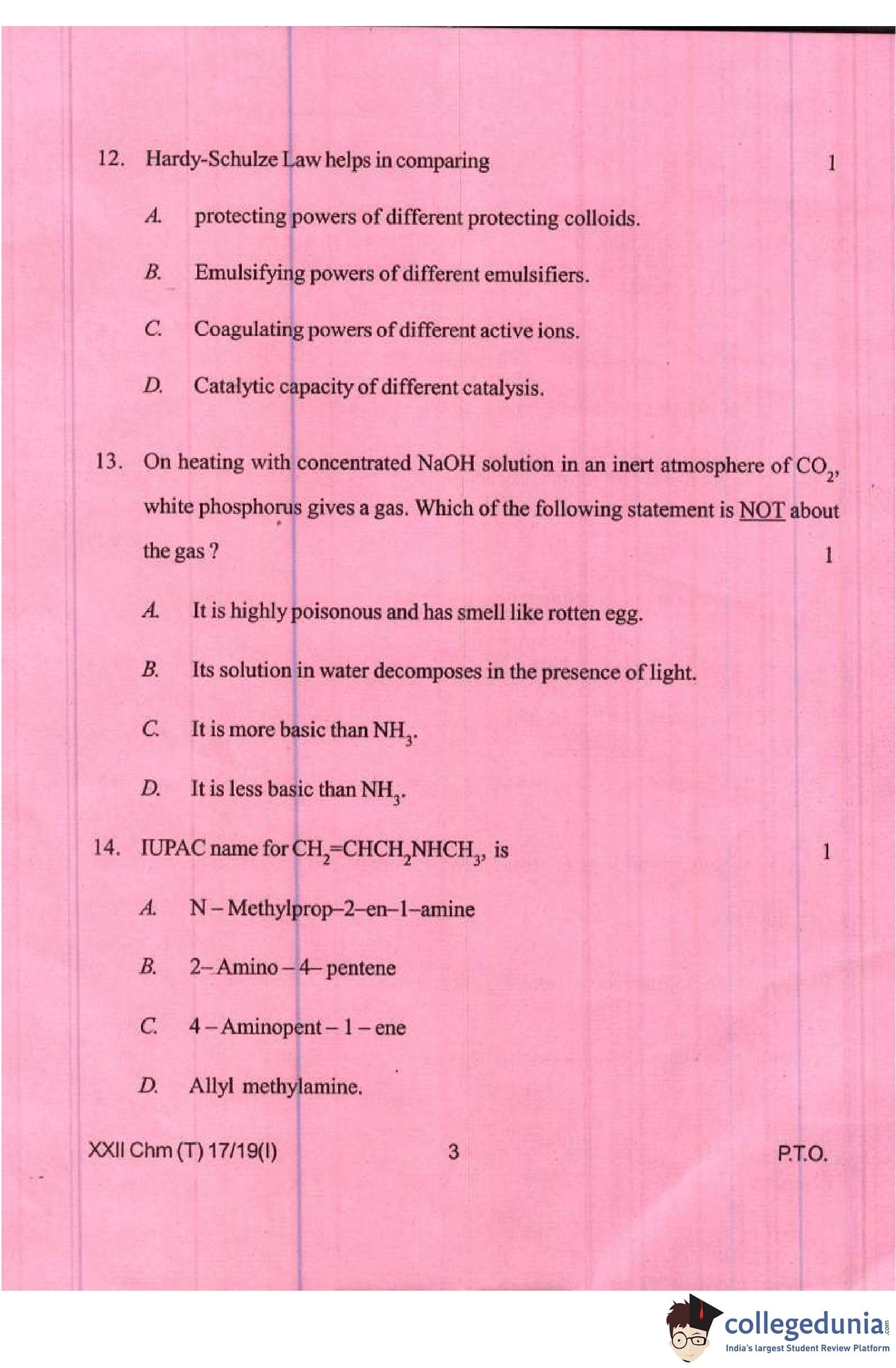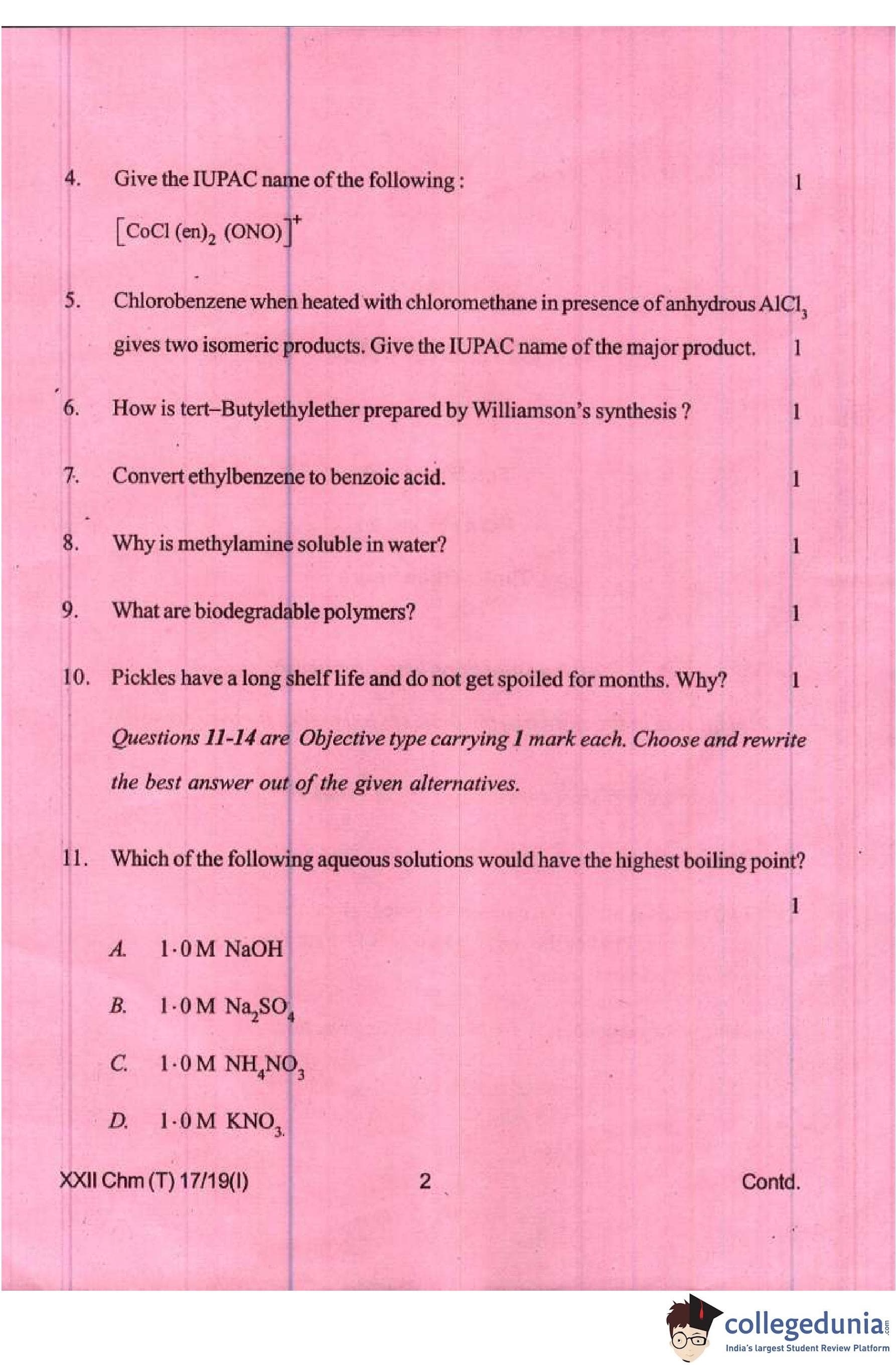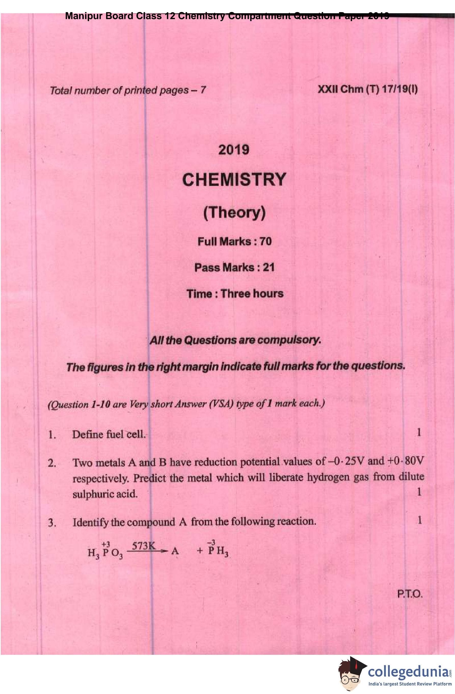 Manipur Board Class 12 Chemistry Compartment Question Paper 2019