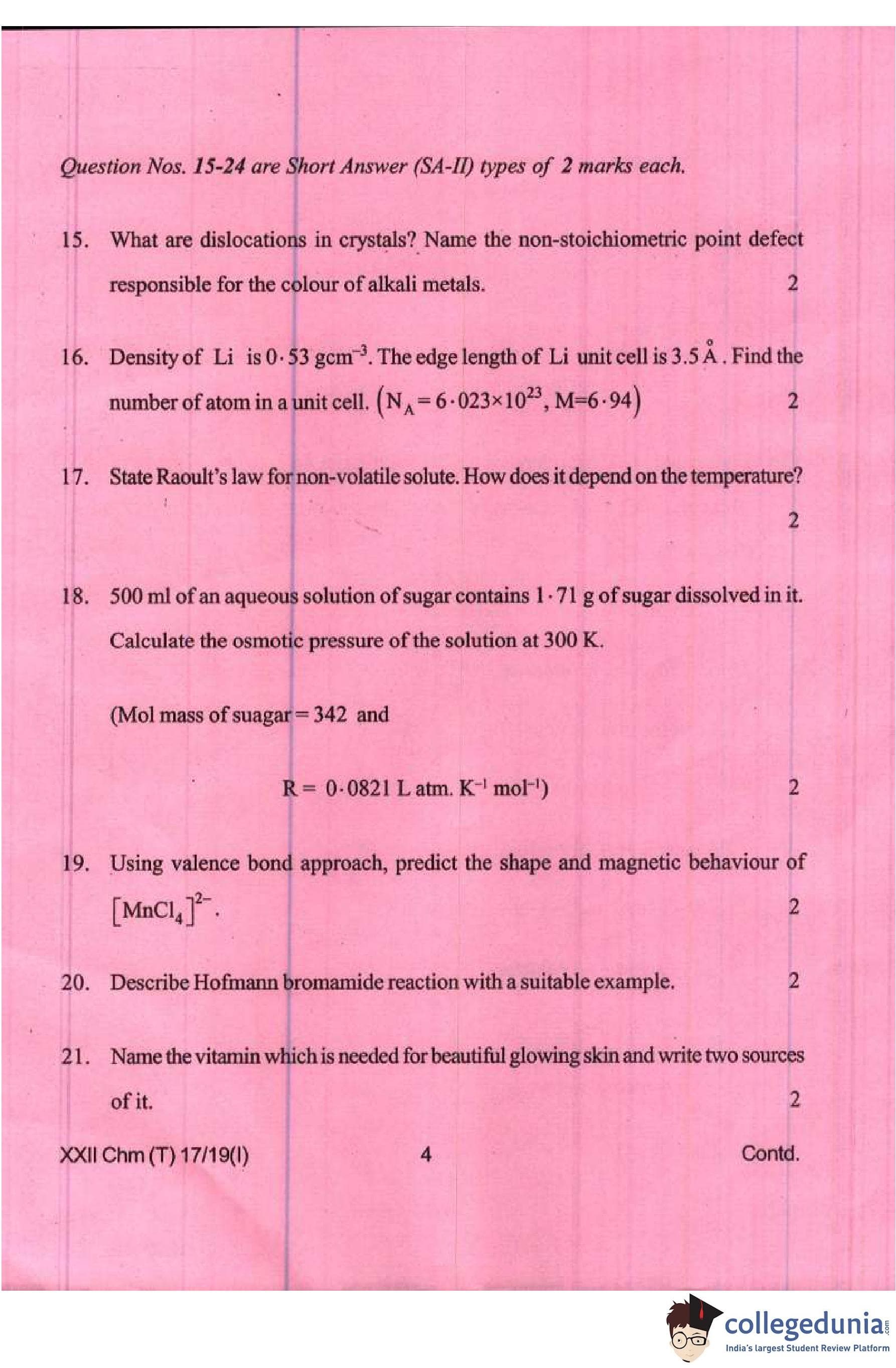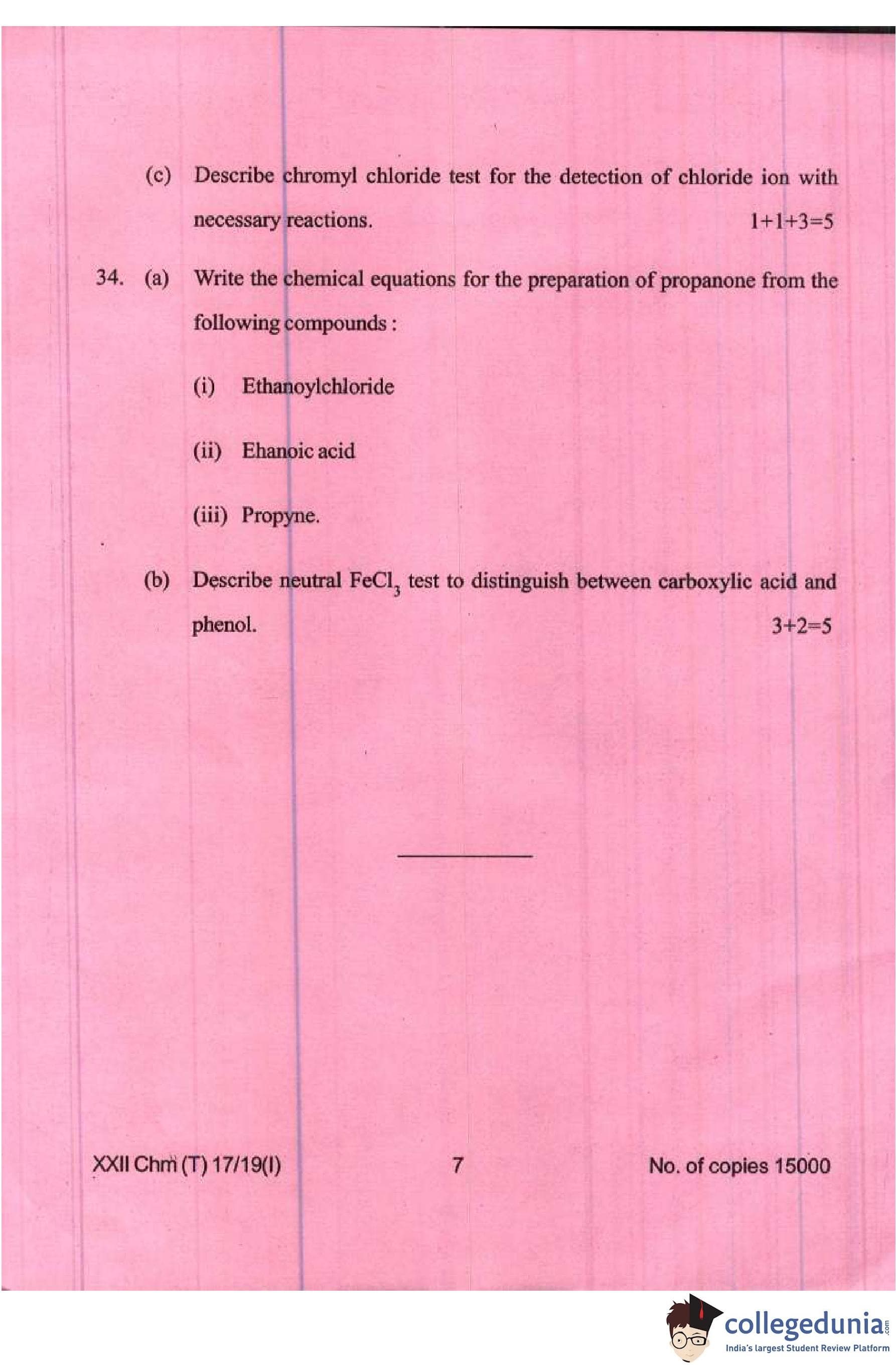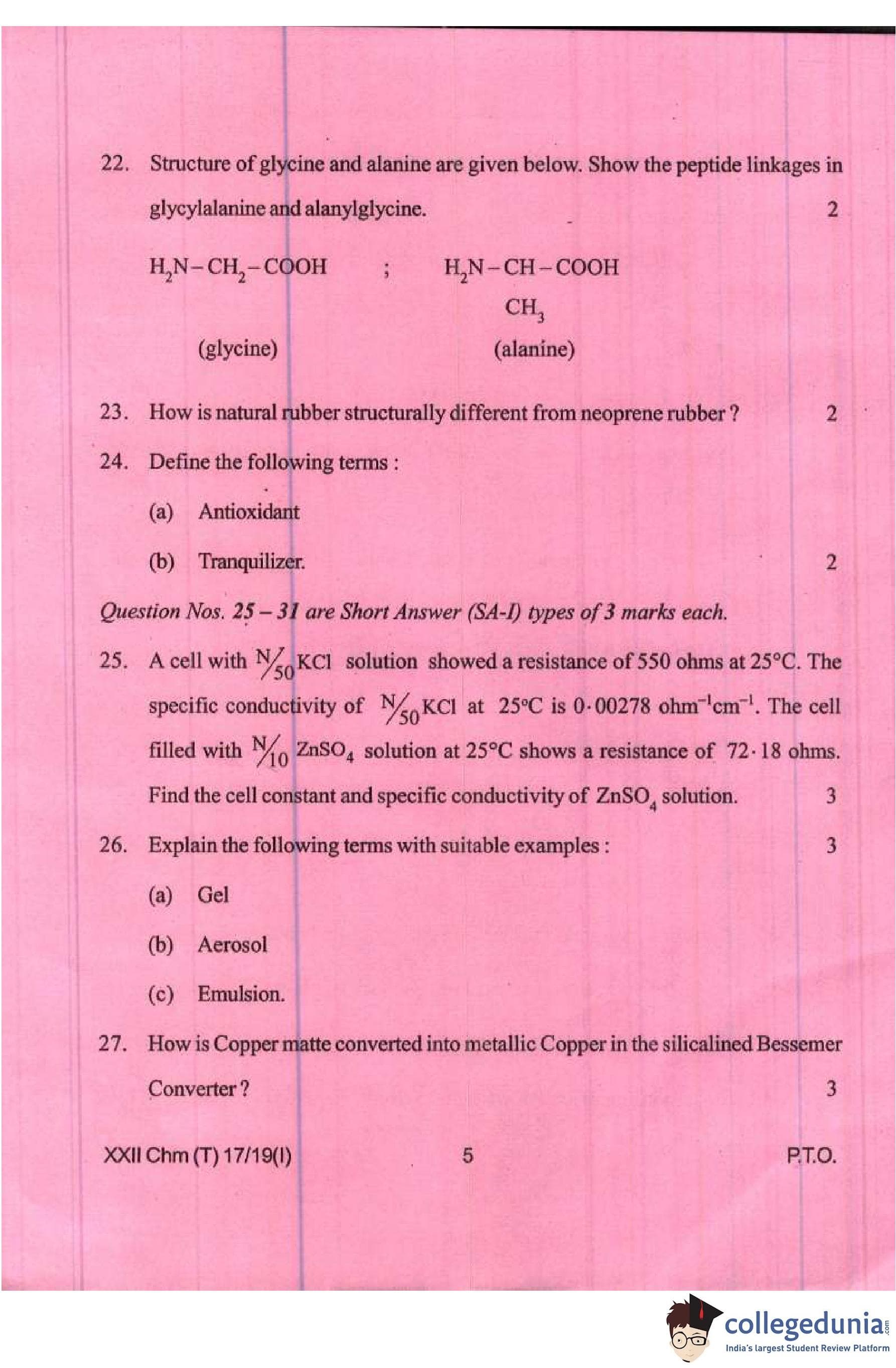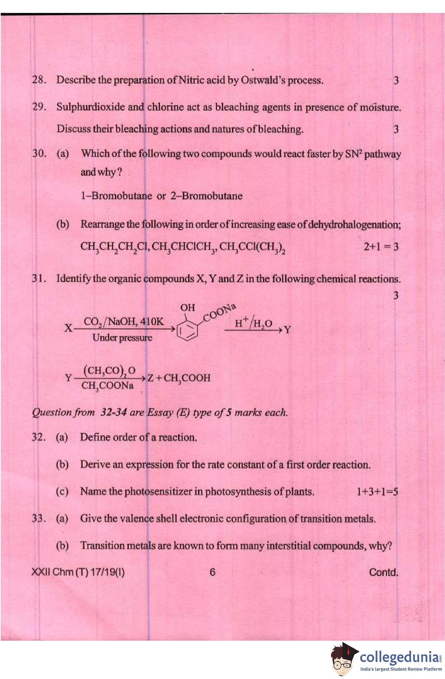 Manipur Board Class 12 Chemistry Compartment Question Paper 2019