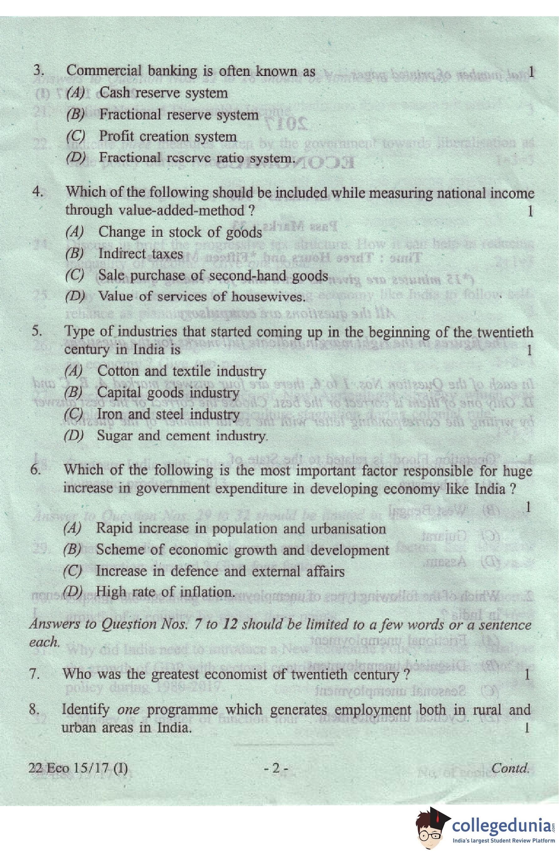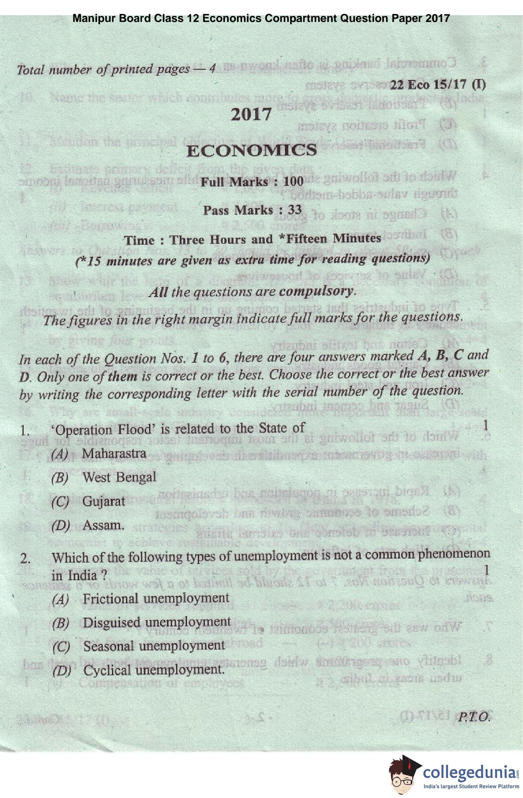 Manipur Board Class 12 Economics Compartment Question Paper 2017