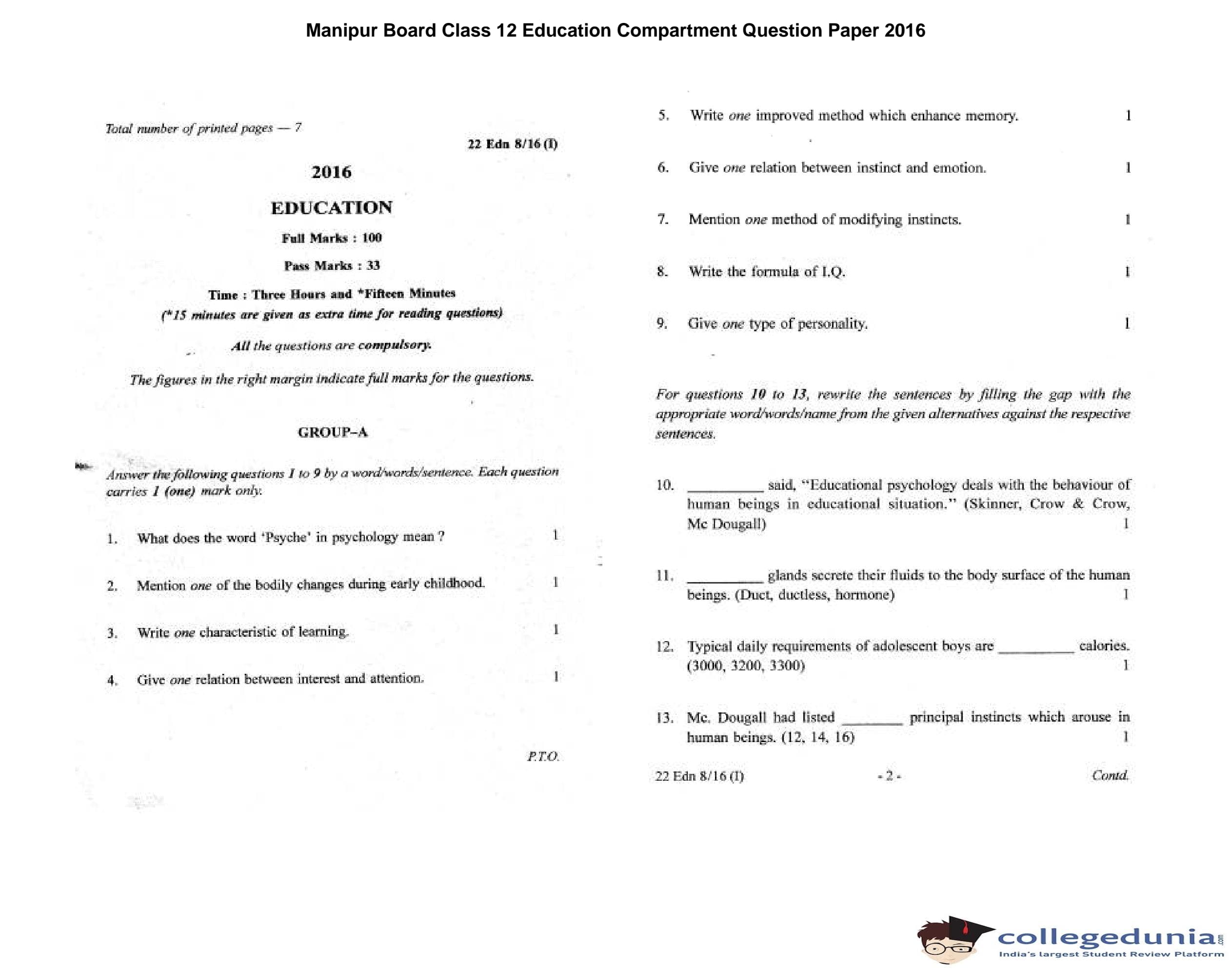 Manipur Board Class 12 Education Compartment Question Paper 2016