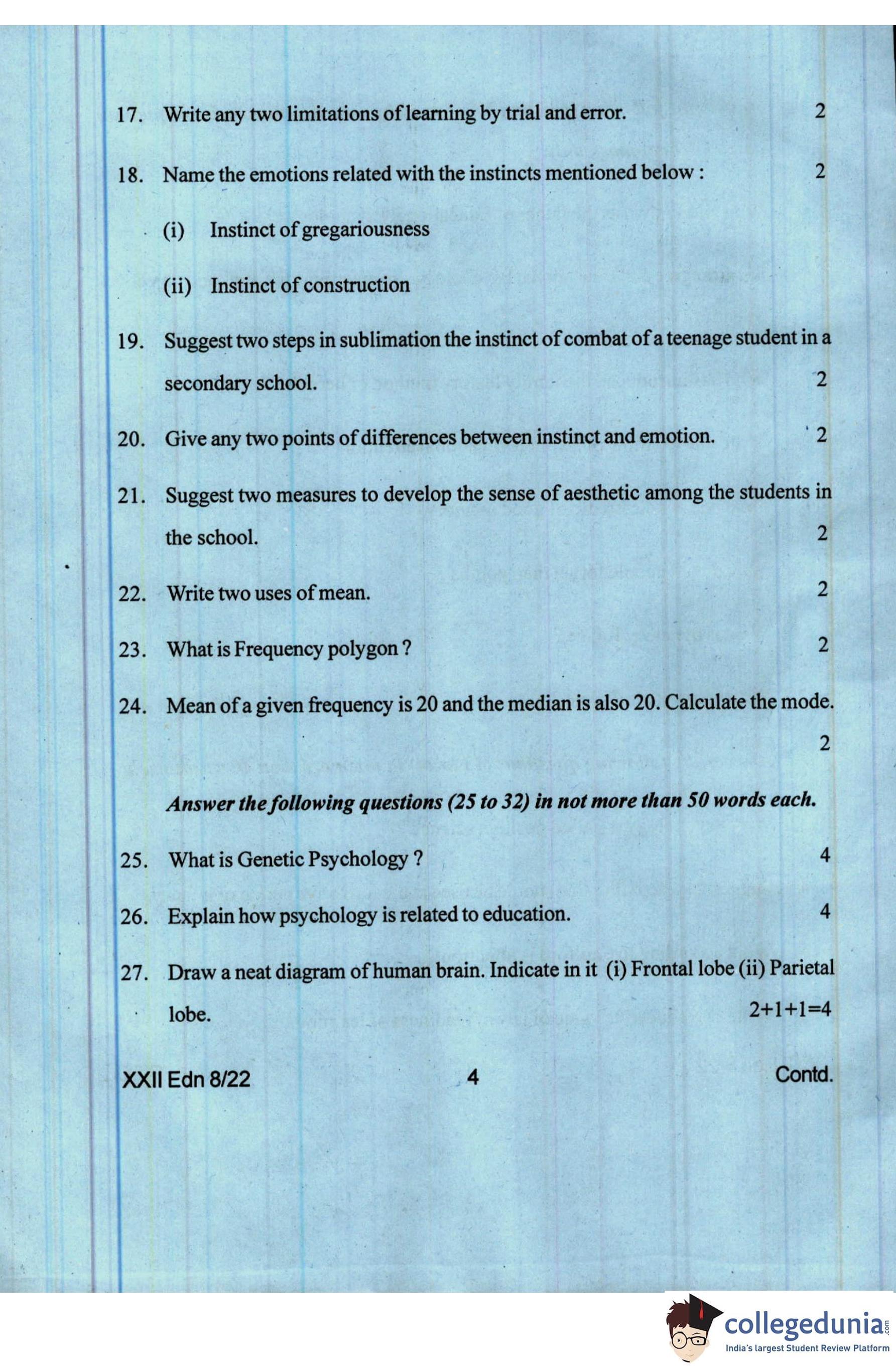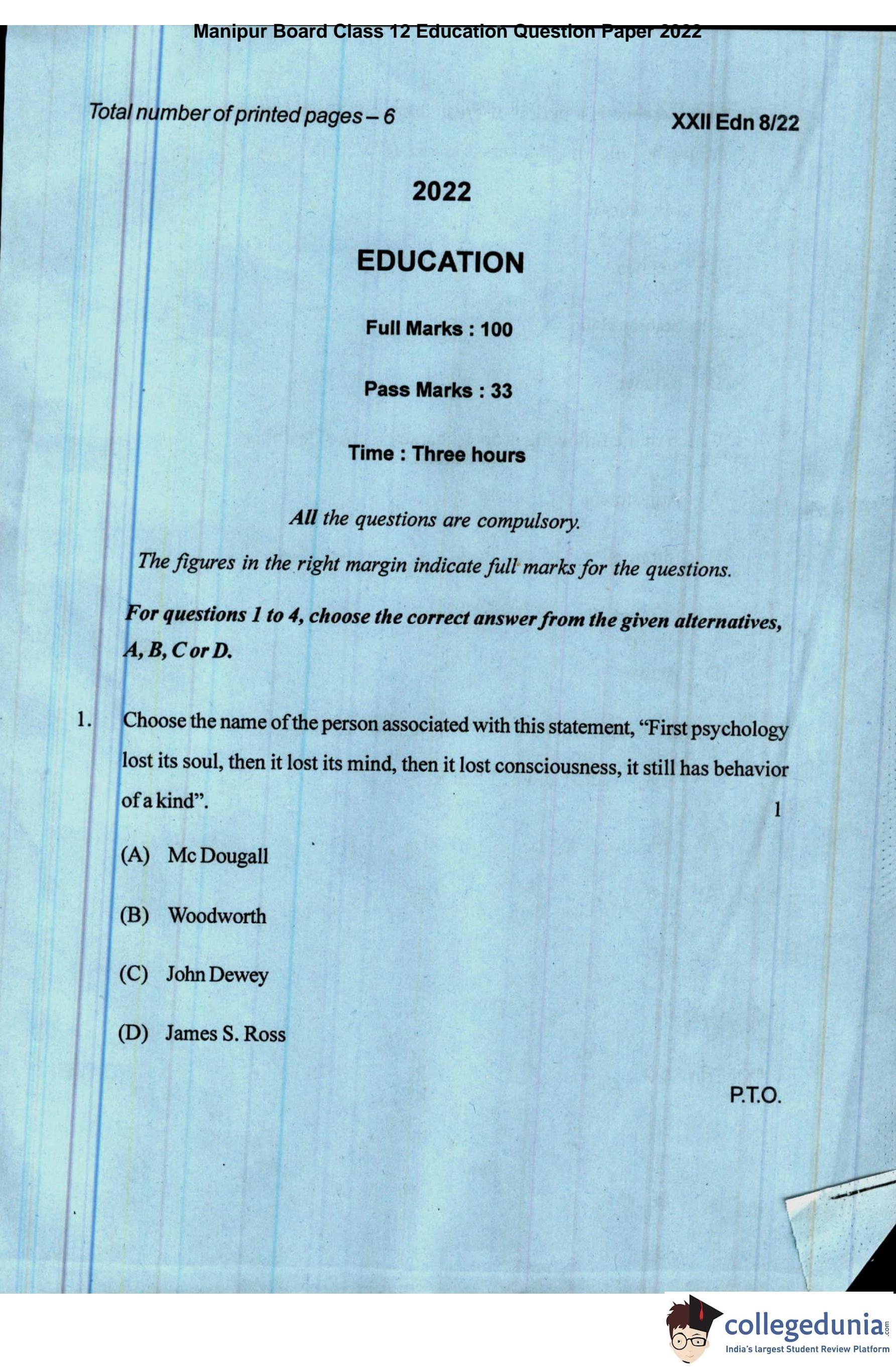 Manipur Board Class 12 Education Question Paper 2022 with Answer Key pdf is available for download here. The exam was conducted by Council Of Higher Secondary Education, Manipur on April 16, 2022. The question paper comprised a total of 36 questions.