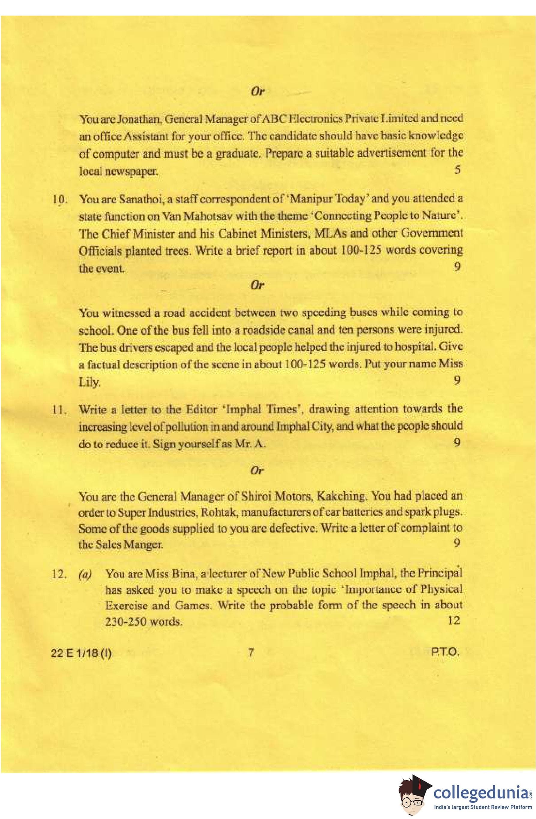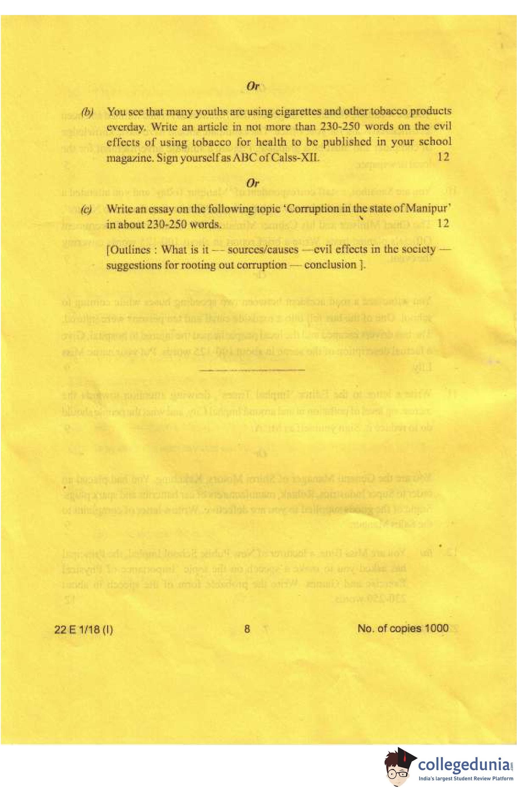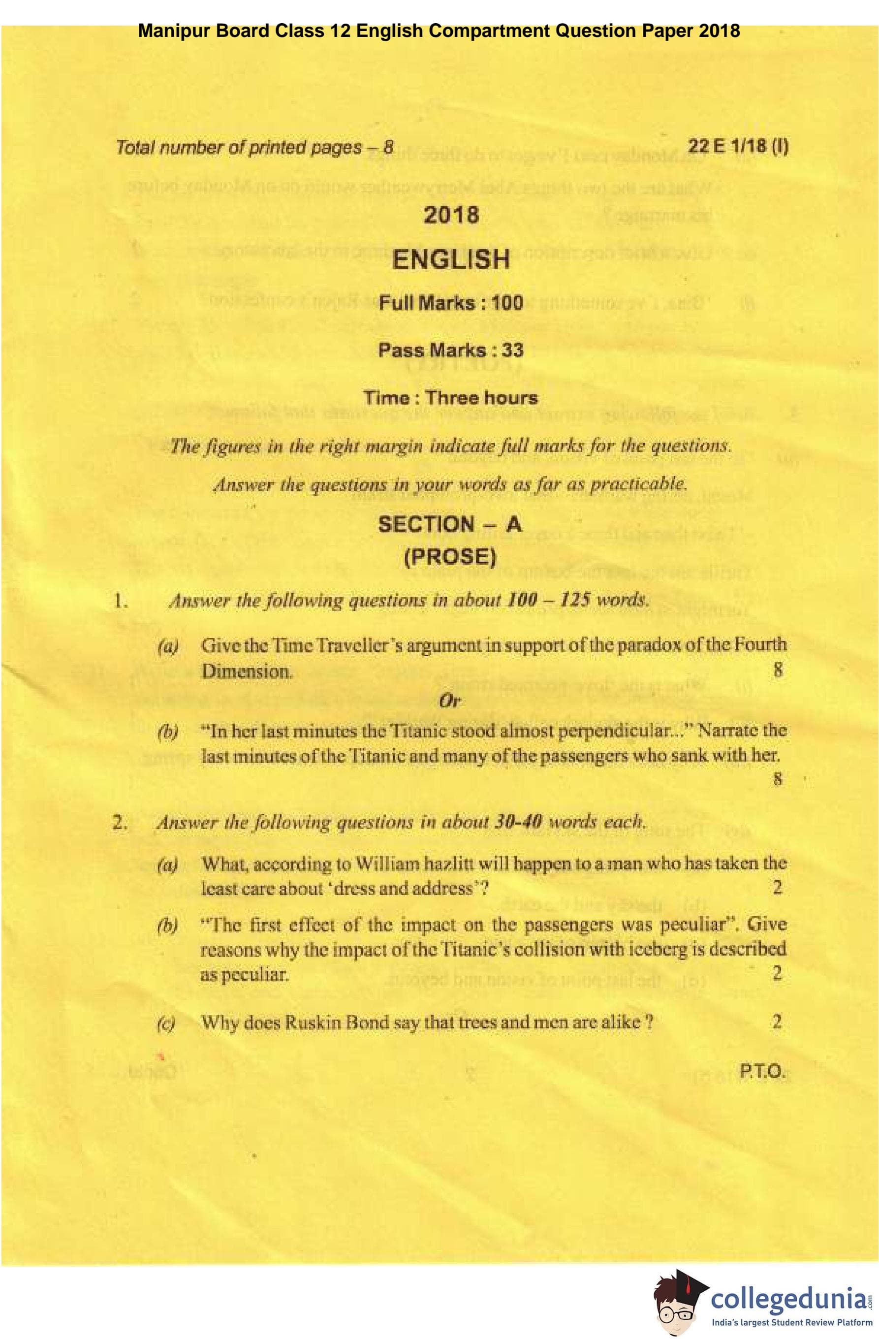 Manipur Board Class 12 English Compartment Question Paper 2018
