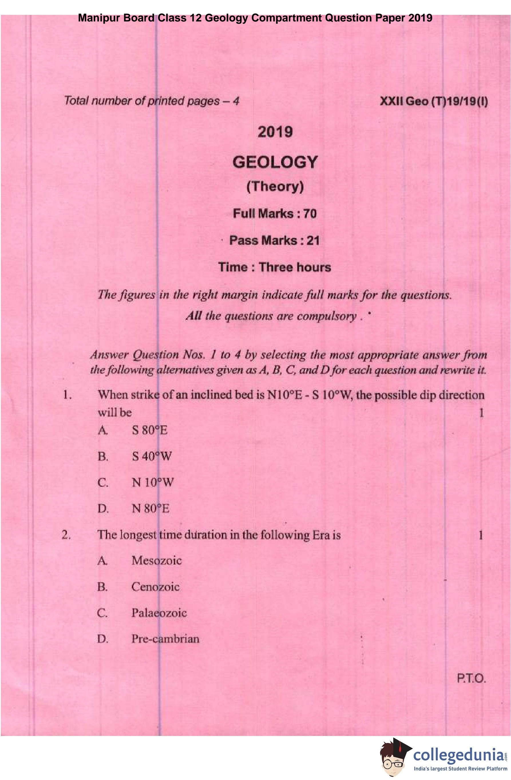 | Manipur Board Class 12 Geology Compartment Question Paper 2019 PDF | Manipur Board Class 12 Geology Compartment Answer Key 2019 PDF |