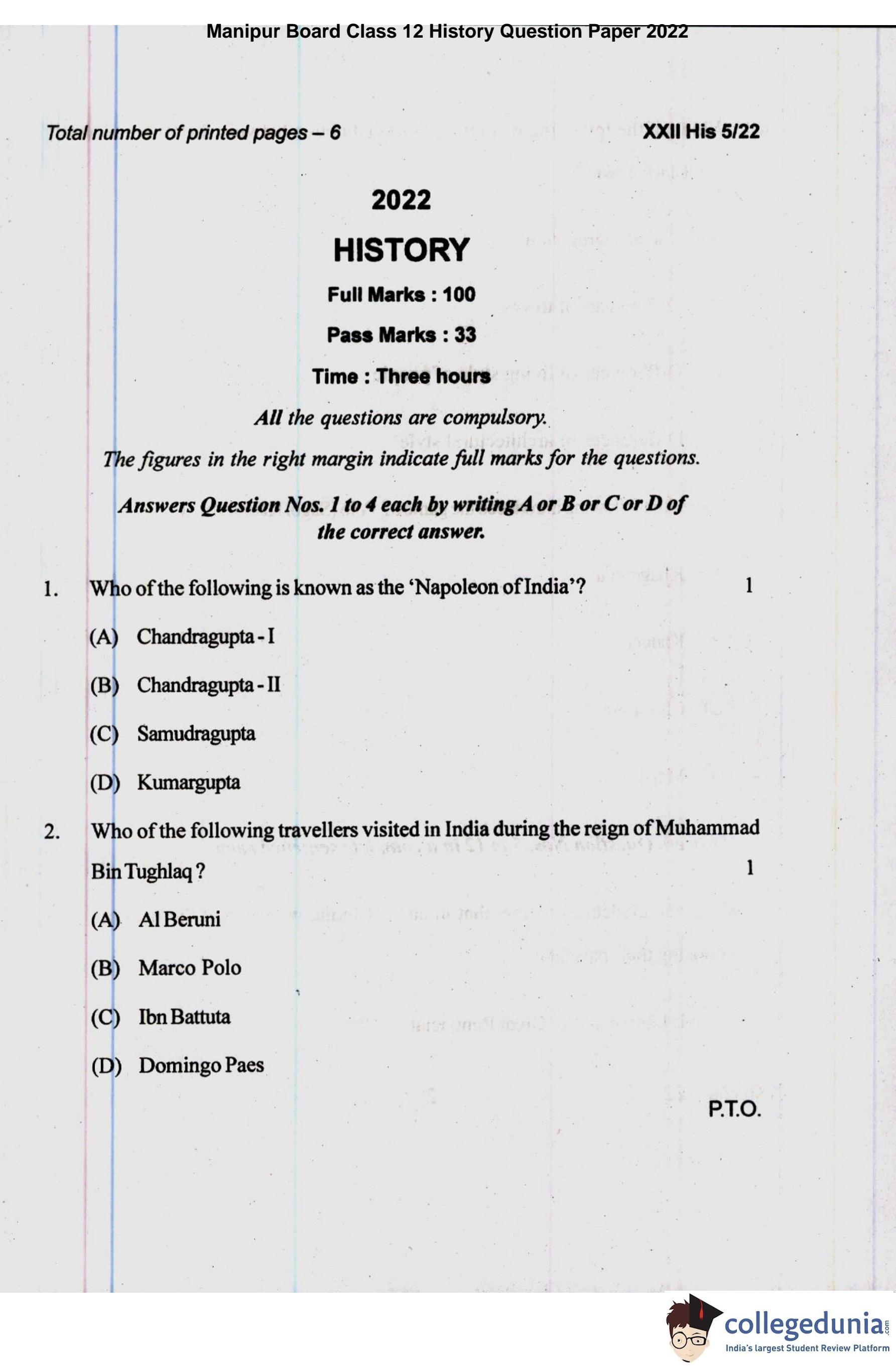 | Manipur Board Class 12 History Question Paper 2022 PDF | Manipur Board Class 12 History Answer Key 2022 PDF |
