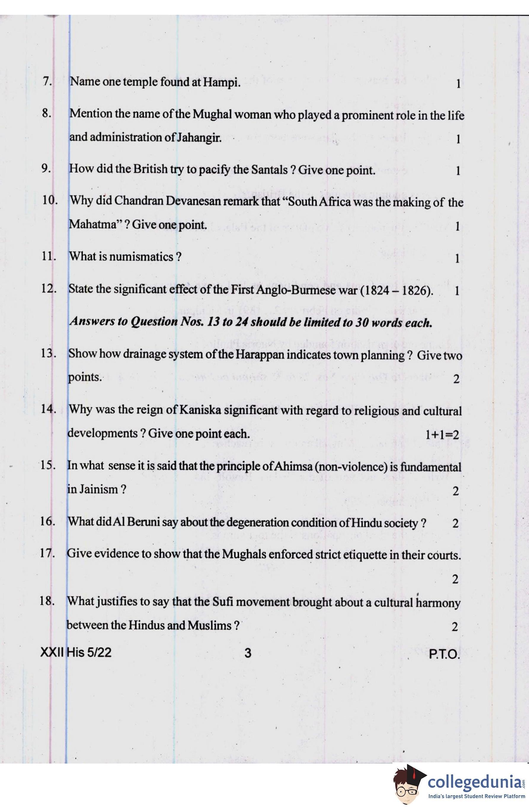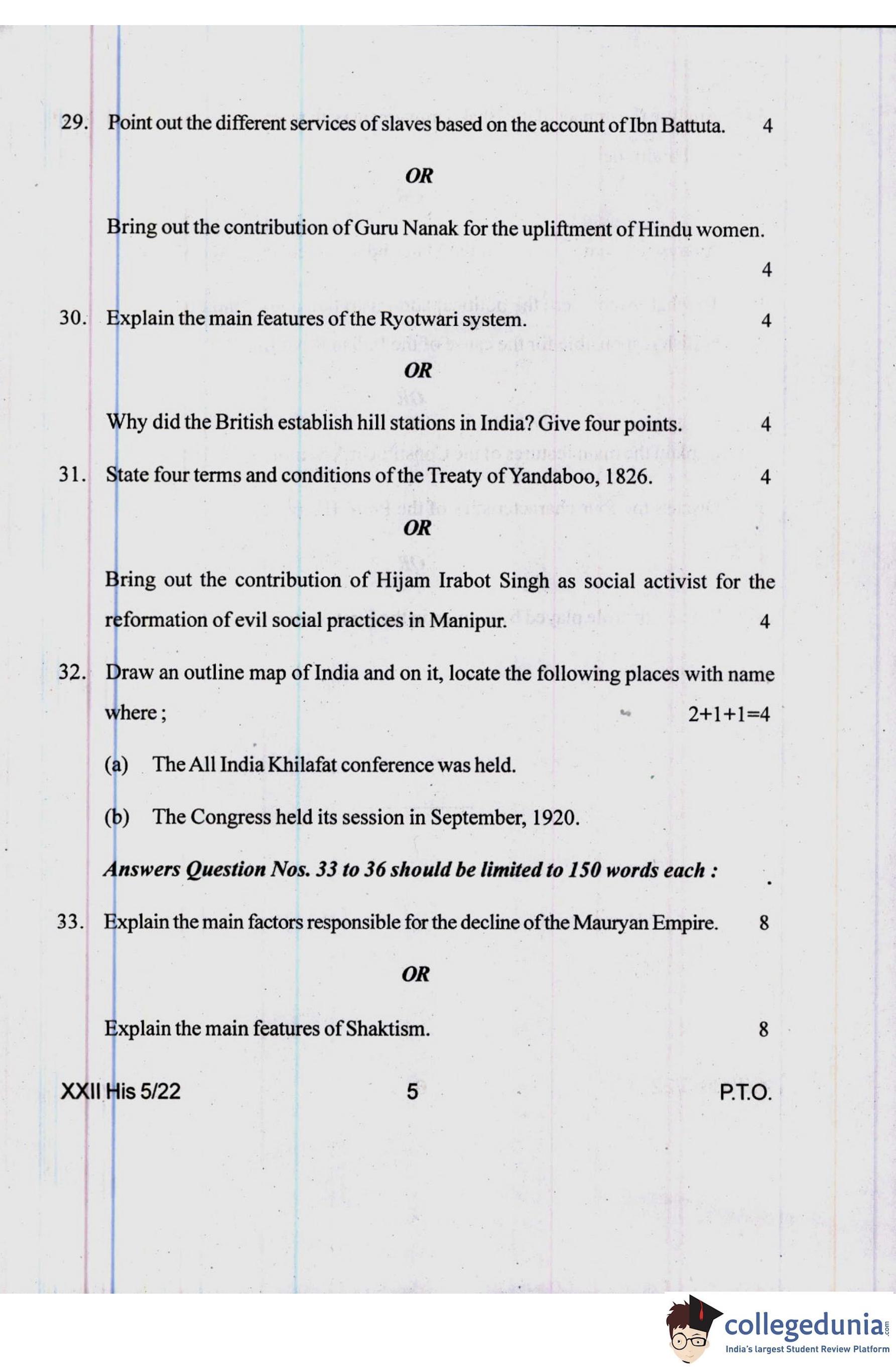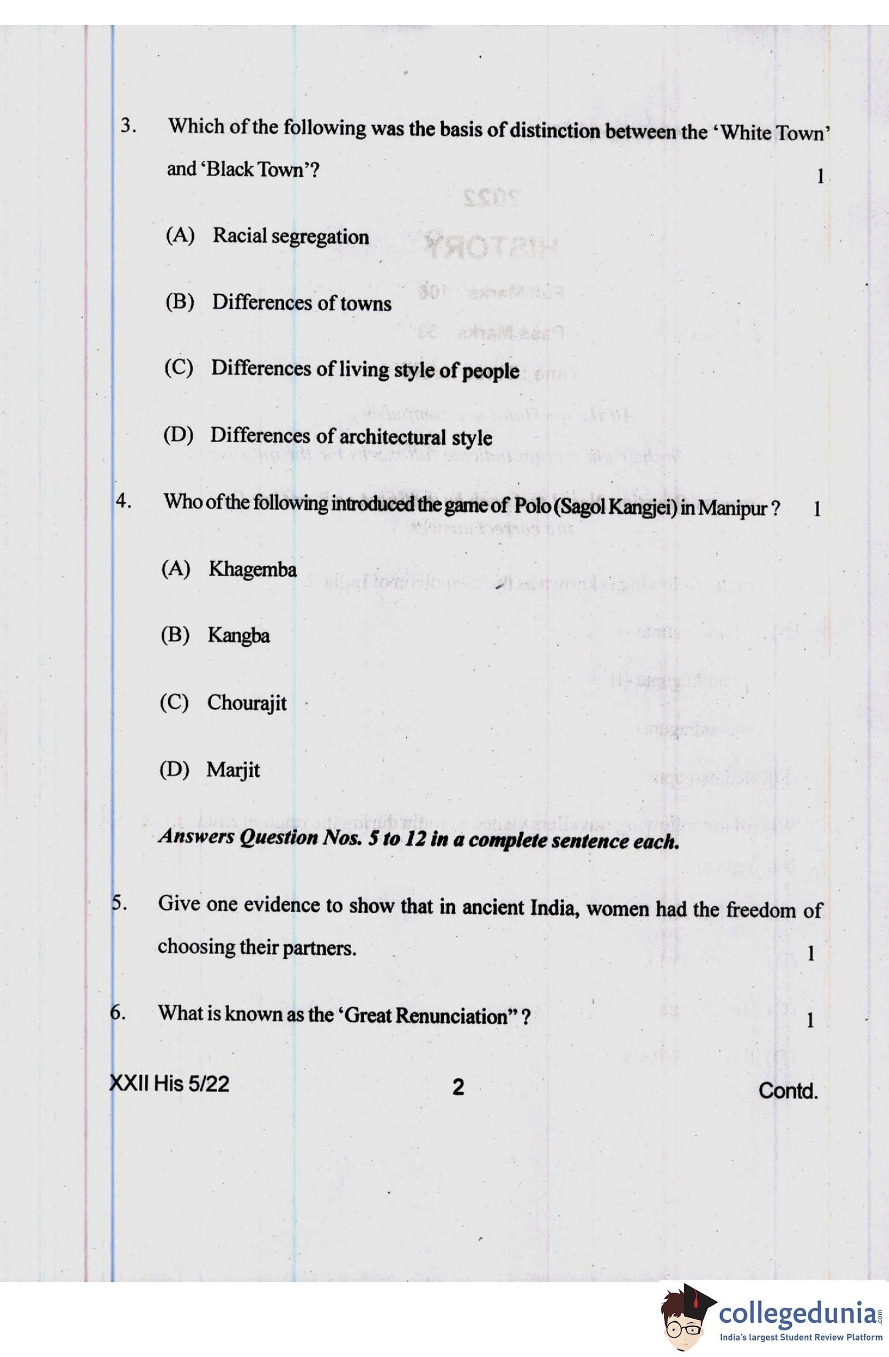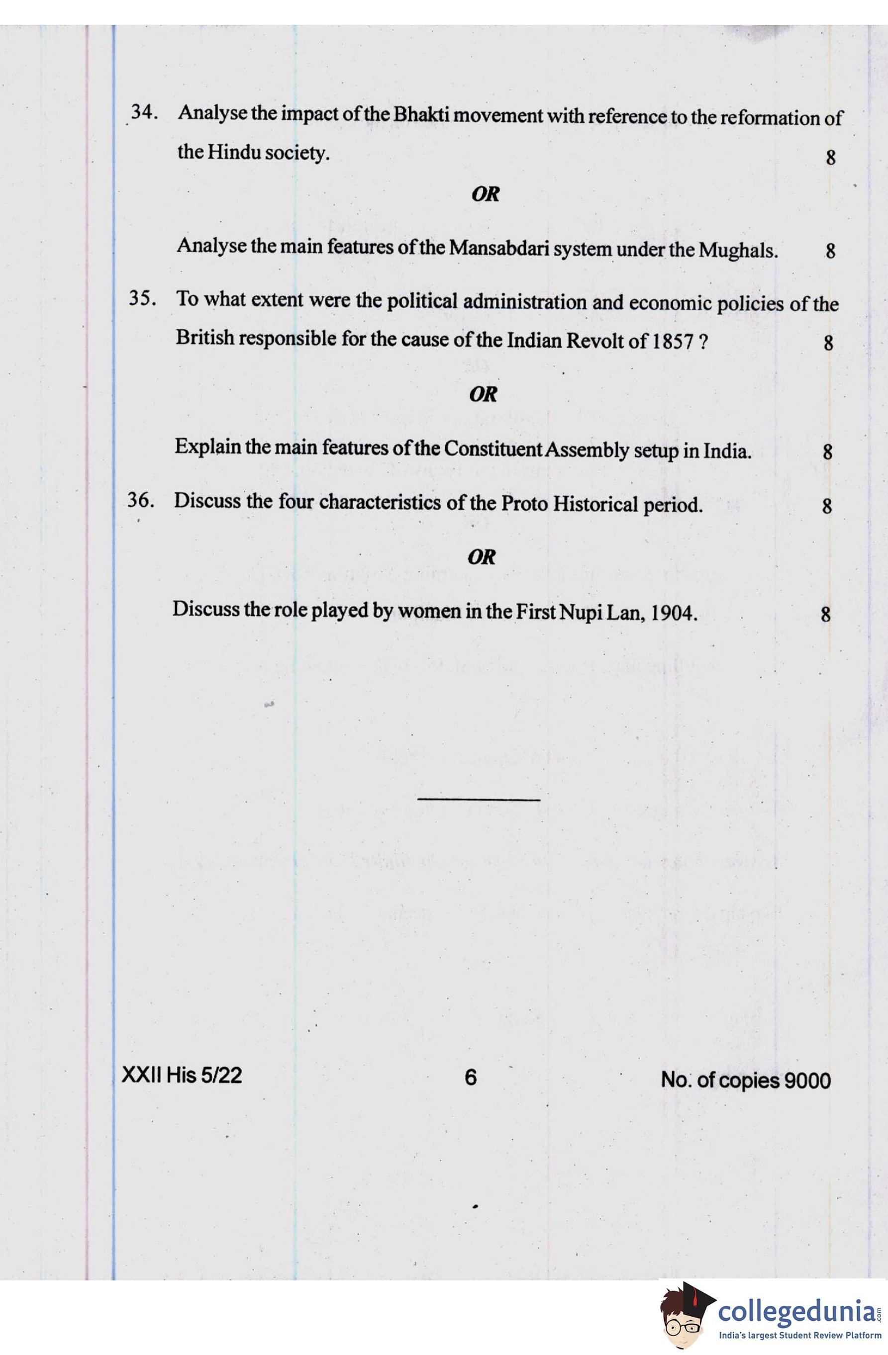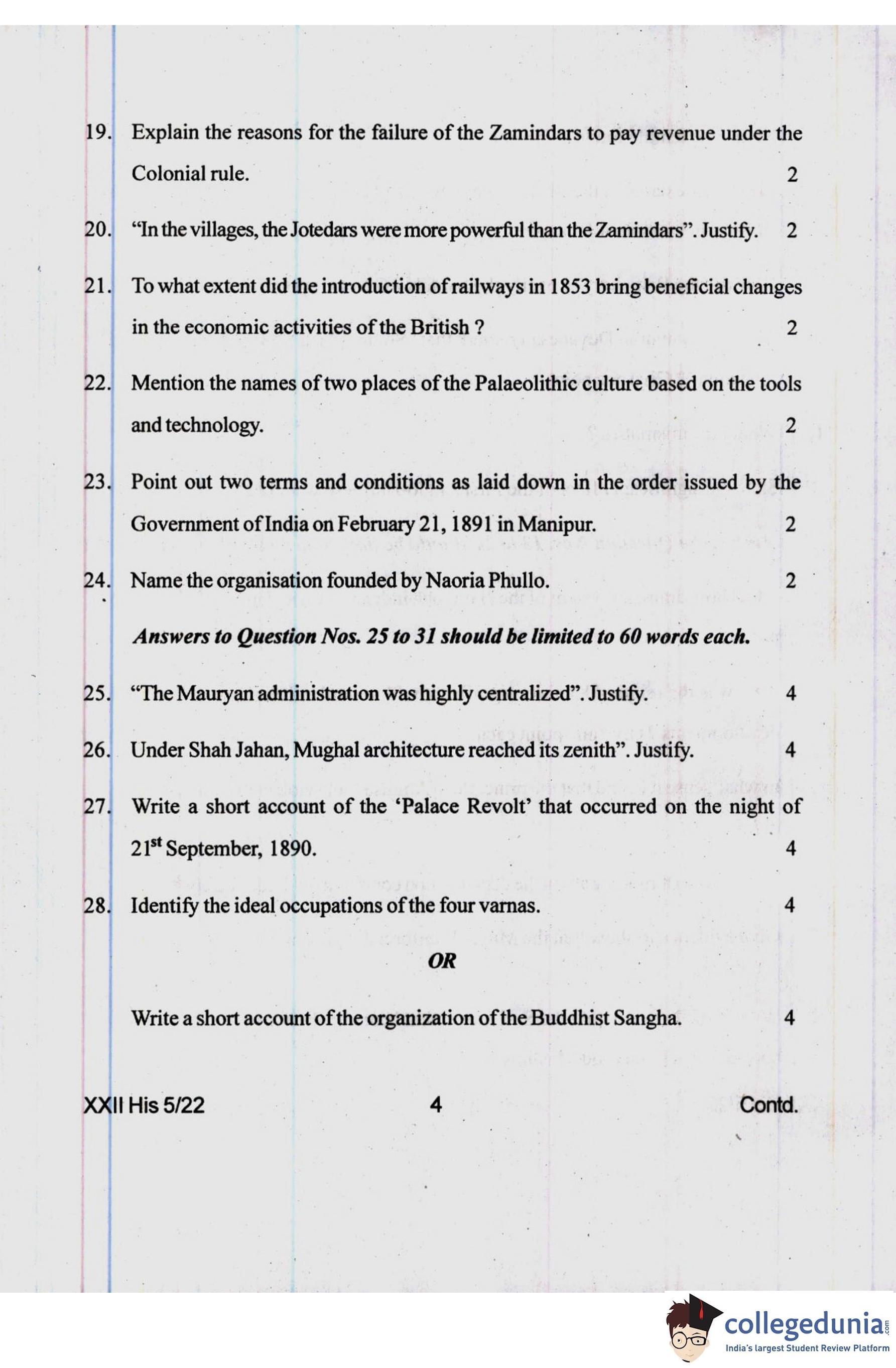Manipur Board Class 12 History Question Paper 2022 with Answer Key pdf is available for download here. The exam was conducted by Council Of Higher Secondary Education, Manipur on April 19, 2022. The question paper comprised a total of 36 questions.