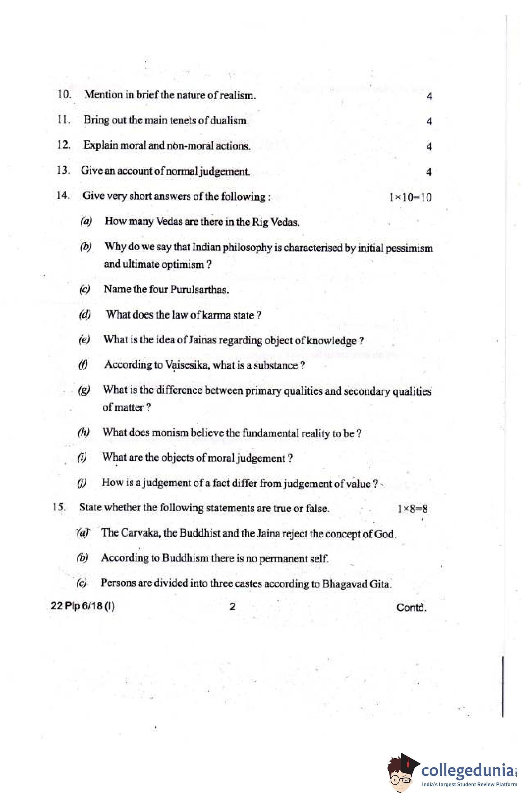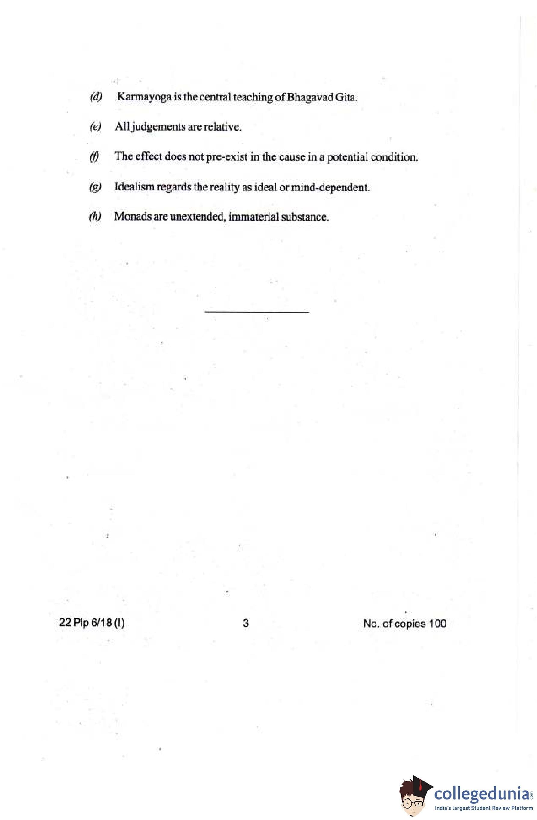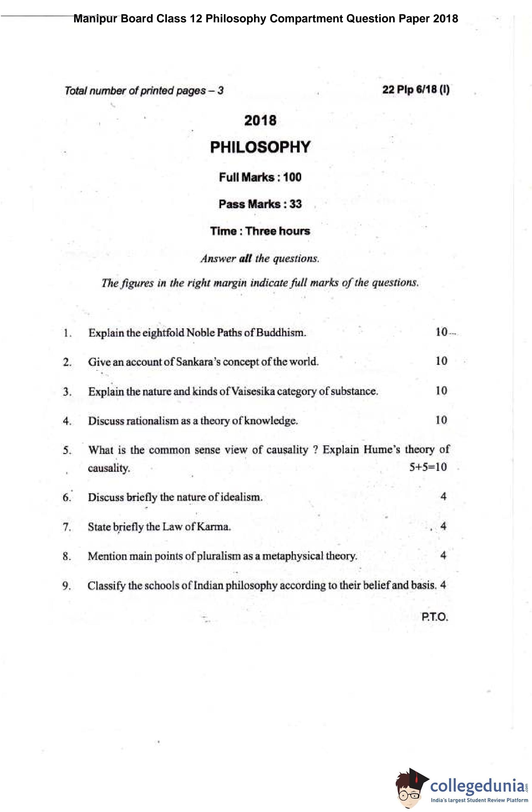 Manipur Board Class 12 Philosophy Compartment Question Paper 2018