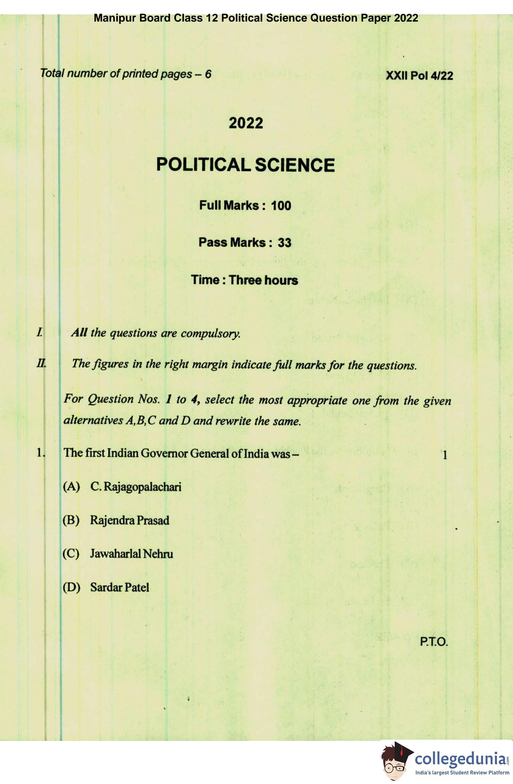 | Manipur Board Class 12 Political Science Question Paper 2022 PDF | Manipur Board Class 12 Political ScienceAnswer Key 2022 PDF |