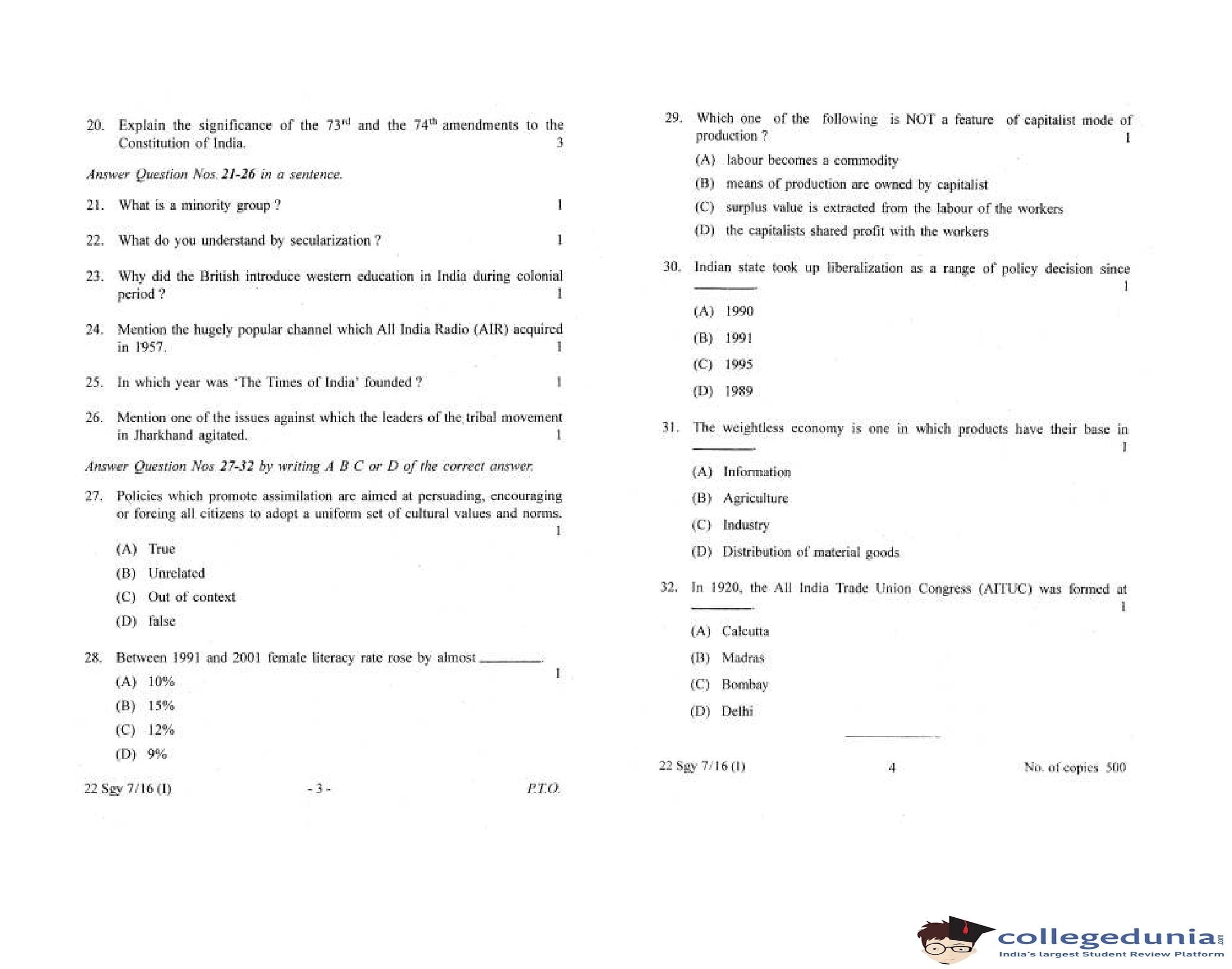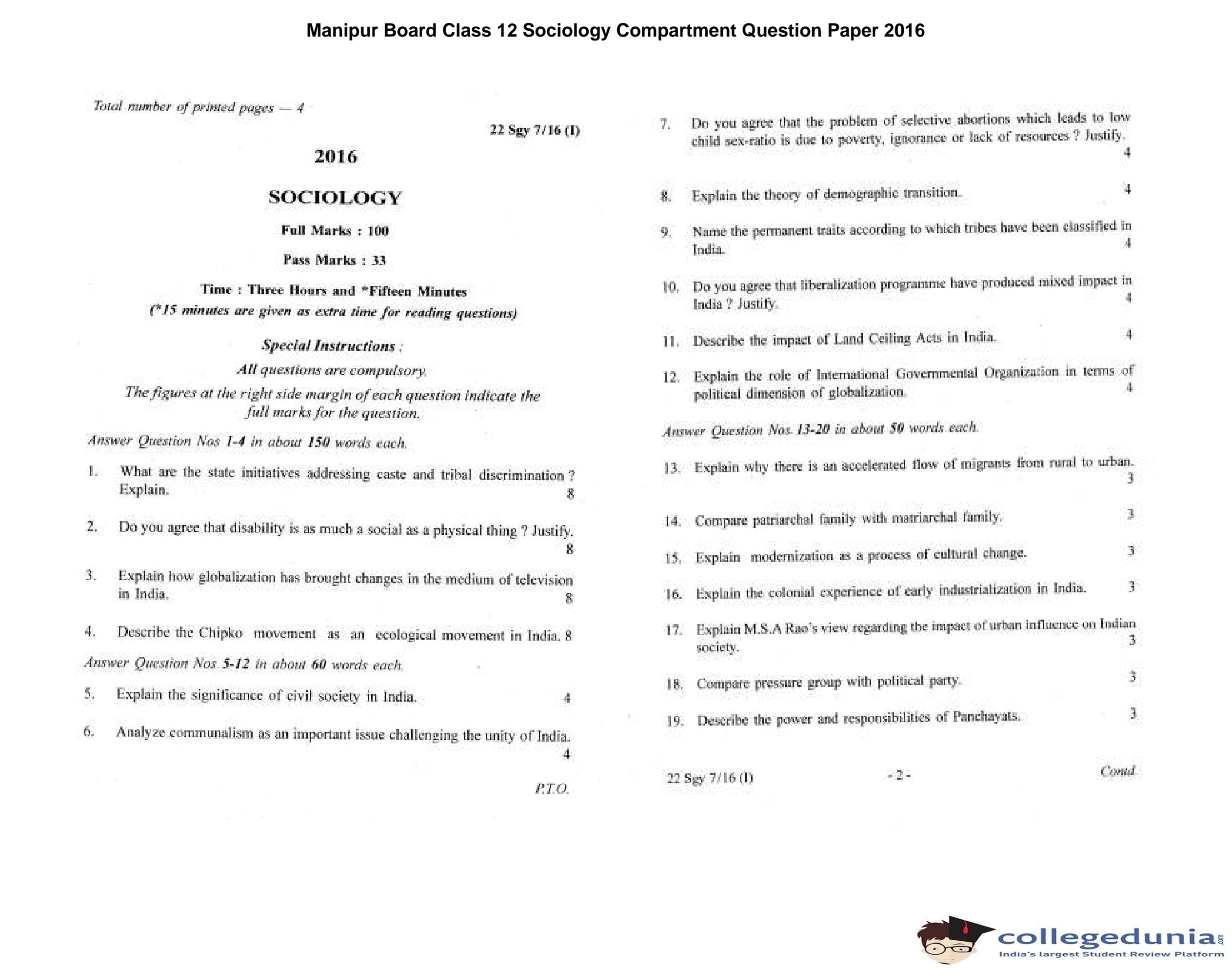 Manipur Board Class 12 Sociology Compartment Question Paper 2016