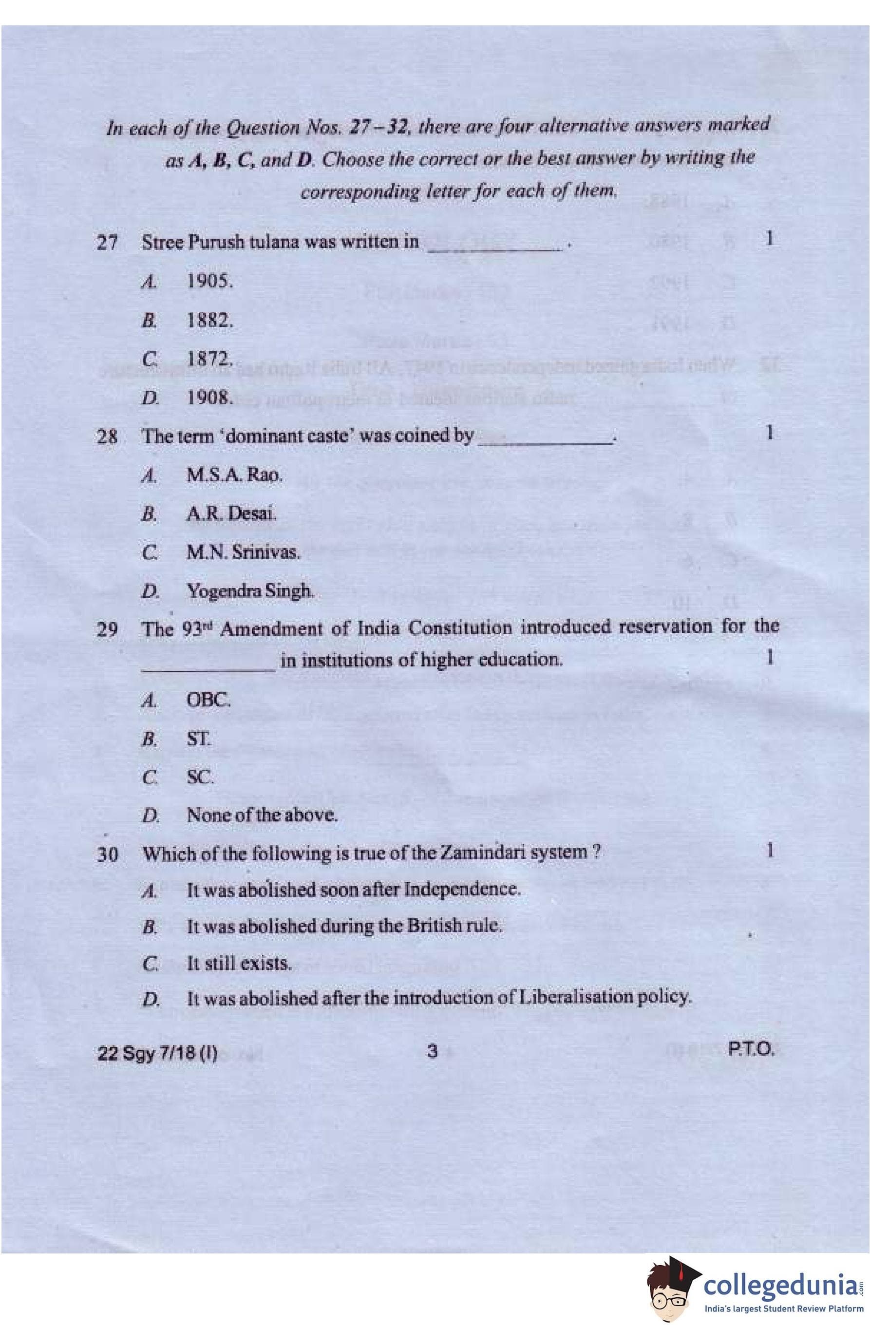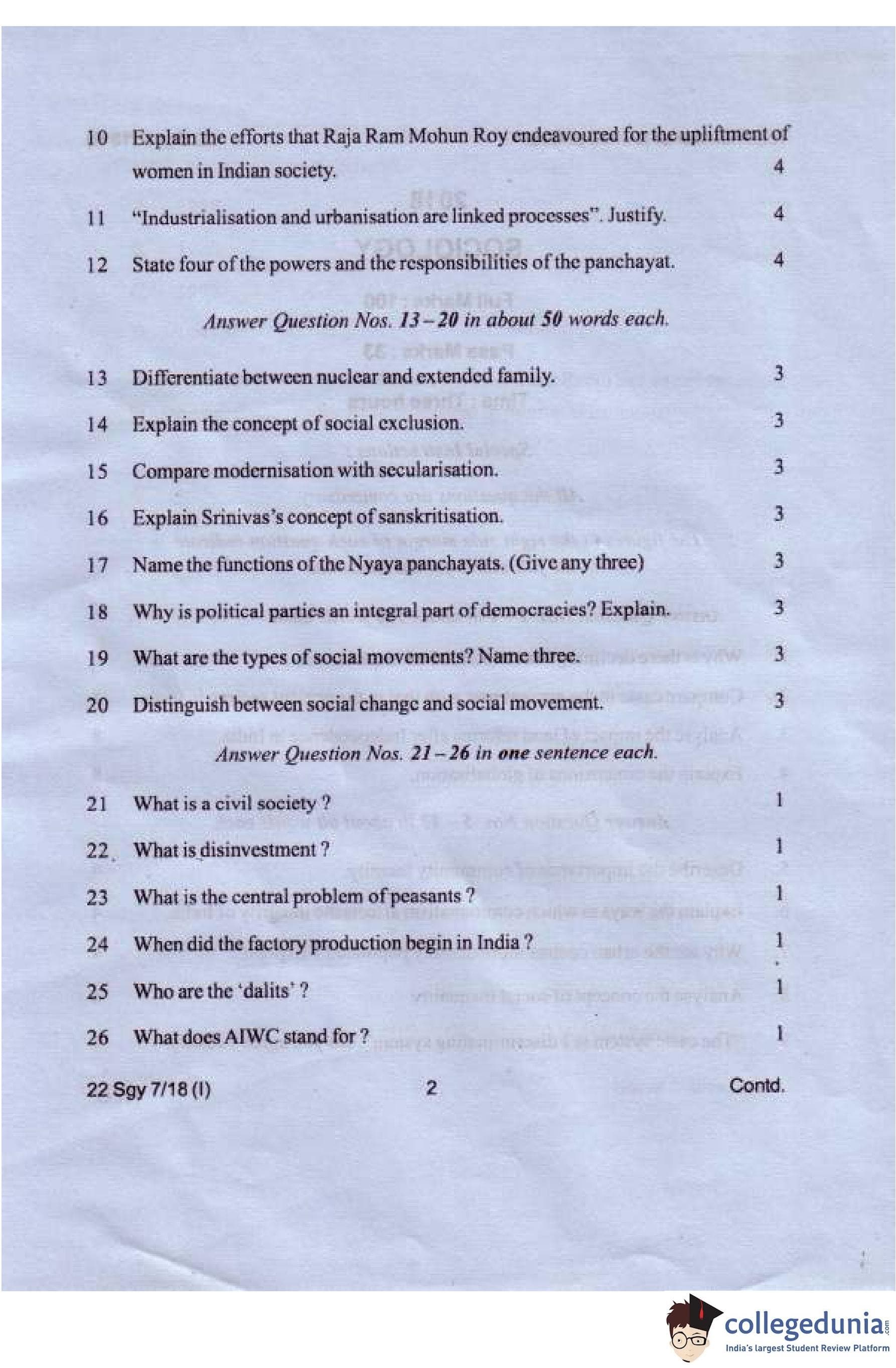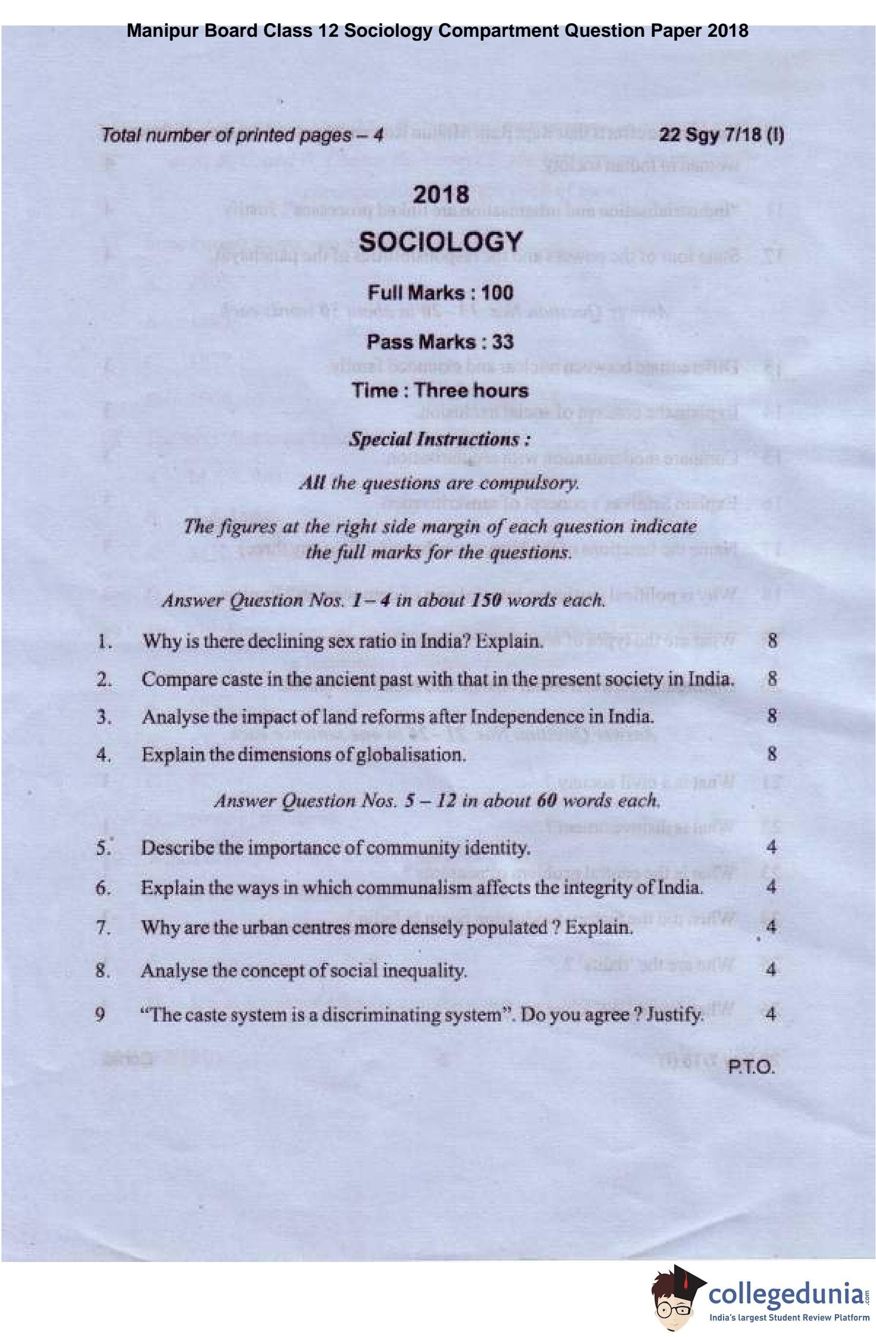 Manipur Board Class 12 Sociology Compartment Question Paper 2018