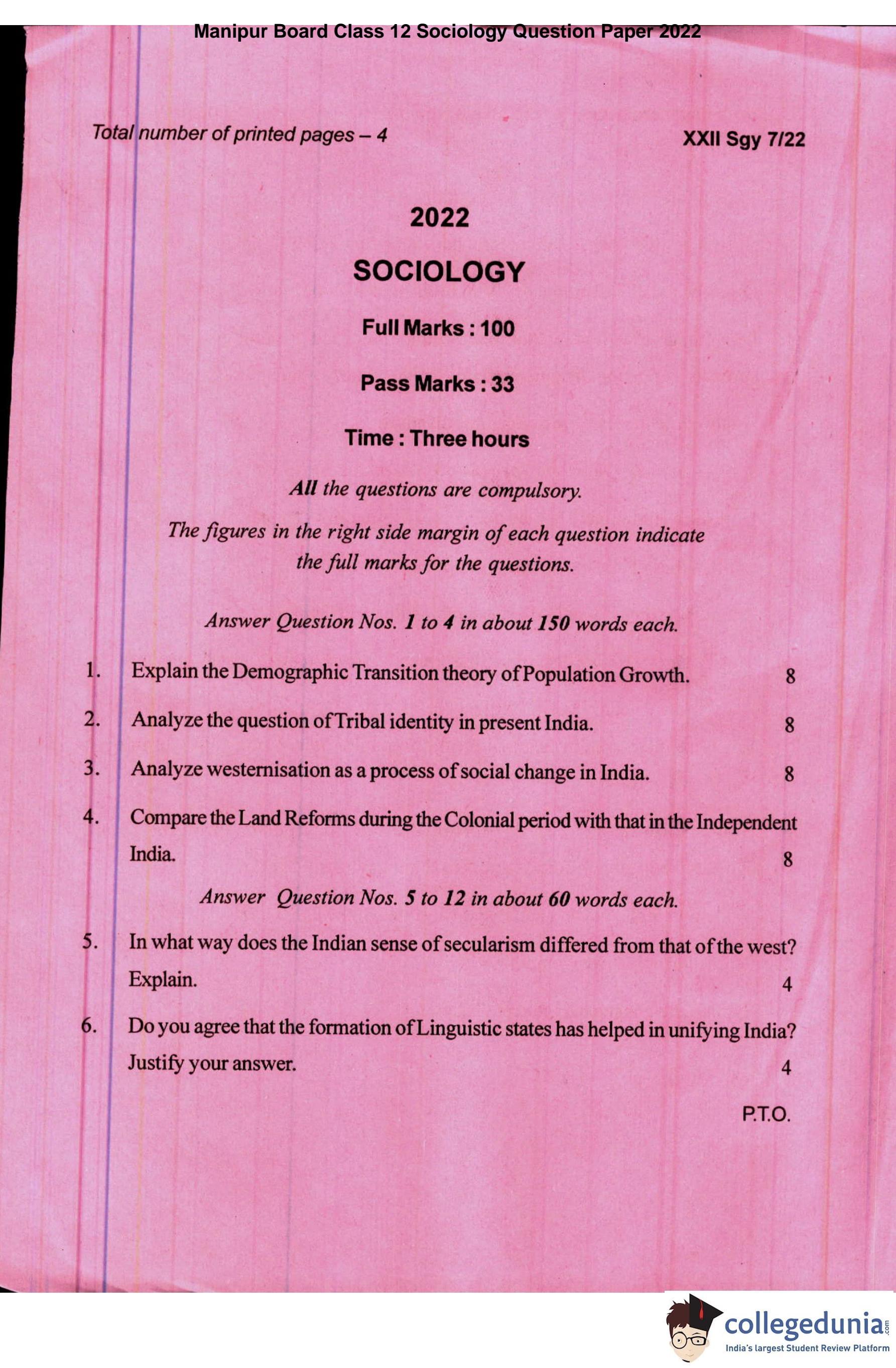 | Manipur Board Class 12 Sociology Question Paper 2022 PDF | Manipur Board Class 12 Sociology Answer Key 2022 PDF |