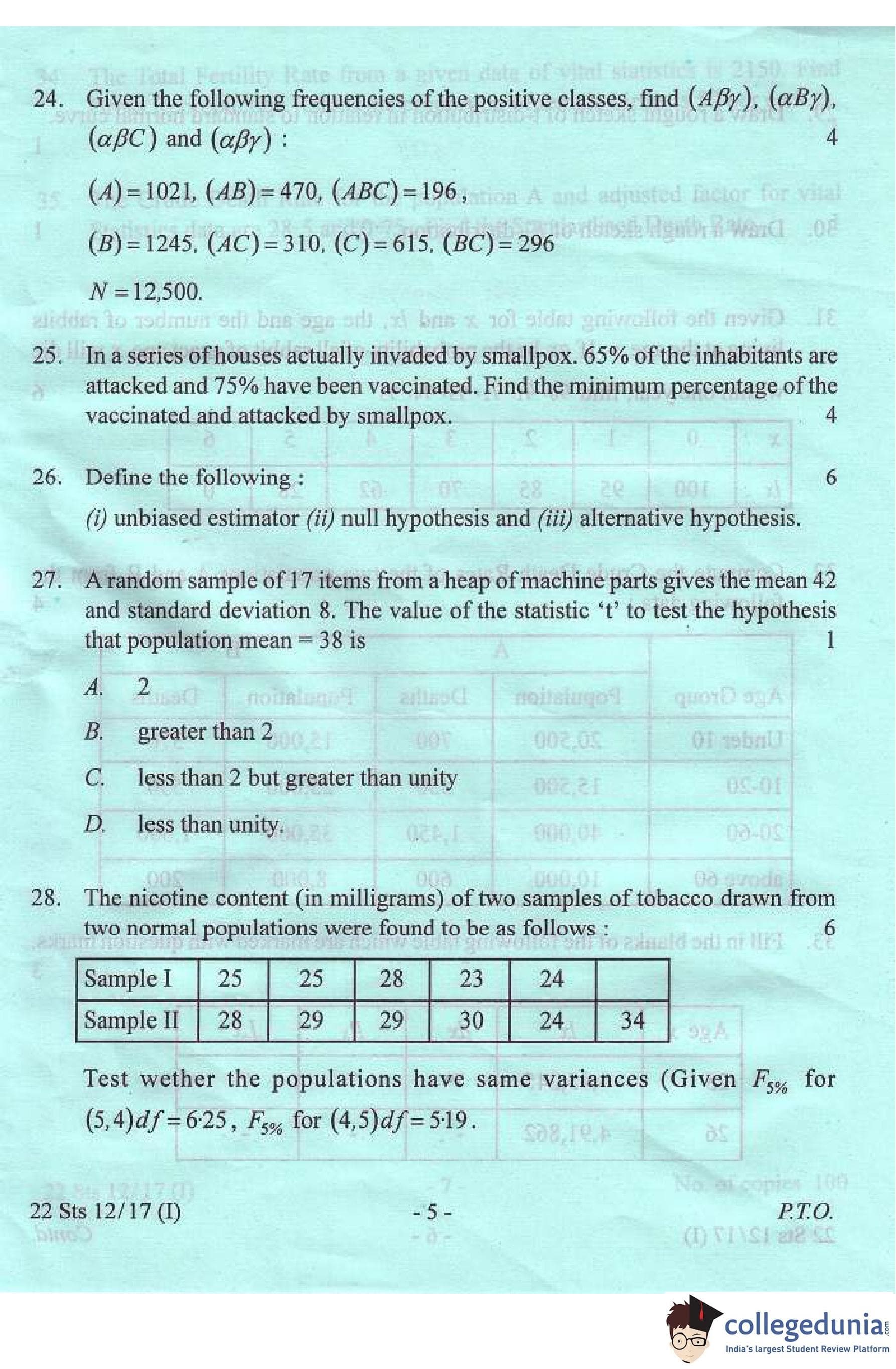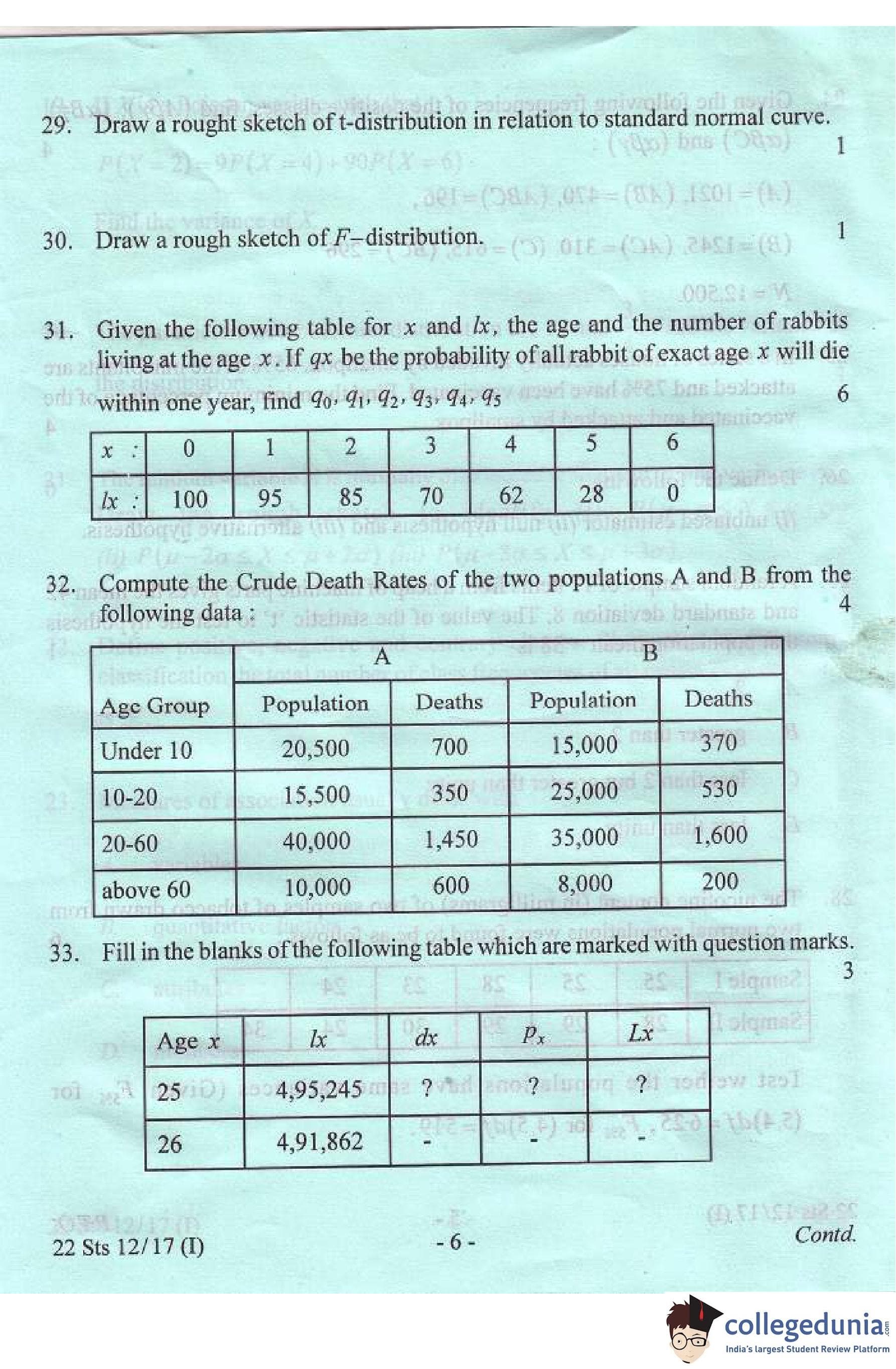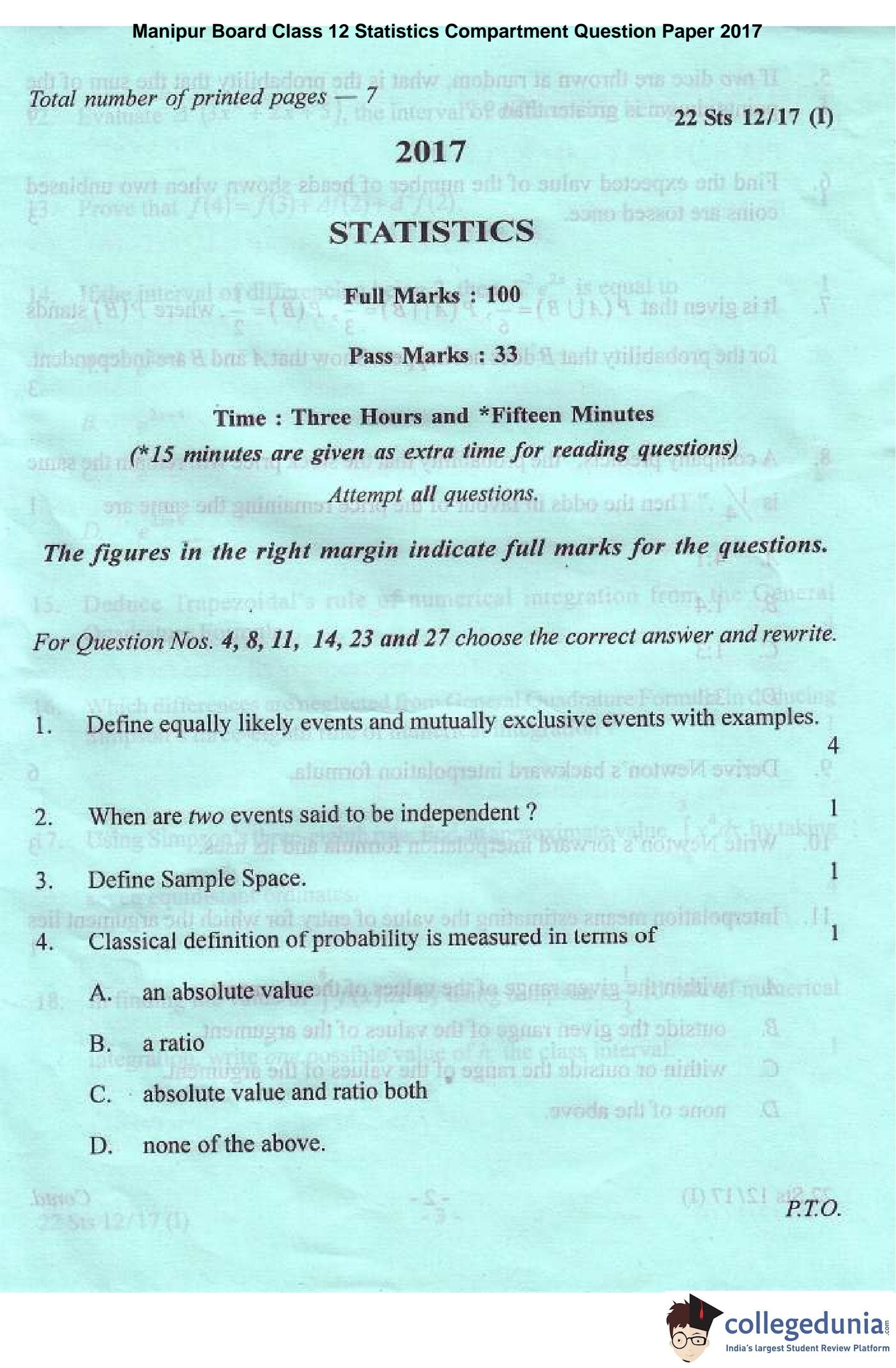 Manipur Board Class 12 Statistics Compartment Question Paper 2017