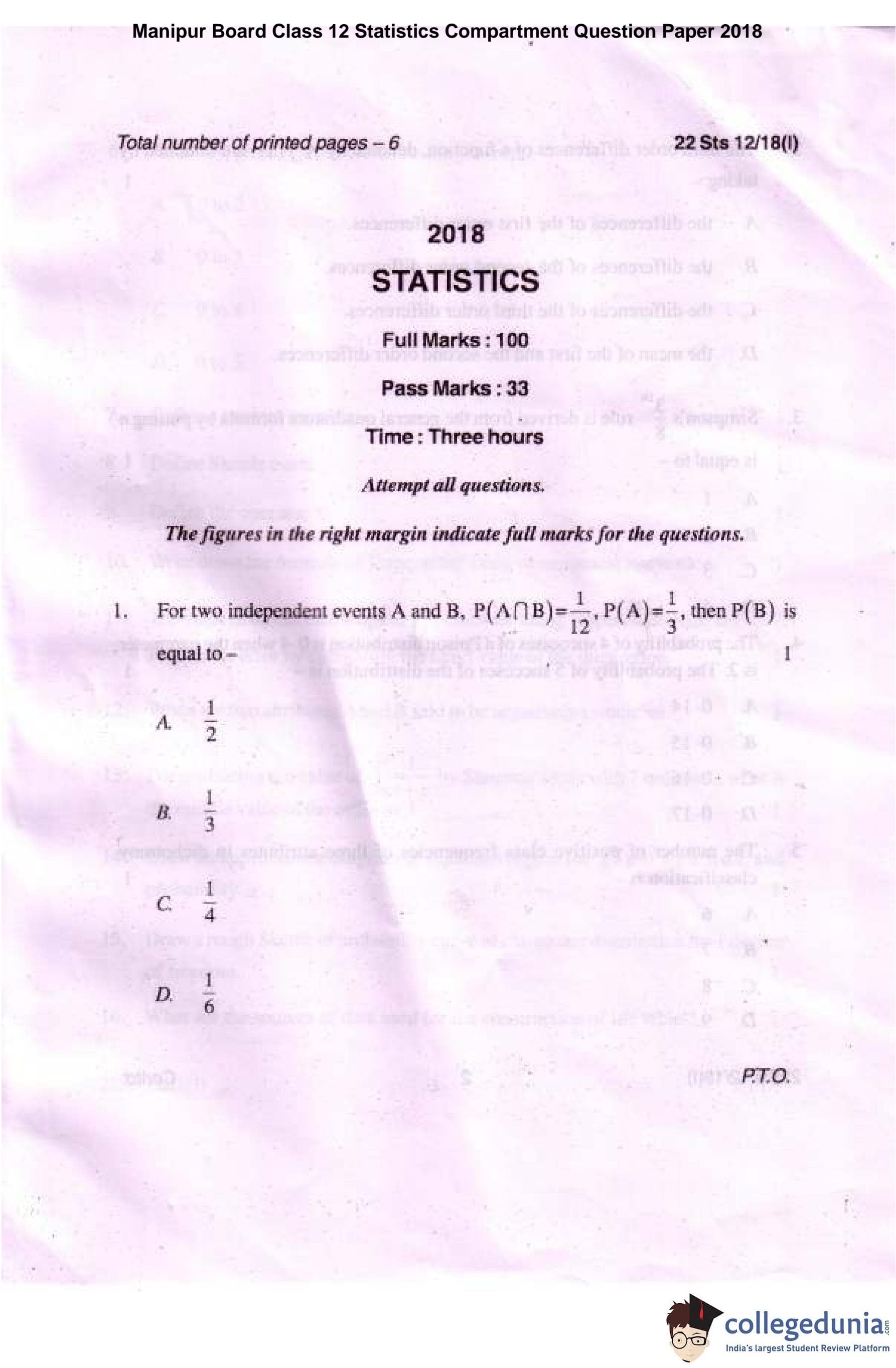 | Manipur Board Class 12 Statistics Compartment Question Paper 2018 PDF | Manipur Board Class 12 Statistics Compartment Answer Key 2018 PDF |