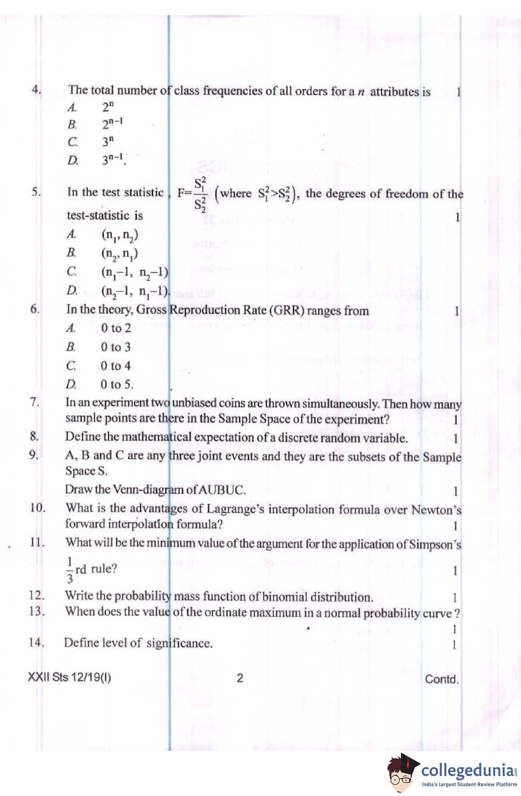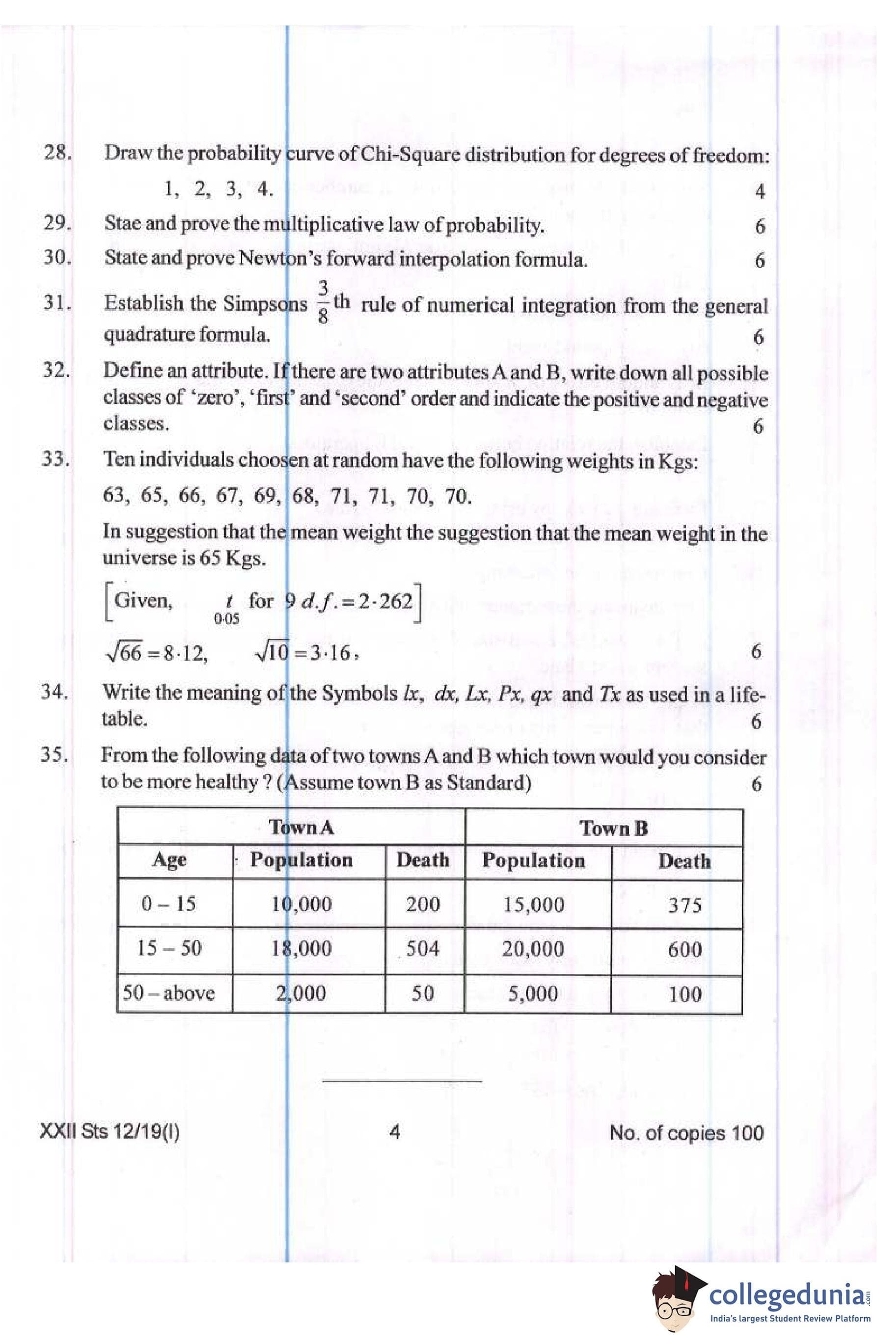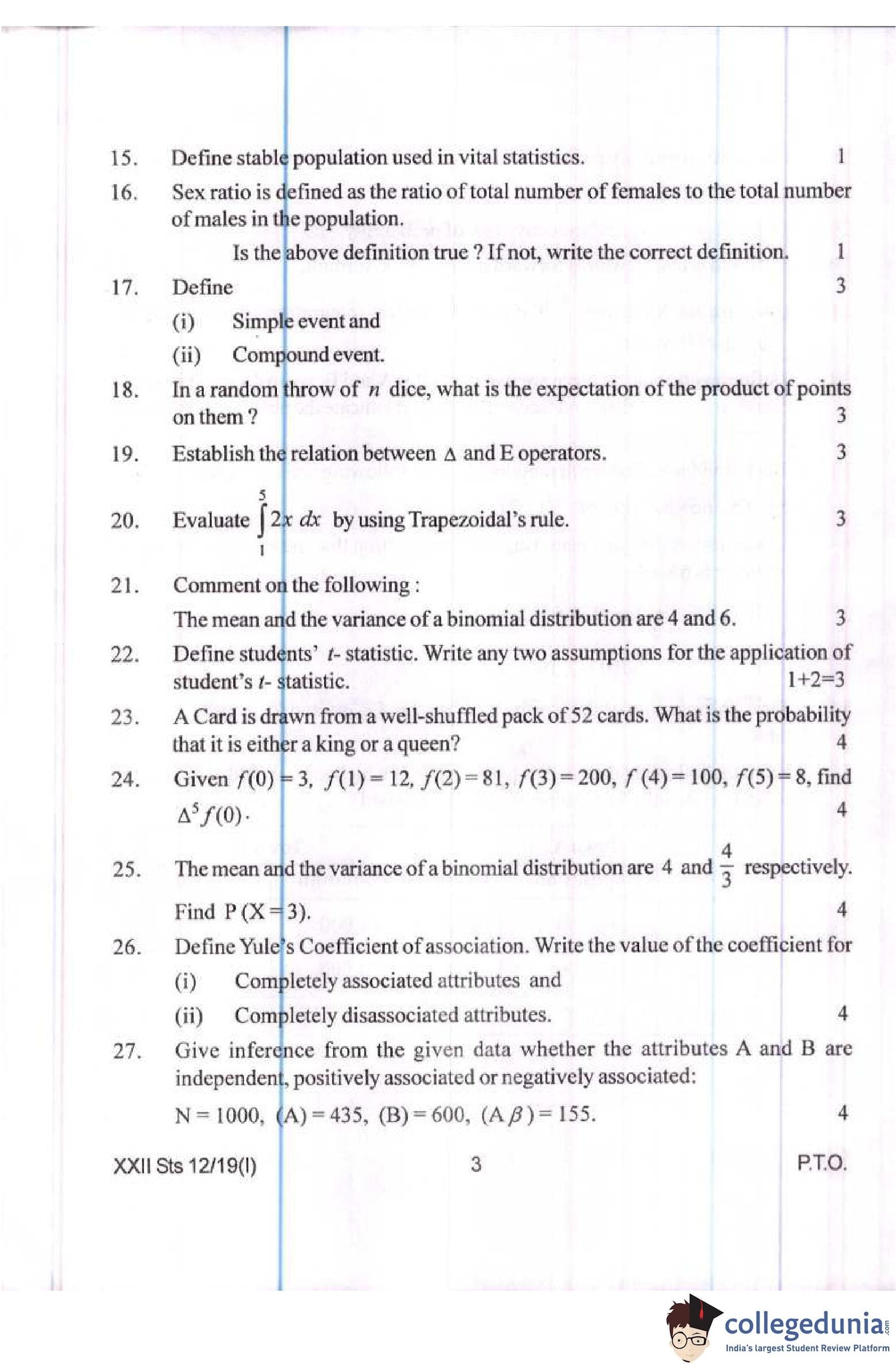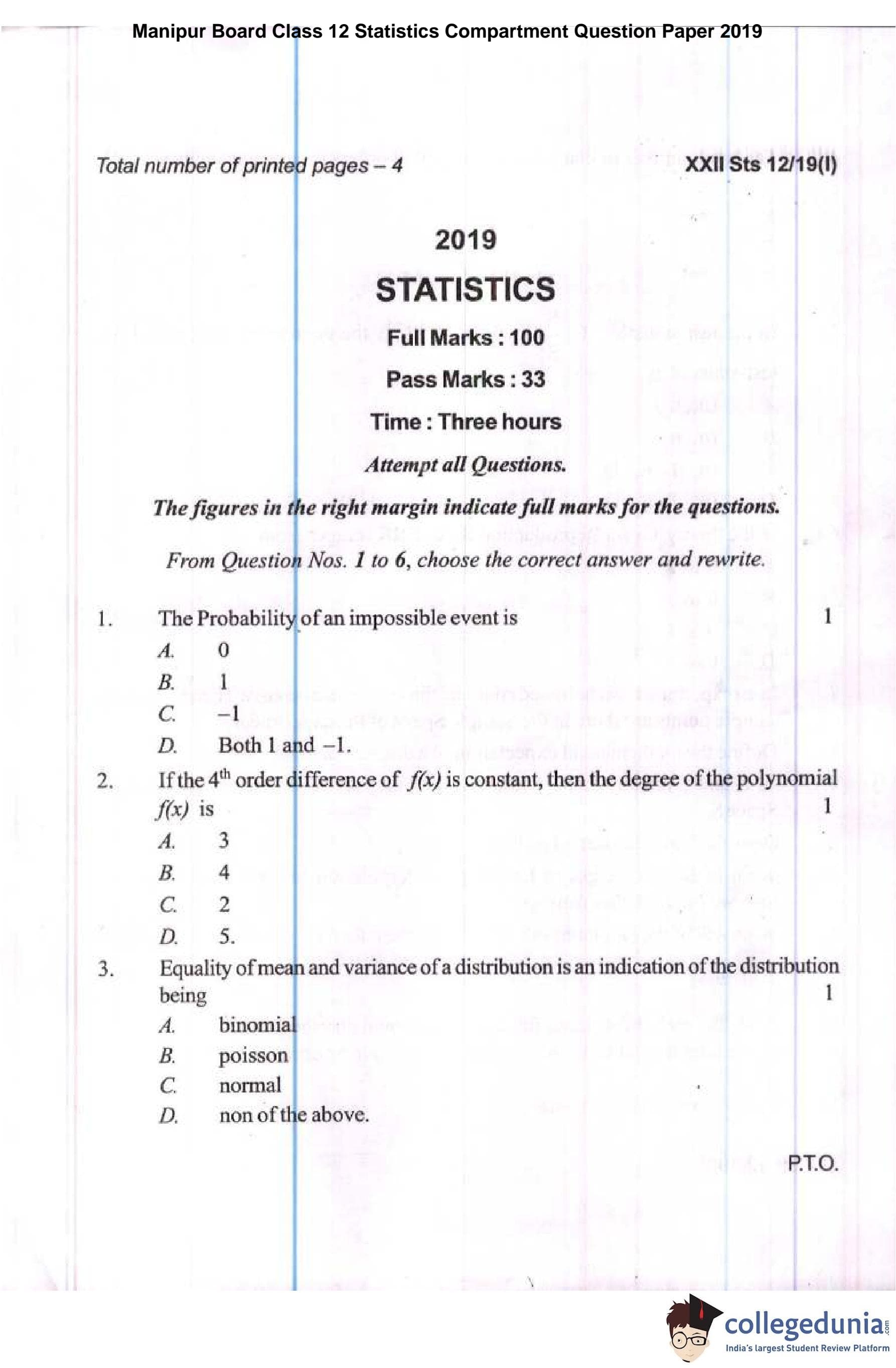 Manipur Board Class 12 Statistics Compartment Question Paper 2019