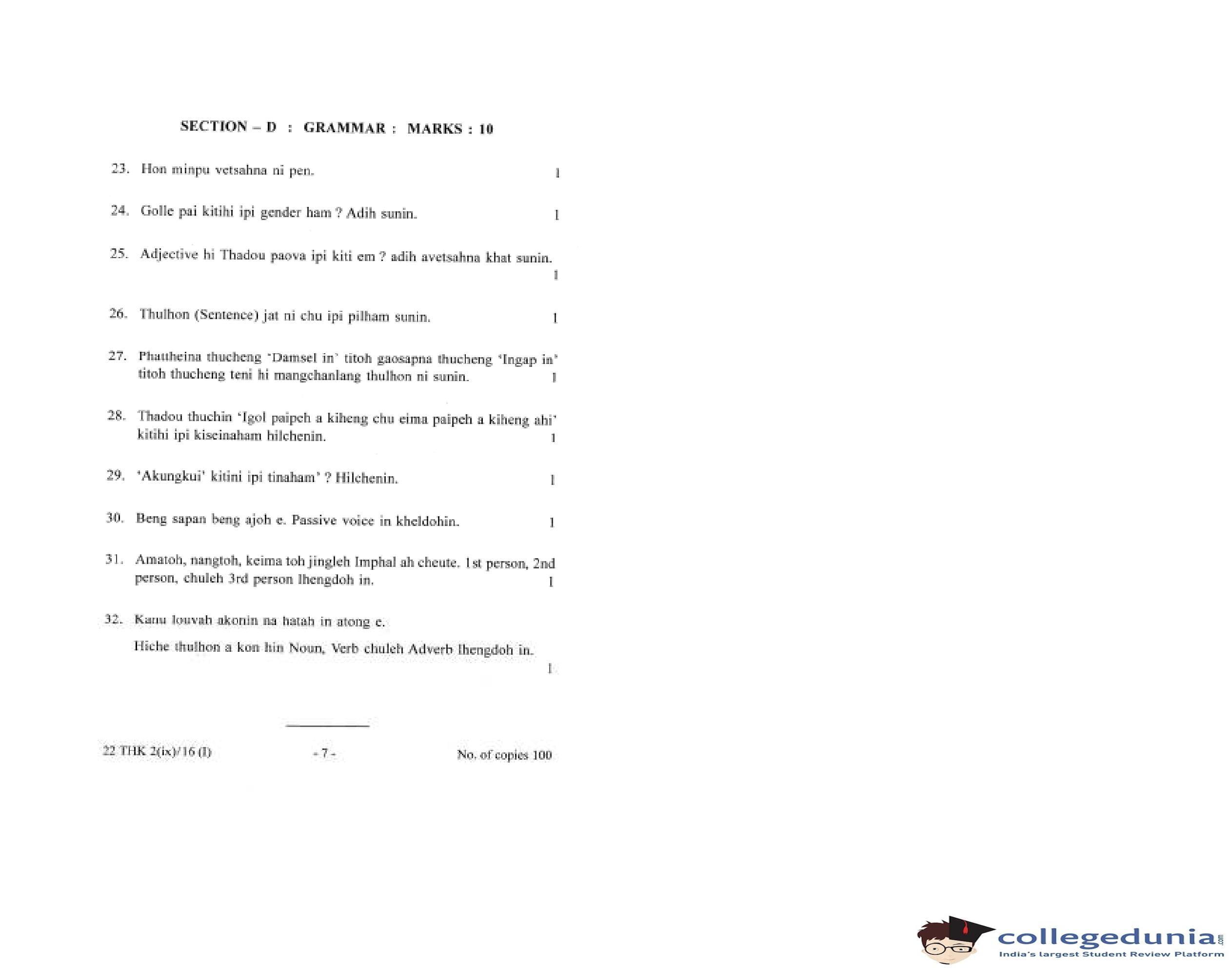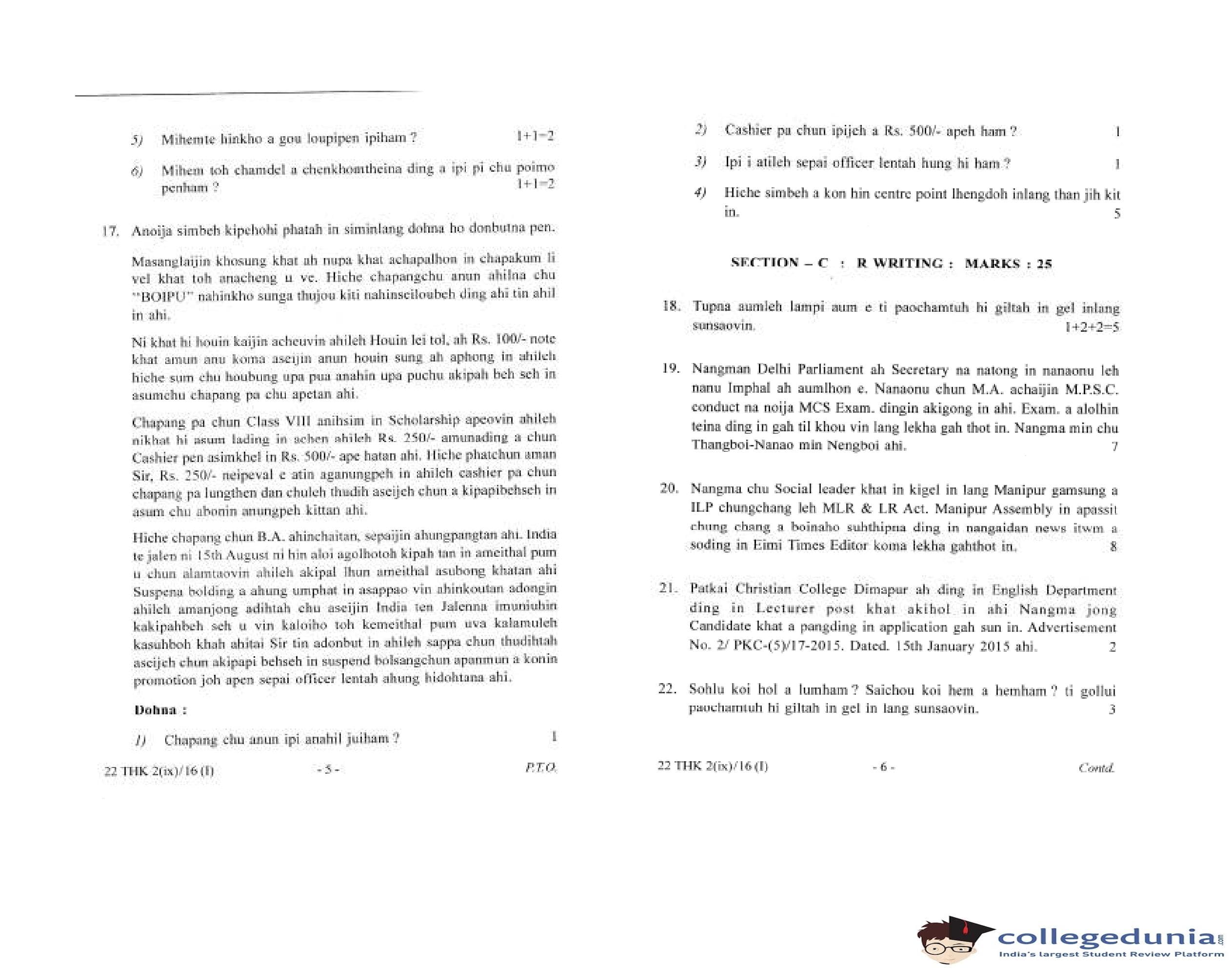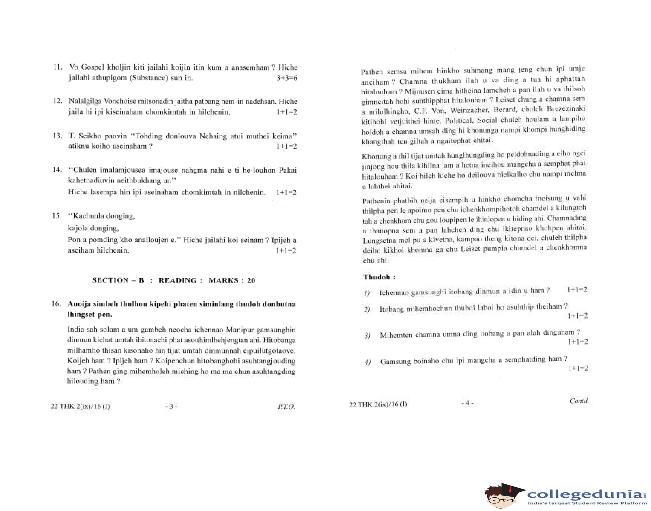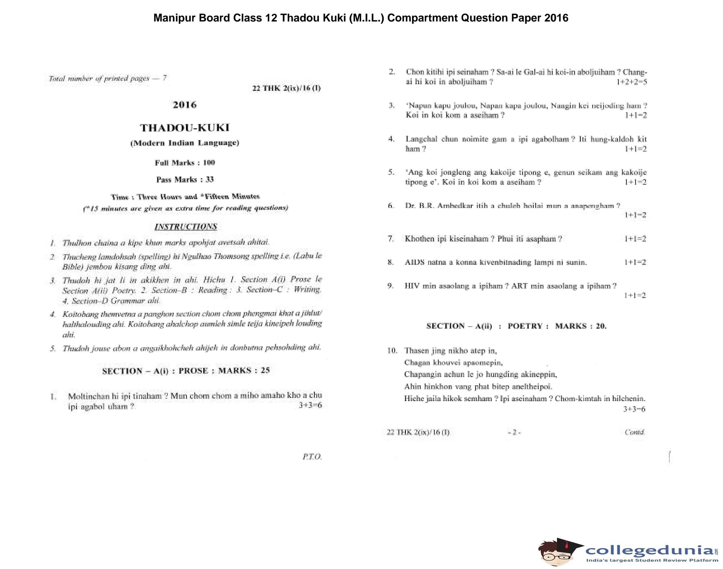 Manipur Board Class 12 Thadou Kuki (M.I.L.) Compartment Question Paper 2016