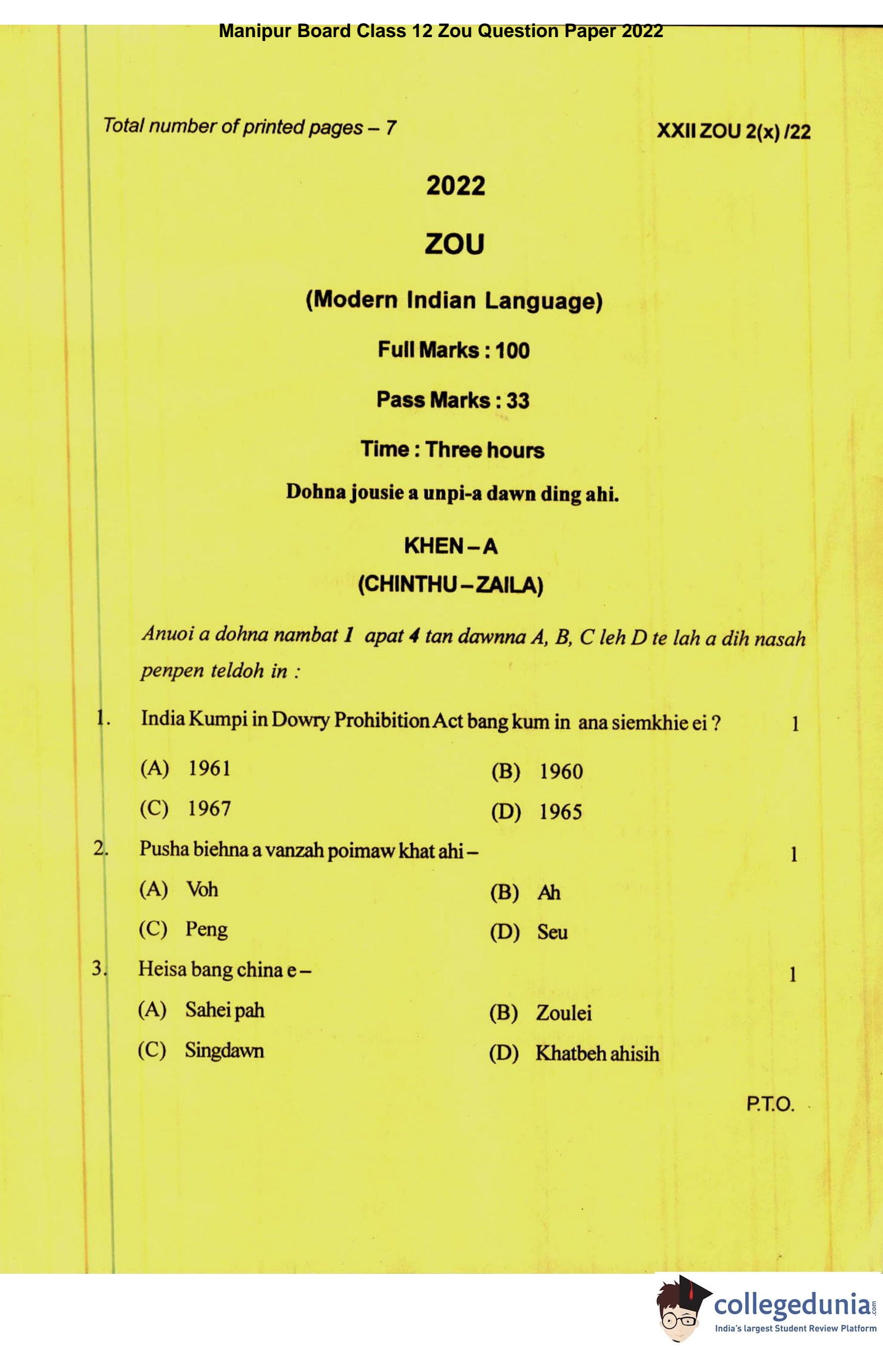 | Manipur Board Class 12 Zou Question Paper 2022 PDF | Manipur Board Class 12 Zou Answer Key 2022 PDF |
