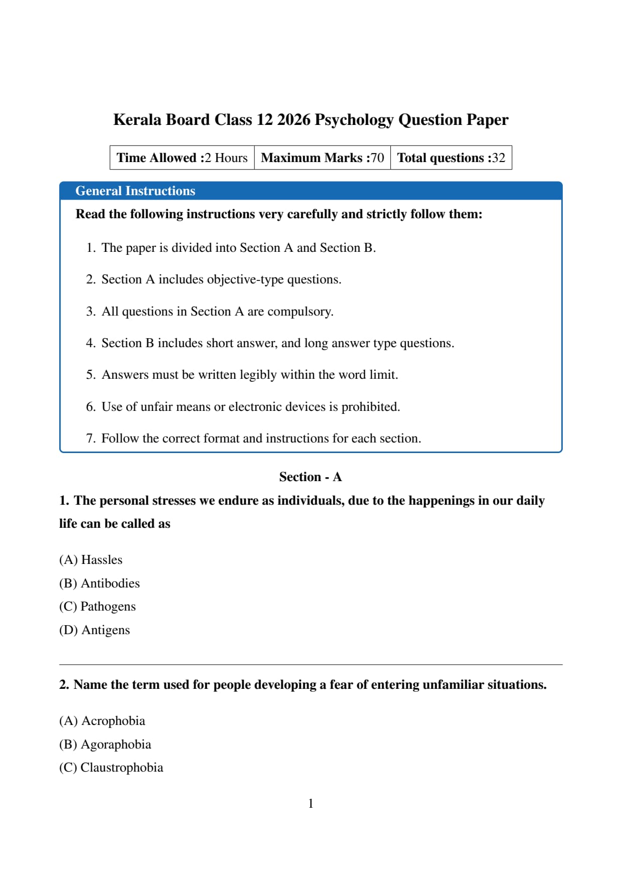 | Kerala Board Class 12 Psychology Question Paper 2026 | Download PDF | Check Solution |