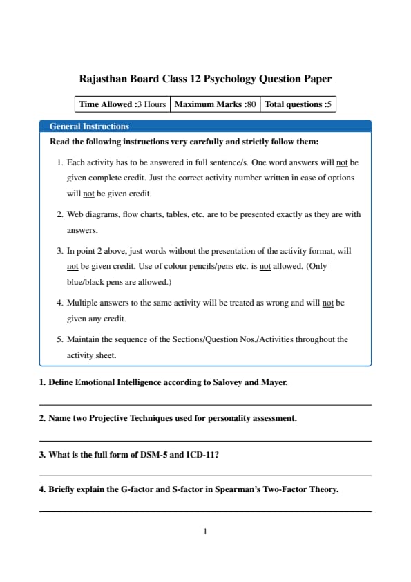 | Rajasthan Board 2026 Class 12 Psychology Question Paper with Solution PDF | Download | Check Solutions |