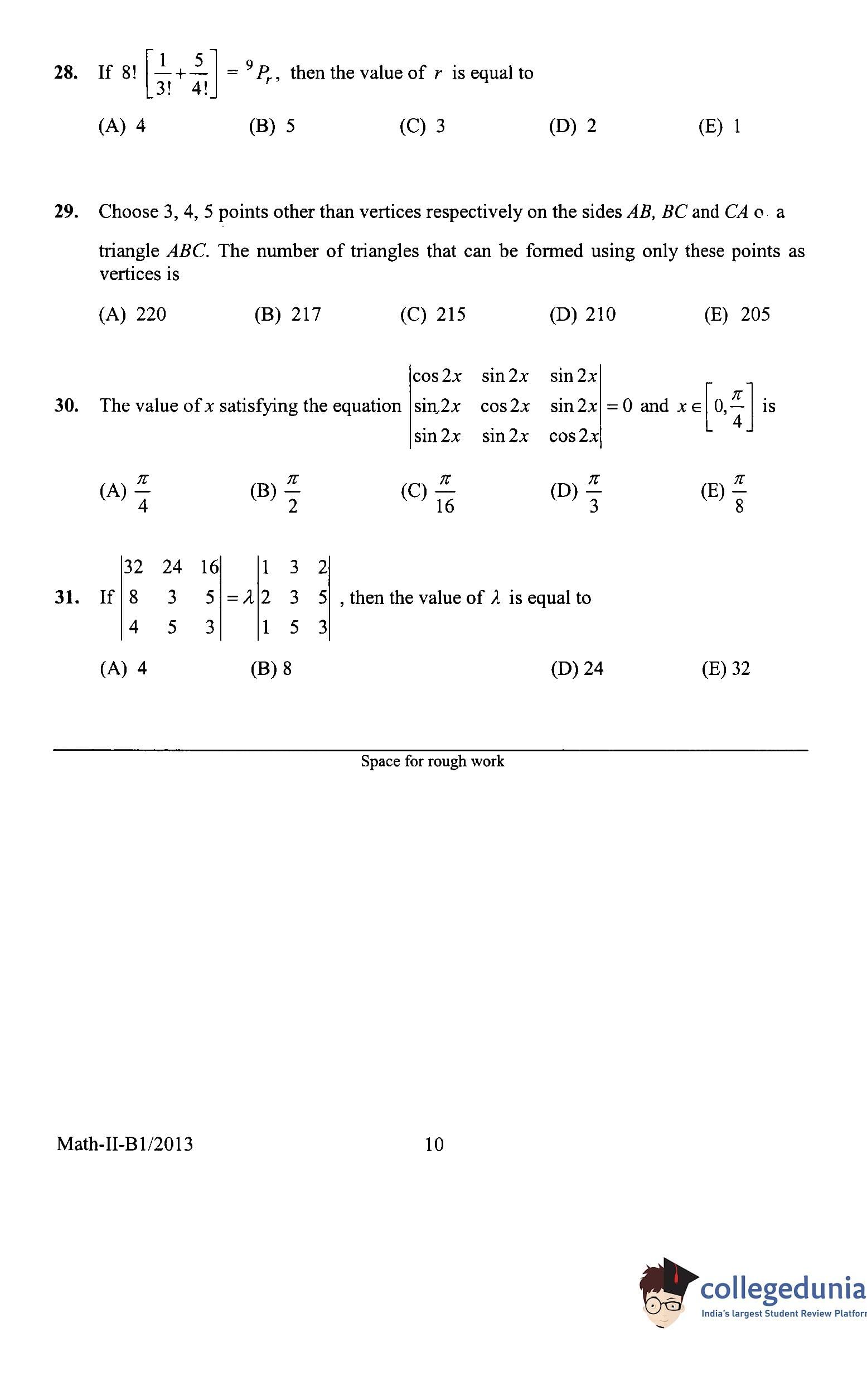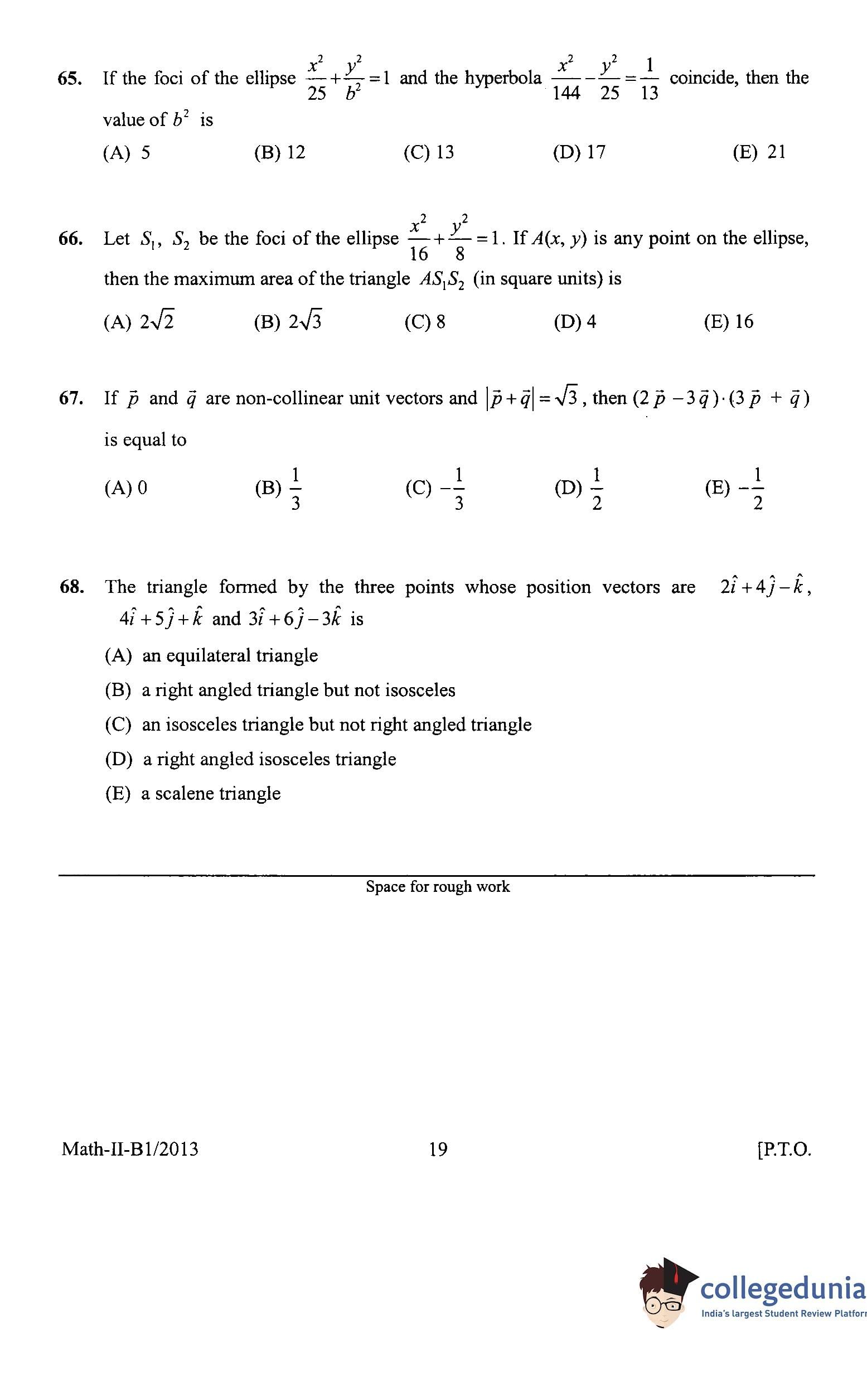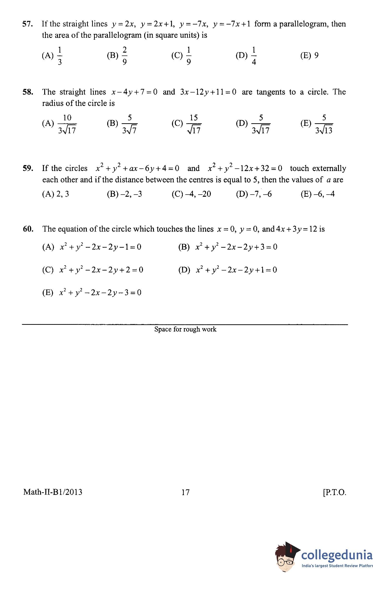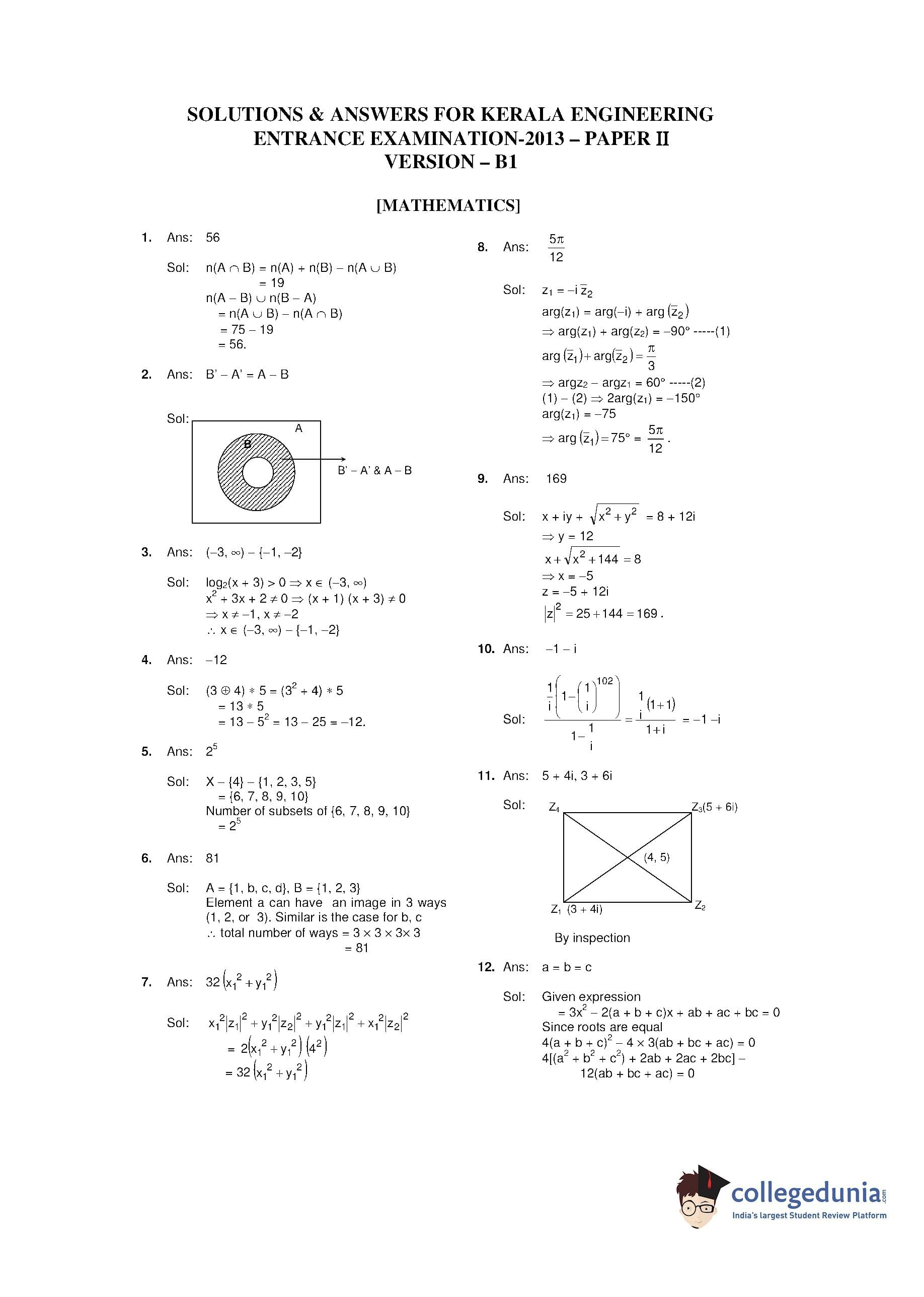 KEAM 2013 Mathematics Question Paper with Answer Key pdf is available for download. The exam was conducted by Commissioner of Entrance Examination (CEE) on April 23, 2013 in the Morning Session 10 AM to 12:30 PM. The question paper comprised a total of 120 questions.