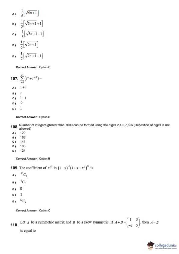Quick Tip: The sum of two inverse cotangents can be simplified using the identity: \[ \cot^{-1}(a) + \cot^{-1}(b) = \cot^{-1}\left(\frac{ab - 1}{a + b}\right). \] This identity is helpful when simplifying expressions involving inverse trigonometric functions.