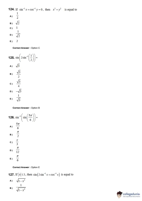 Therefore, the value of \( \cot^{-1}\left(\frac{x}{y}\right) + \cot^{-1}\left(\frac{y}{x}\right) \) is \( \frac{\pi}{2} \). Thus, the correct answer is option (B).