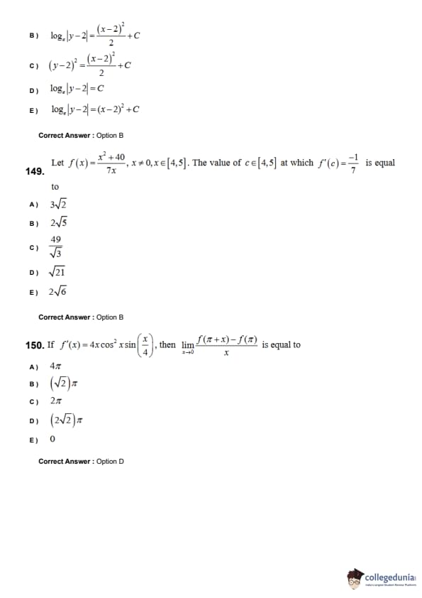 Let \( f(x) = \frac{x^2 + 40}{7x} \), \( x \neq 0 \), \( x \in [4,5] \). The value of \( c \) in \( [4,5] \) at which \( f'(c) = -\frac{1}{7} \) is equal to: