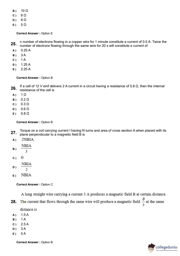 n number of electrons flowing in a copper wire for 1 minute constitute a current of 0.5 A. Twice the number of electrons flowing through the same wire for 20 s will constitute a current of: