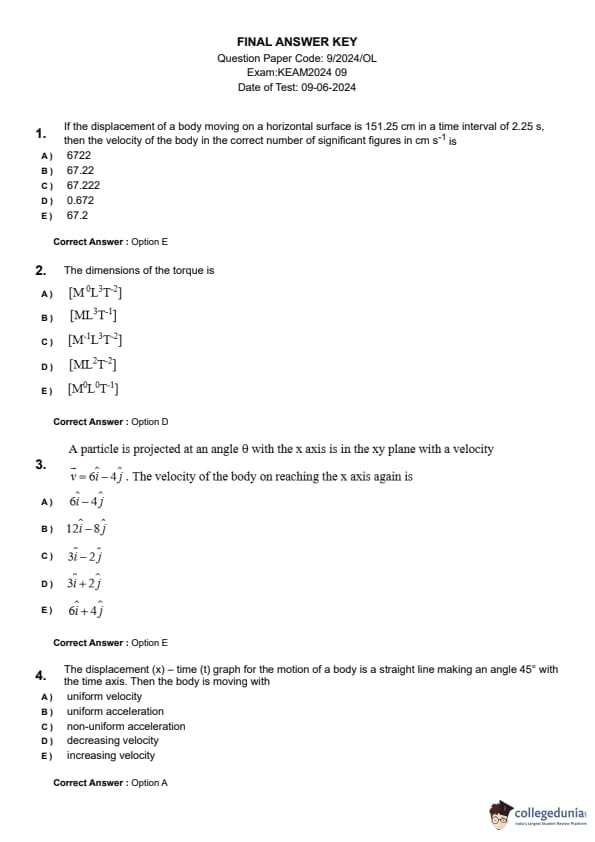 | KEAM 2024 (June 9) Question Paper with Answer Key | Check Solution |