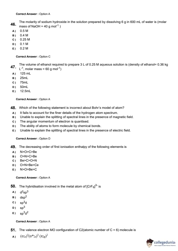 The molarity of sodium hydroxide in the solution prepared by dissolving 6 g in 600 mL of water is (molar mass of NaOH = 40 g mol\(^{-1}\)):