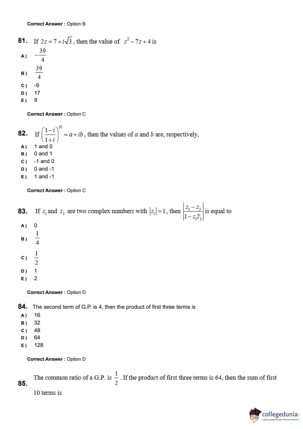 If \( 2z = 7 + i\sqrt{3} \), then the value of \( z^2 - 7z + 4 \) is: