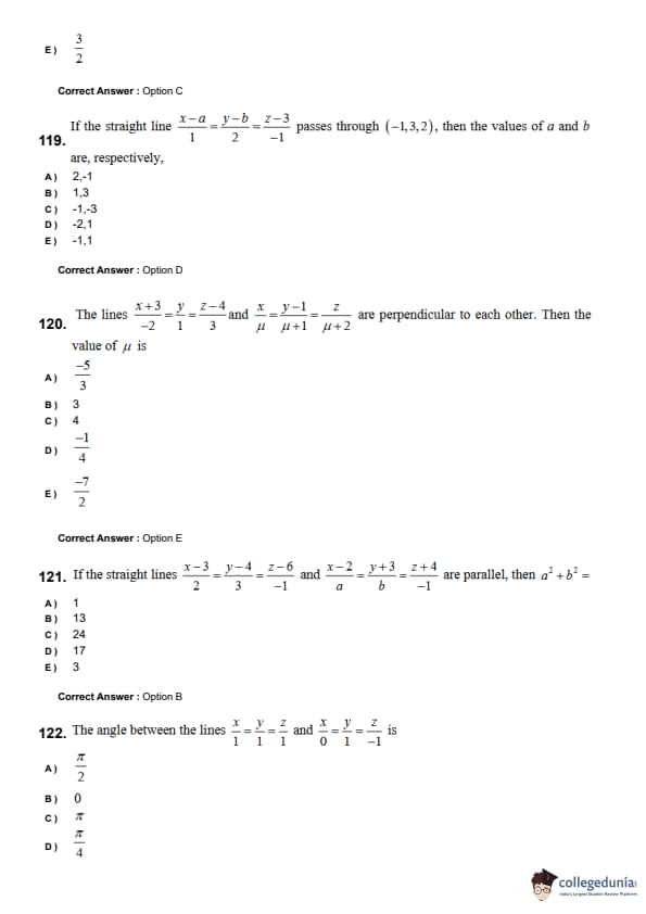 If the straight lines \( \frac{x - 3}{2} = \frac{y - 4}{3} = \frac{z - 6}{-1} \) and \( \frac{x - 2}{a} = \frac{y + 3}{b} = \frac{z + 4}{-1} \) are parallel, then \( a^2 + b^2 \) is: