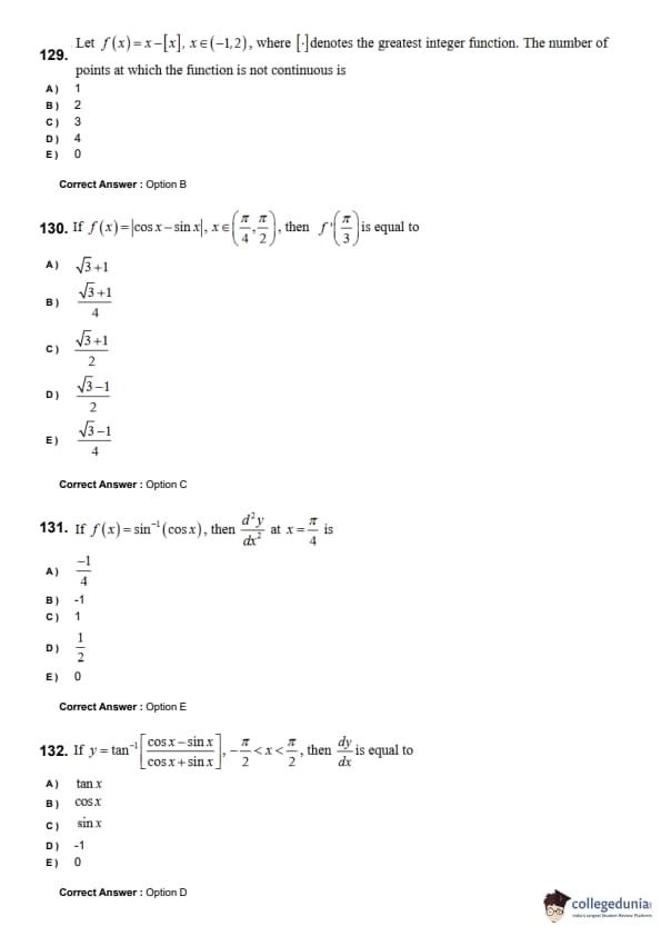 If \( f(x) = \sin^{-1}(\cos x) \), then \( \frac{d^2 y}{dx^2} \) at \( x = \frac{\pi}{4} \) is: