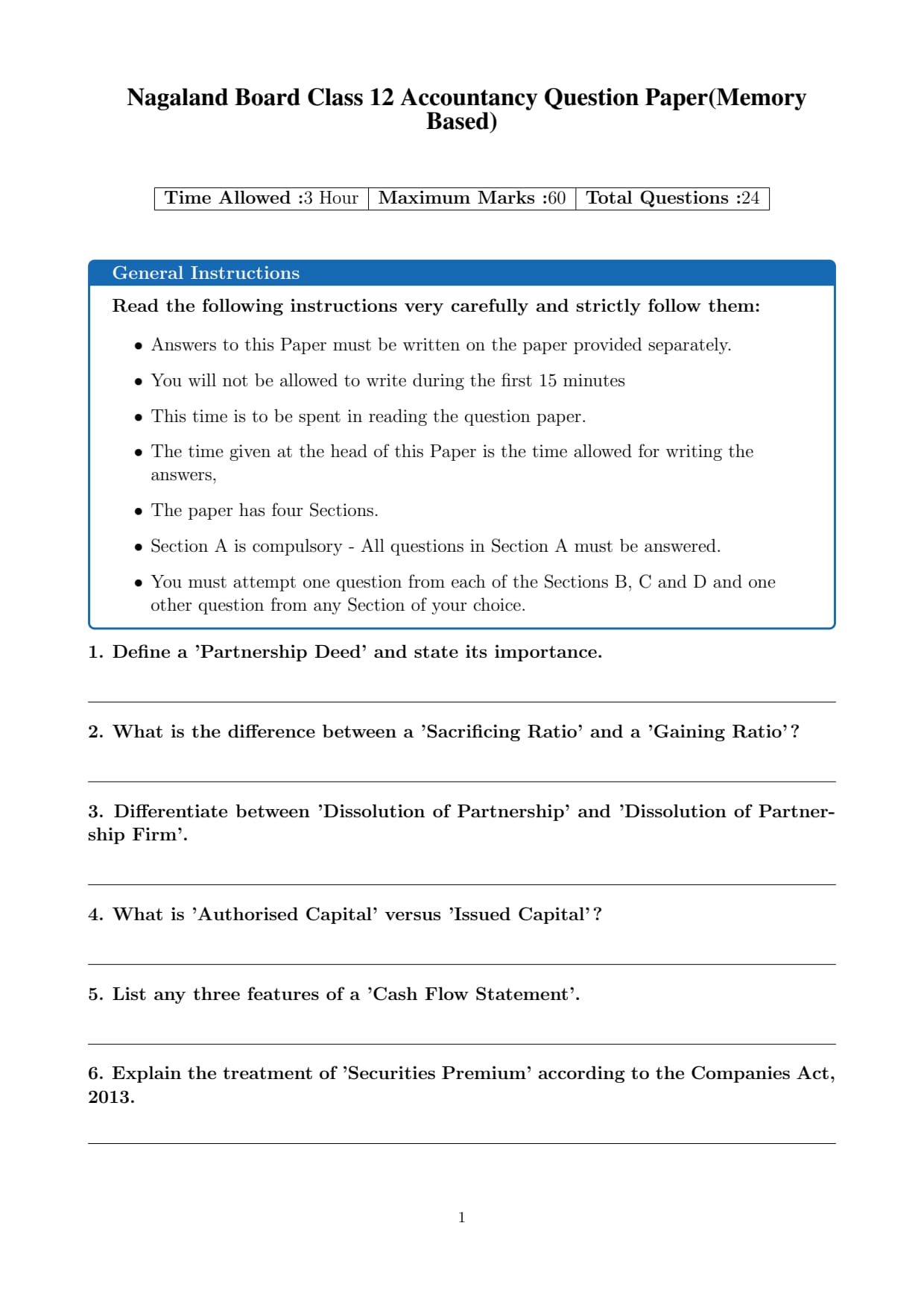 | Nagaland Board Class 12 2026 Accountancy Question Paper with Solution PDF | Download PDF | Check Solutions |