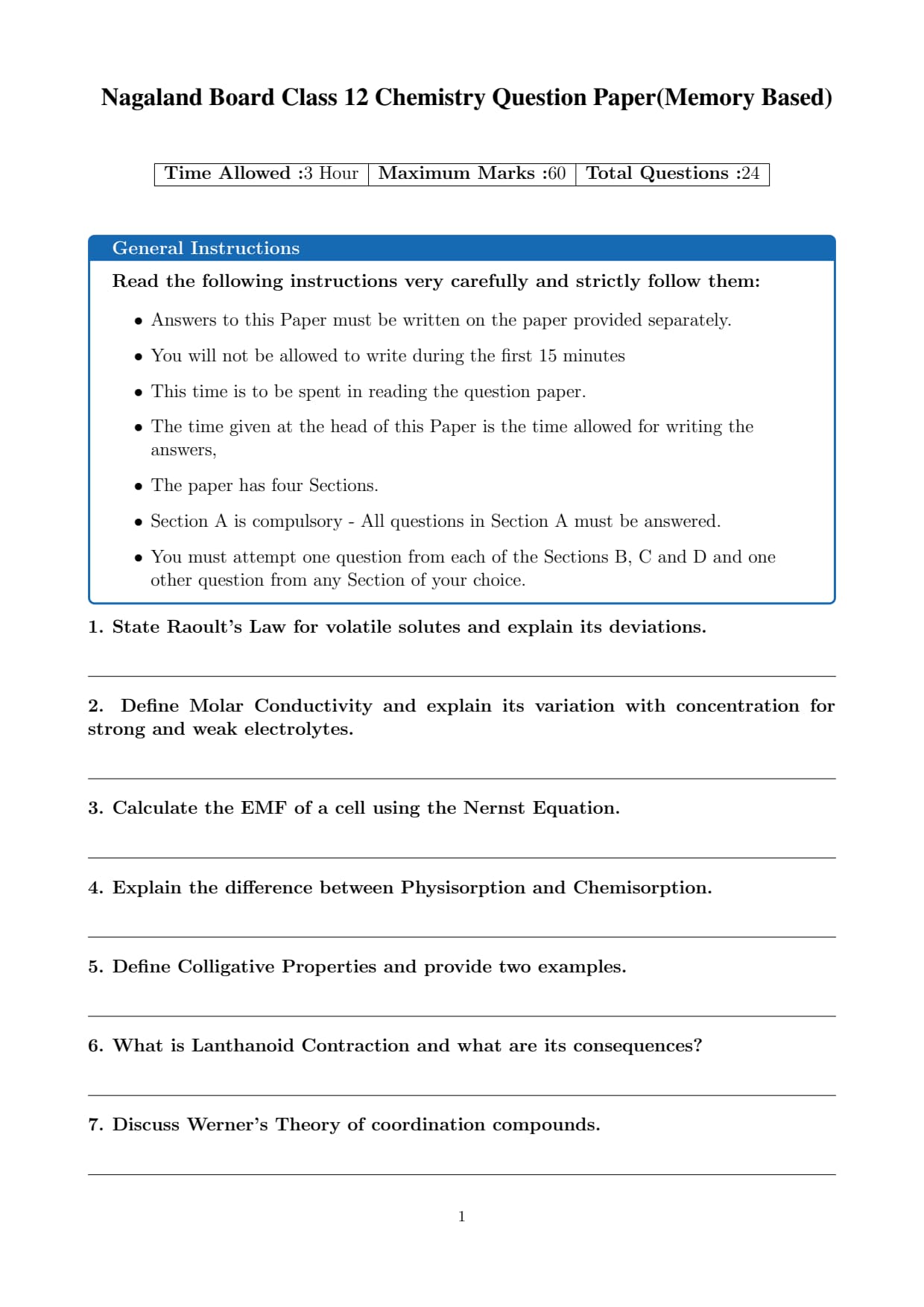 The official question paper of Nagaland Board Class 12 Chemistry Board Exam 2026 is provided below. Students can download the official paper in PDF format for reference.