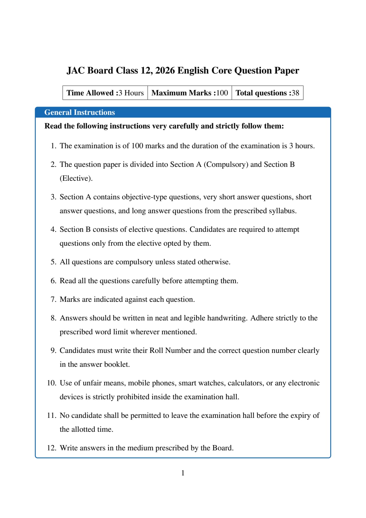 | JAC Board Class 12, 2026 English Core Question Paper | Check Solutions |