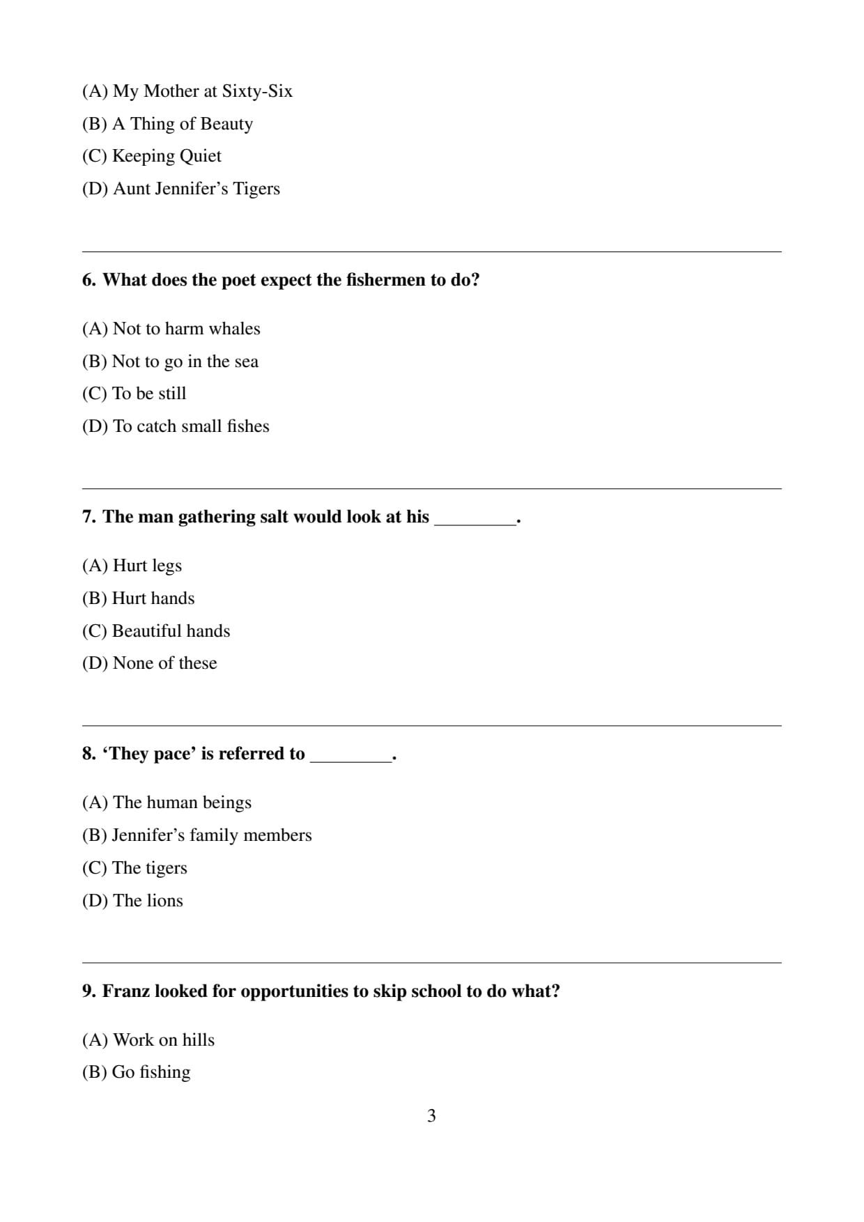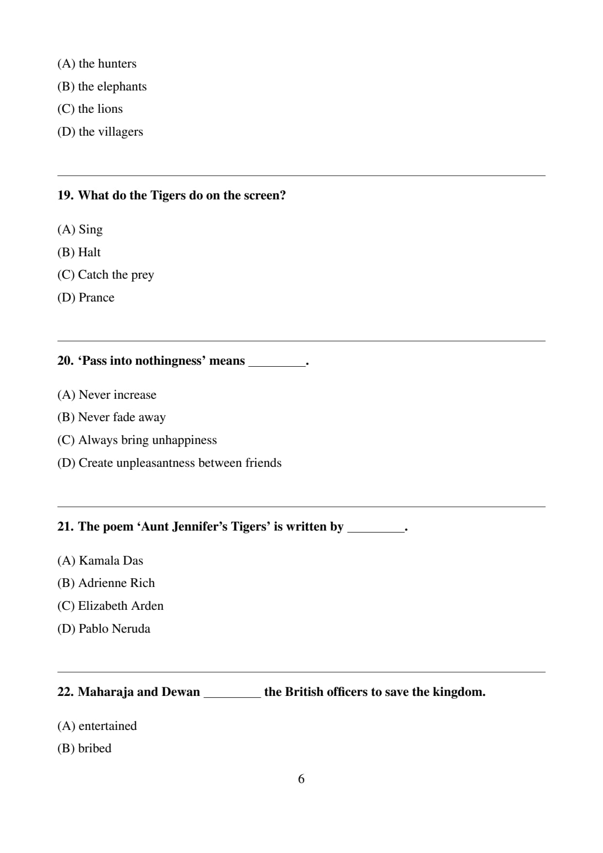 Final Answer: \[ \boxed{(C) \, The tigers} \] Quick Tip: In “Aunt Jennifer’s Tigers,” the tigers symbolize courage and freedom, contrasting with Aunt Jennifer’s oppressed life.
