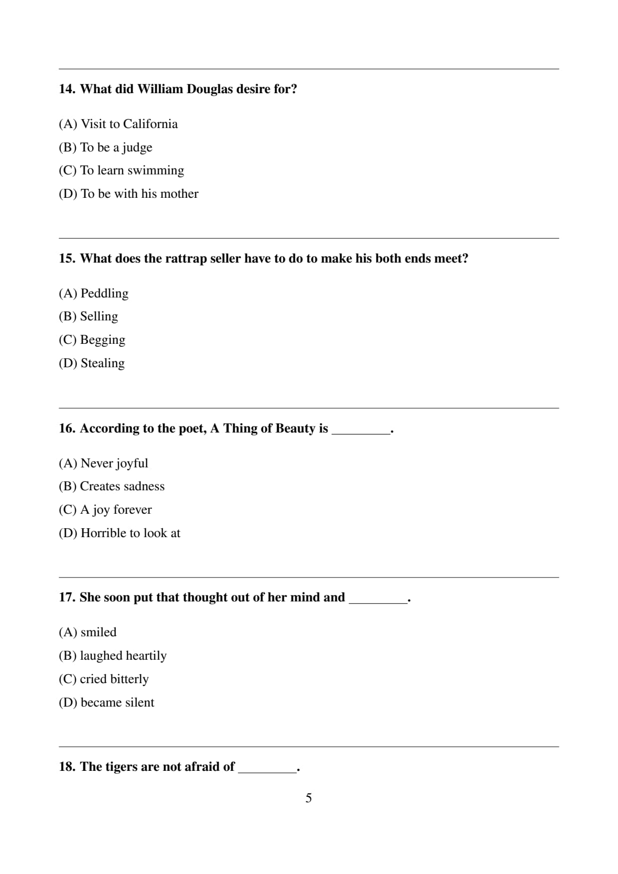 Final Answer: \[ \boxed{(D) \, Some shape of beauty} \] Quick Tip: In “A Thing of Beauty,” John Keats emphasizes that beauty removes sadness and fills life with hope and joy.