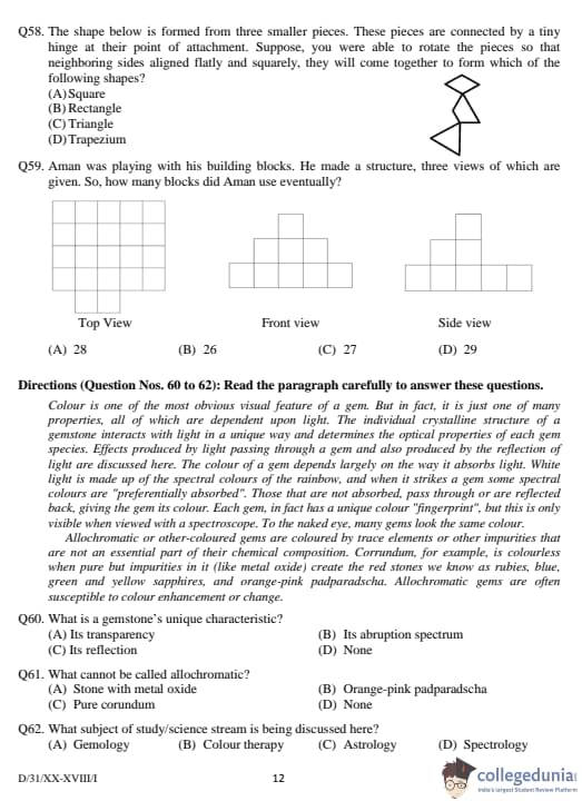 NID 2018 B.Des Question paper with answer key pdf conducted on January 7, 2018 is available for download. The exam was successfully organized by National Institute of Design (NID). In terms of difficulty level, NID was of Easy to Moderate level. The question paper comprised a total of 67 questions.